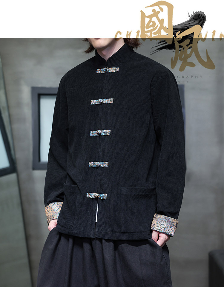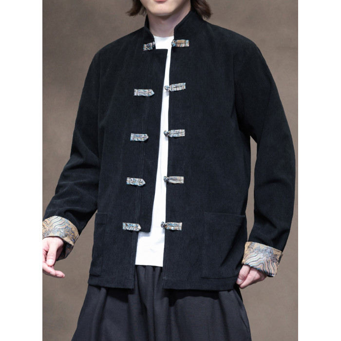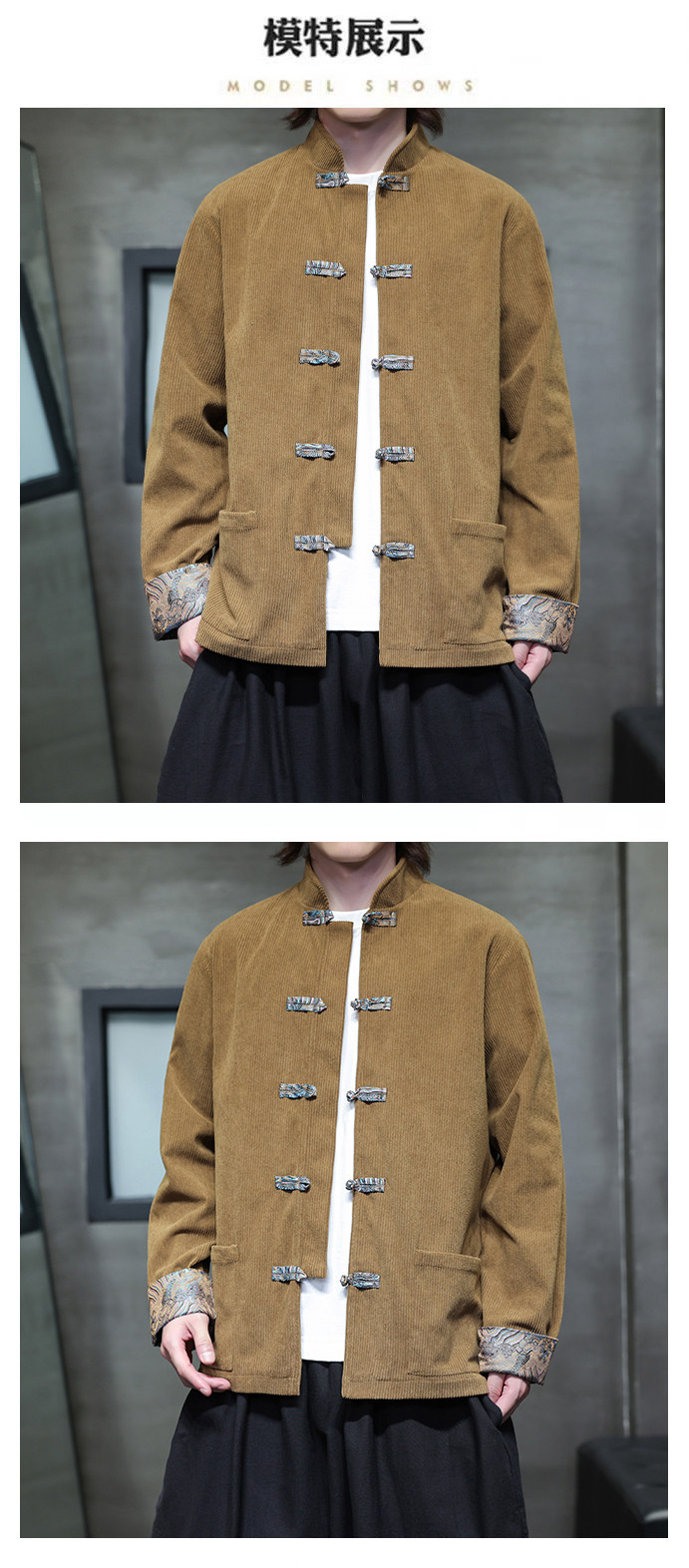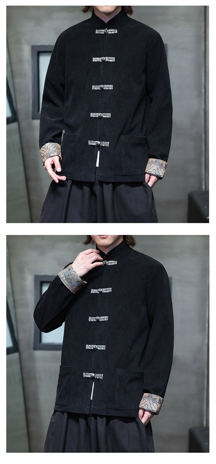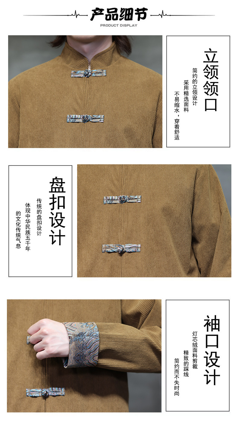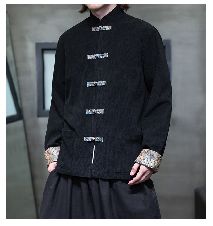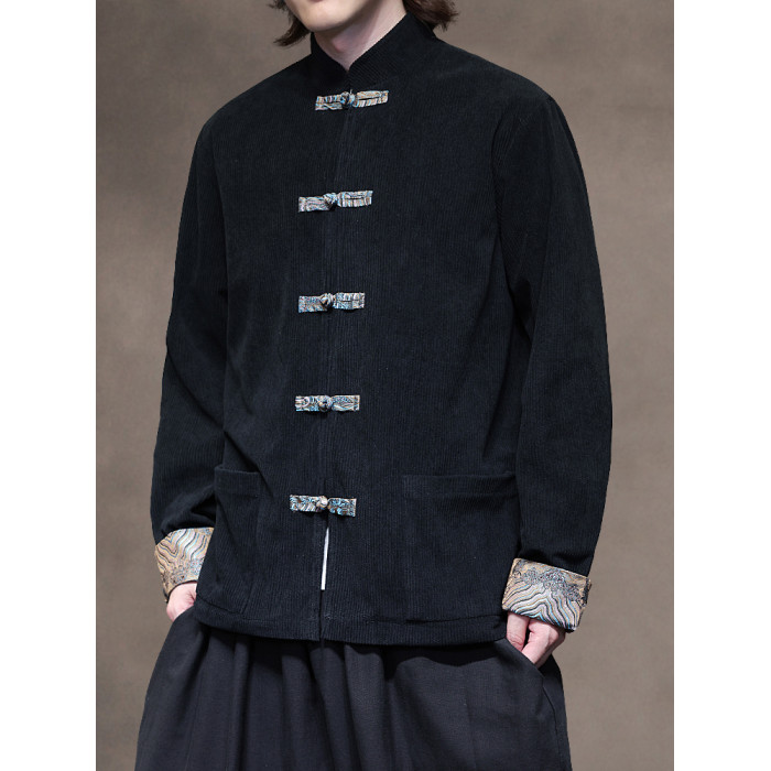 新中式秋冬休閒燈芯絨唐裝外套風復古拼色對襟盤釦中山裝上衣