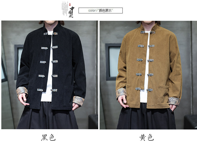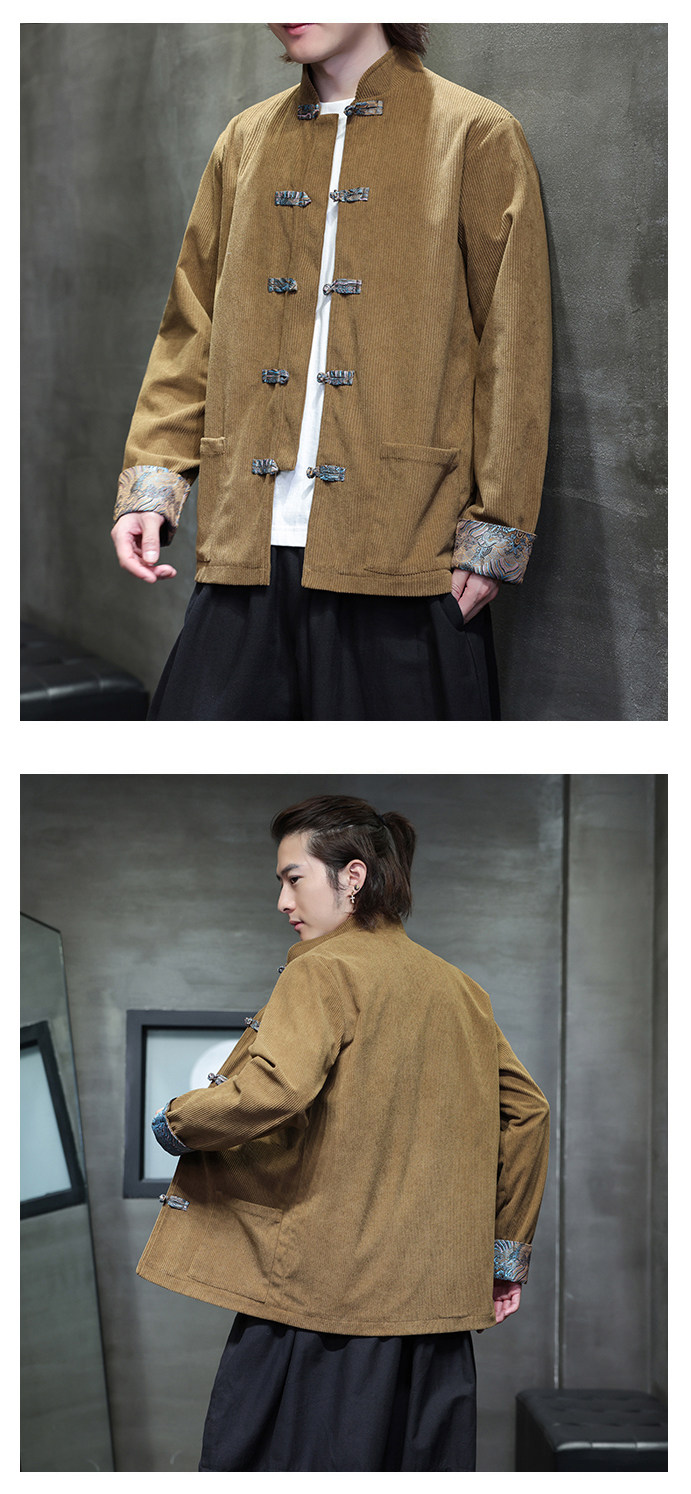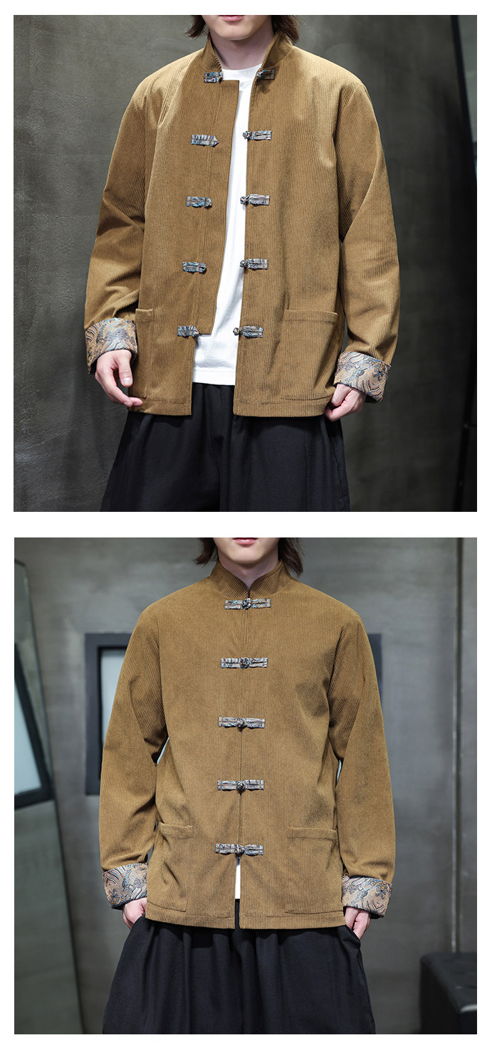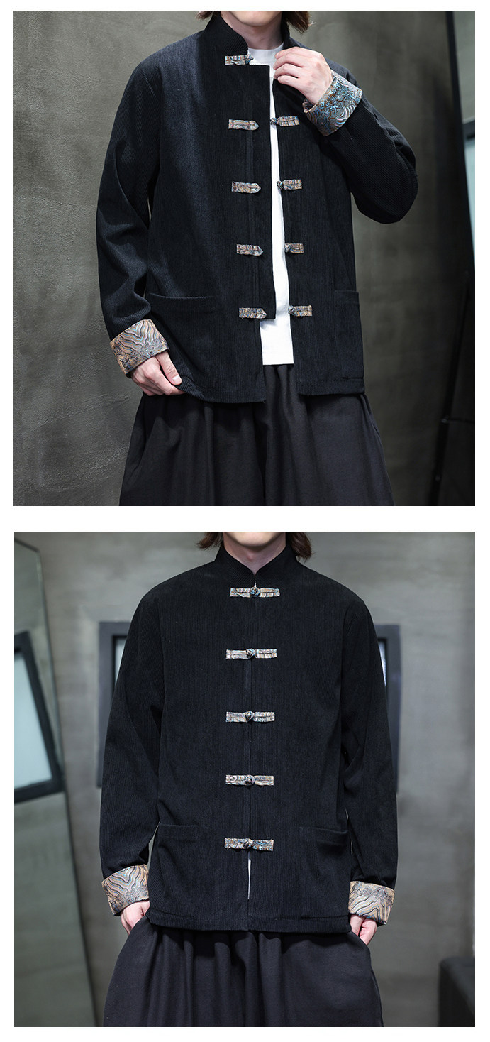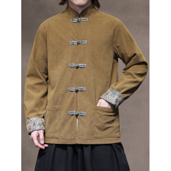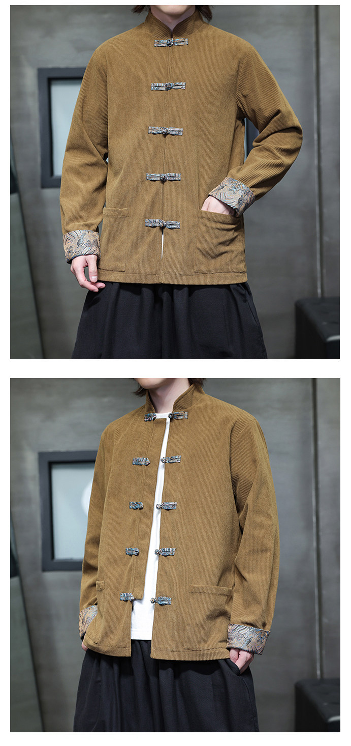 新中式秋冬休閒燈芯絨唐裝外套風復古拼色對襟盤釦中山裝上衣