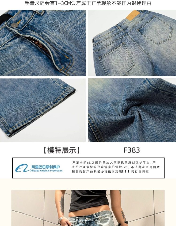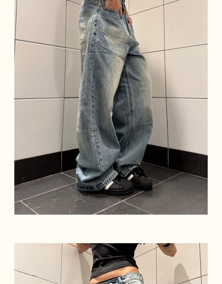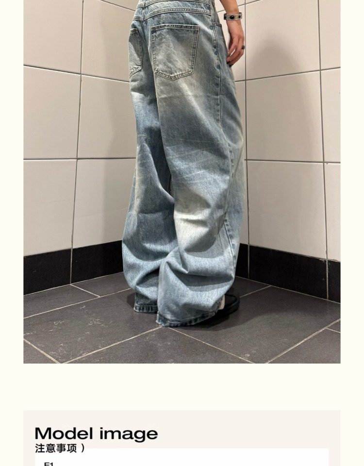 F383 美式復古貓須漸變直筒牛仔褲男女寬鬆百搭休閒濶腿拖地長褲