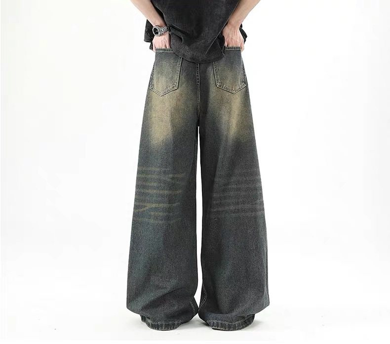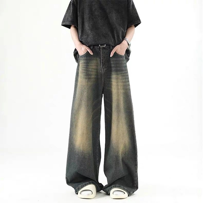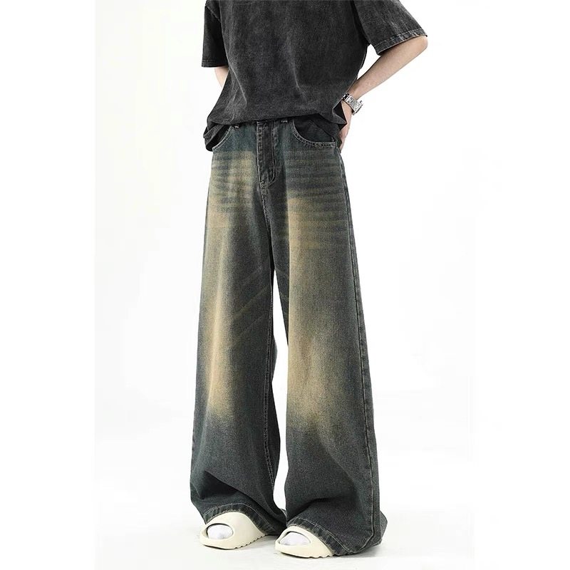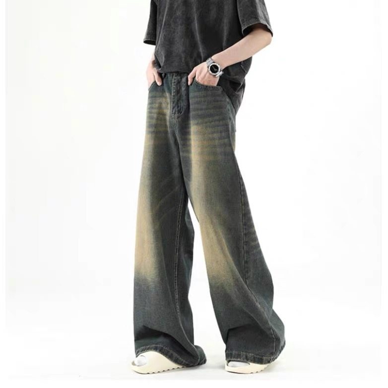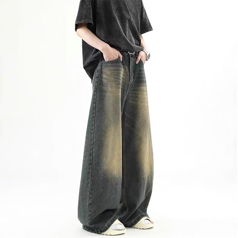 美式復古做舊牛仔褲男款cleanfit高街寬鬆直筒濶腿拖地百搭長褲子