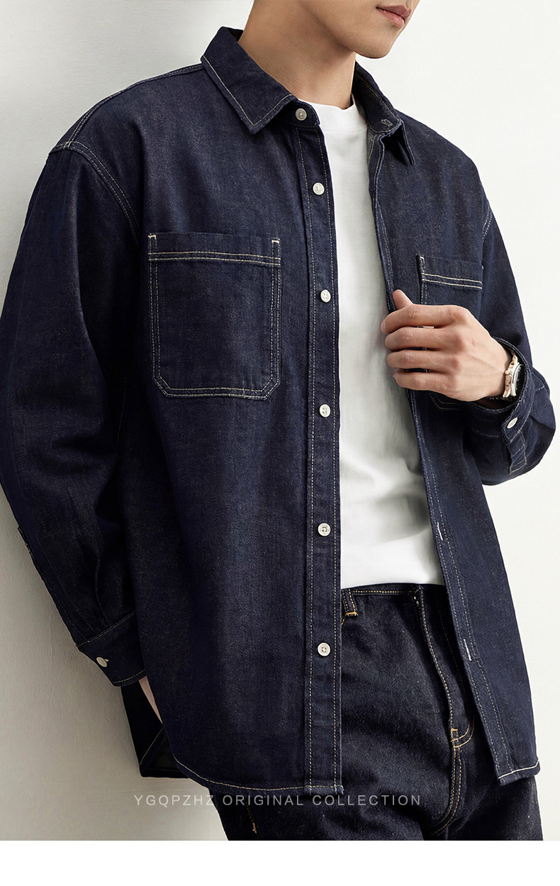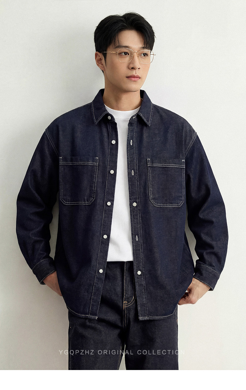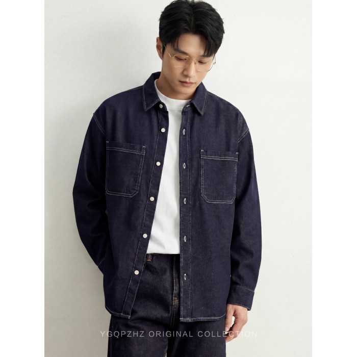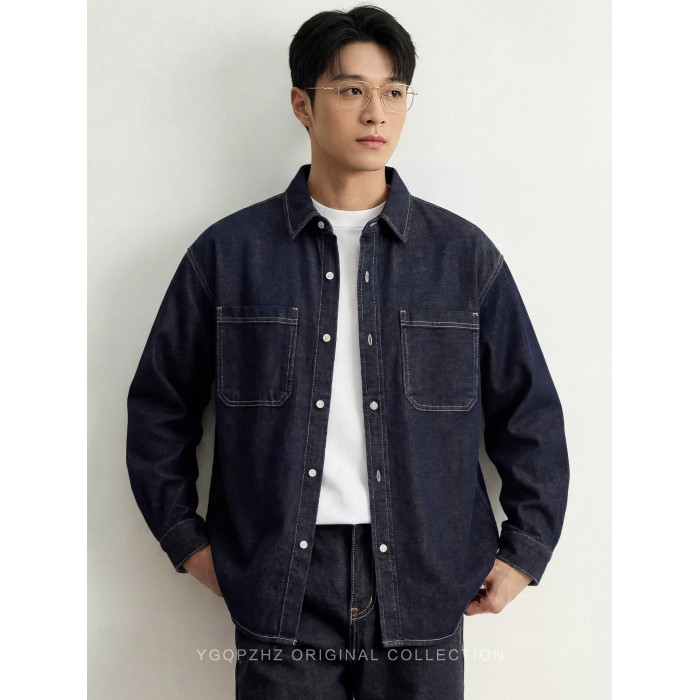 專櫃萊賽爾亞麻混紡丹甯水洗牛仔襯衫男士春季新款休閒長袖襯衣男