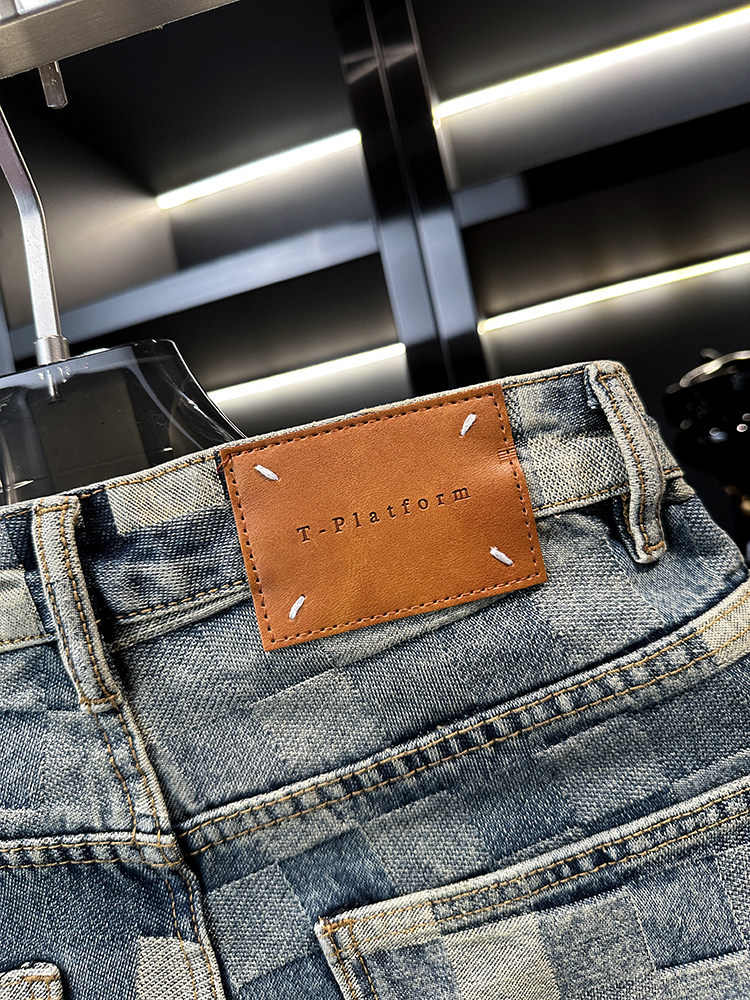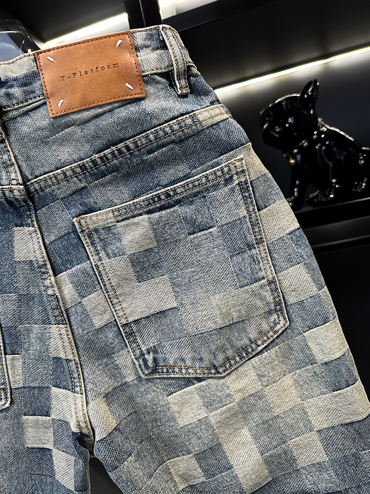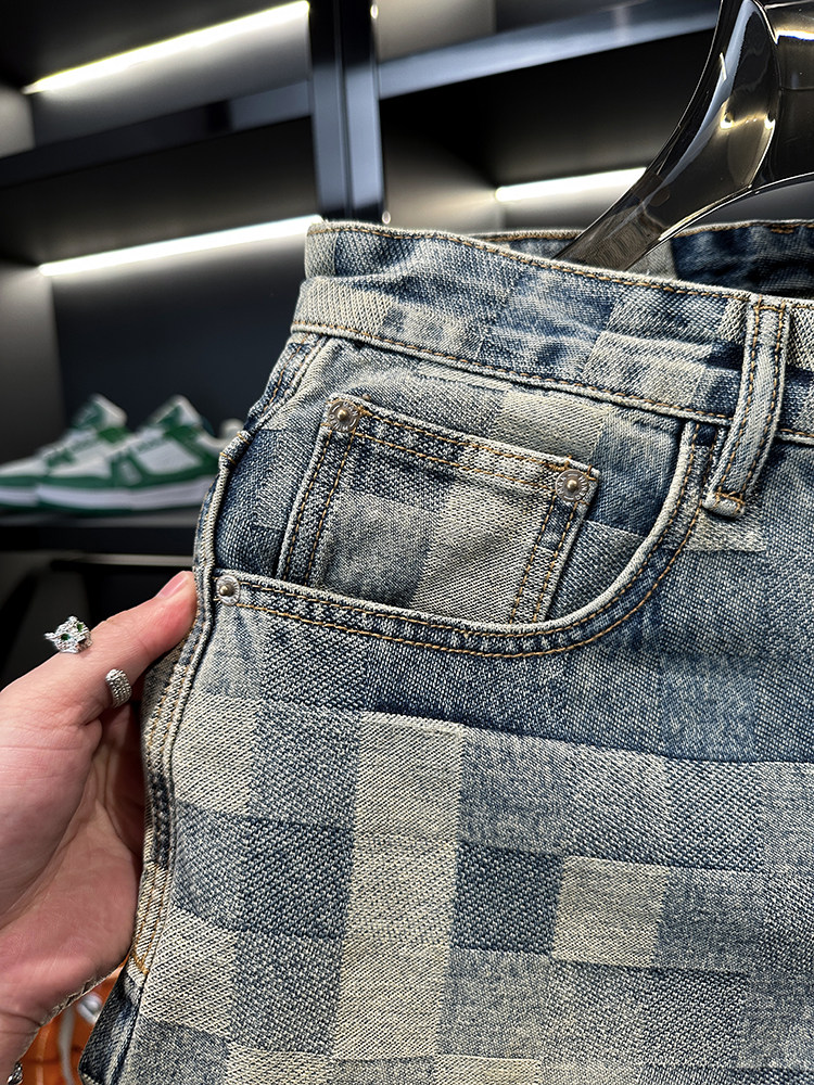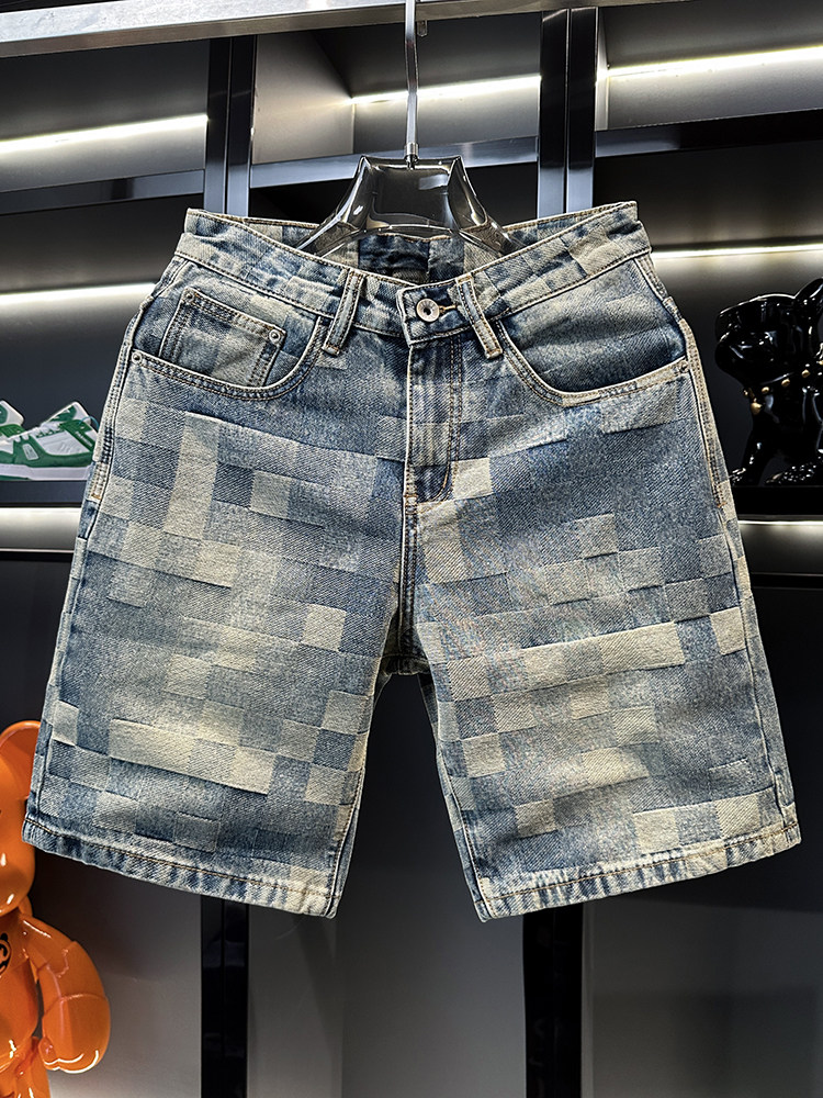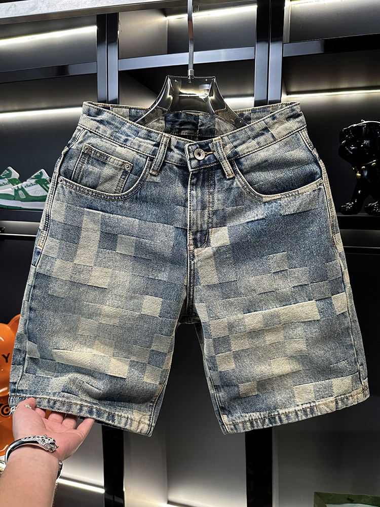 高街風格子牛仔短褲男夏季薄款五分褲2025新款男士直筒半截褲
