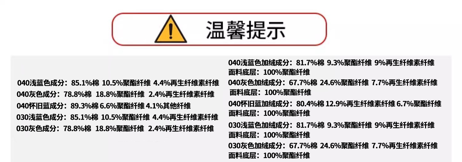 | 材質成分 | 棉89.3% 聚酯纖維6.6% 其他材質4.1% |