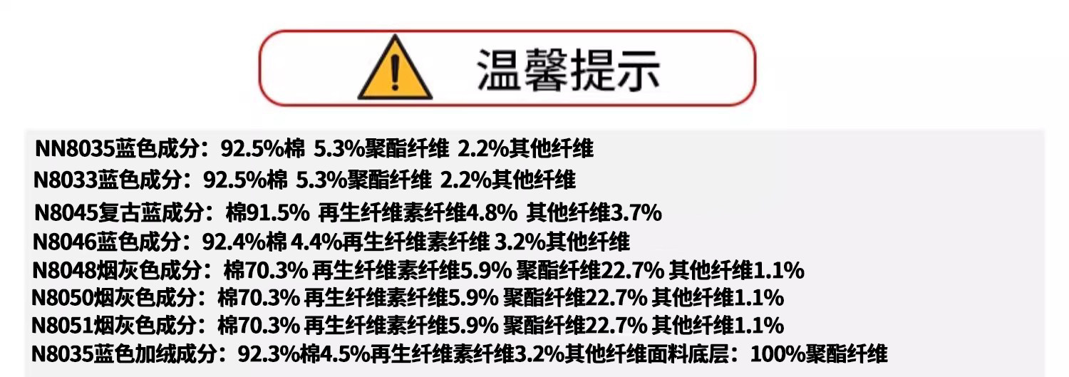 | 材質成分 | 棉92.5% 聚酯纖維5.3% 其他材質2.2% |