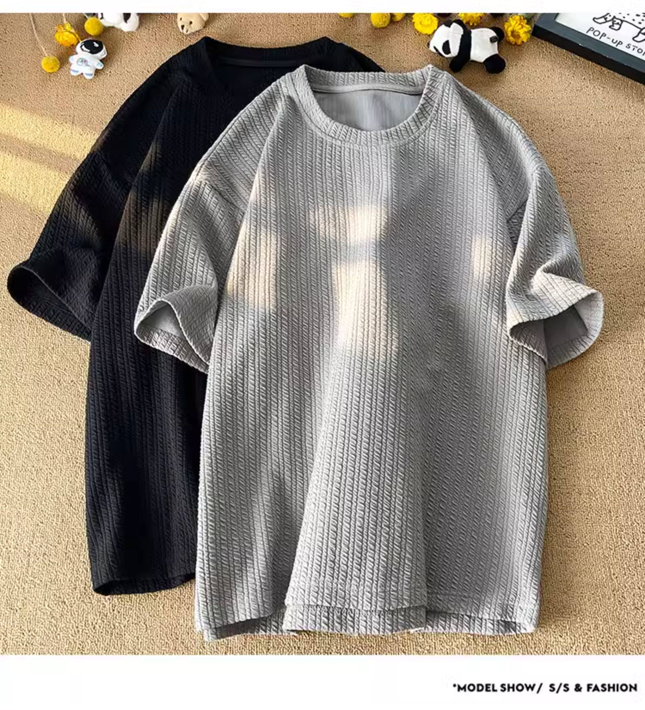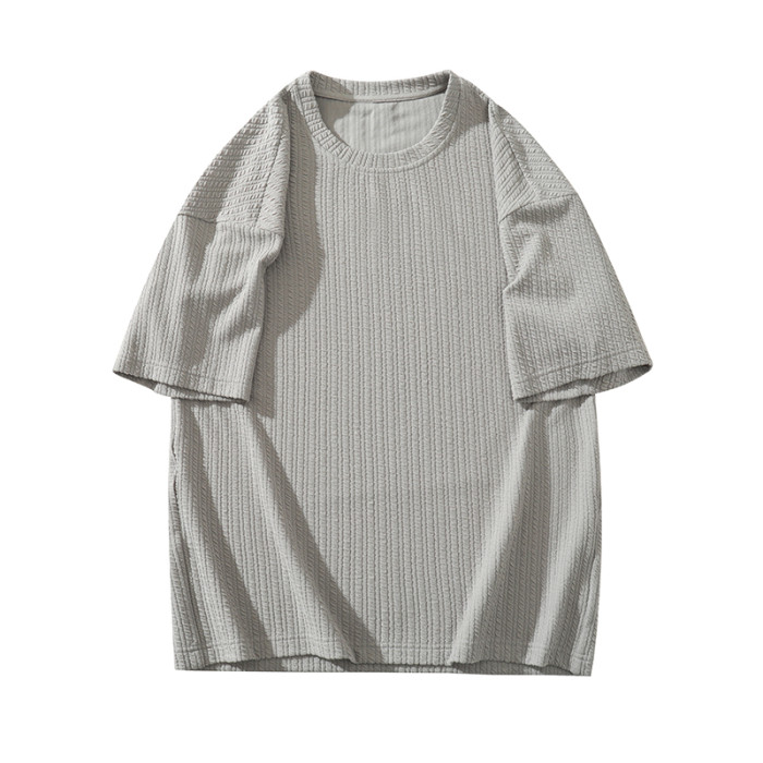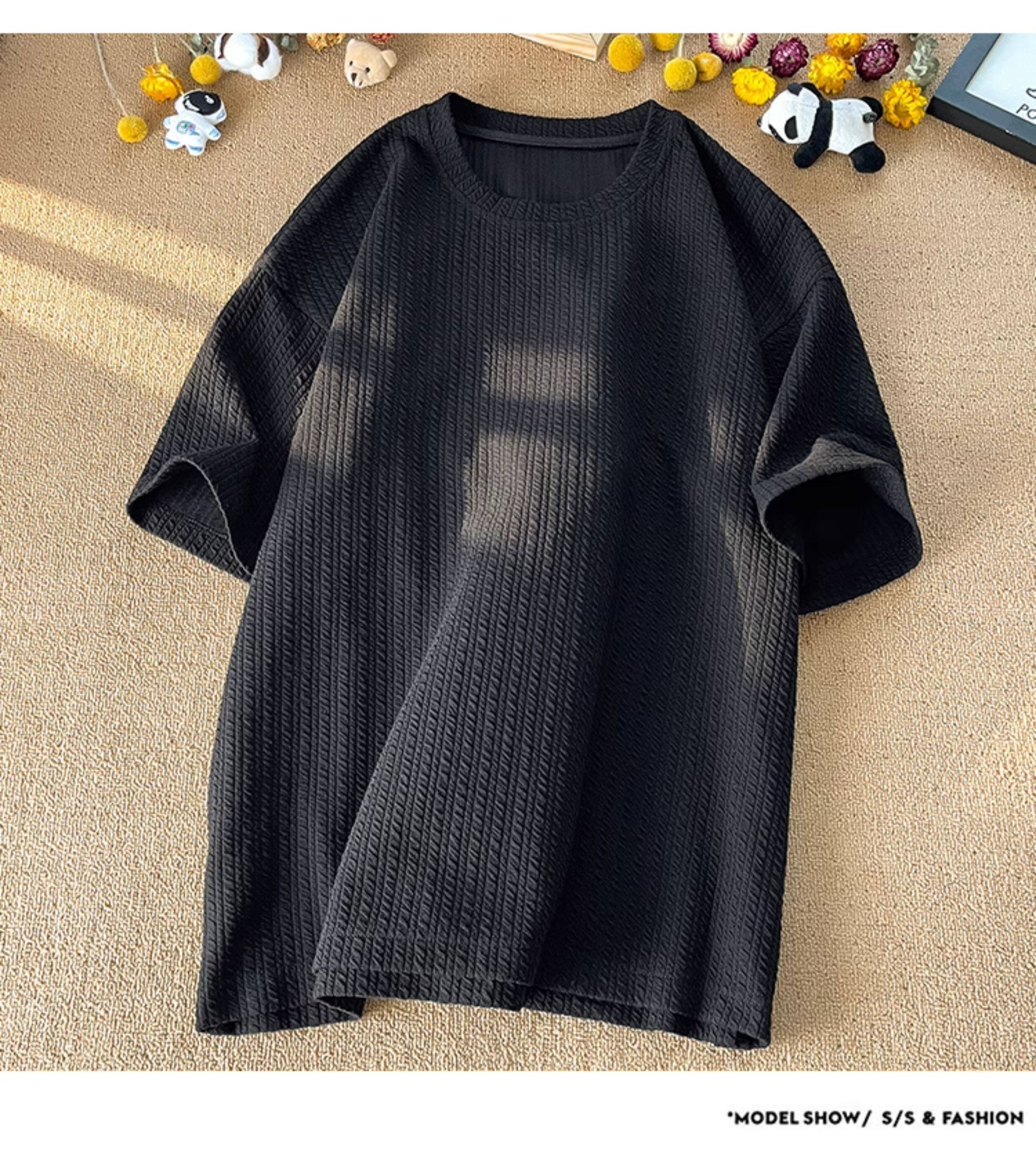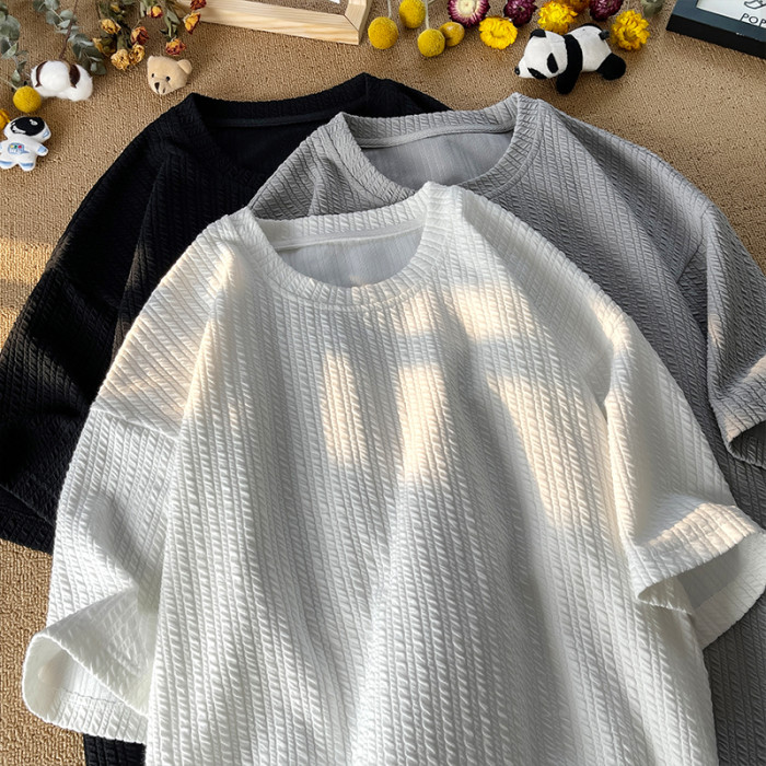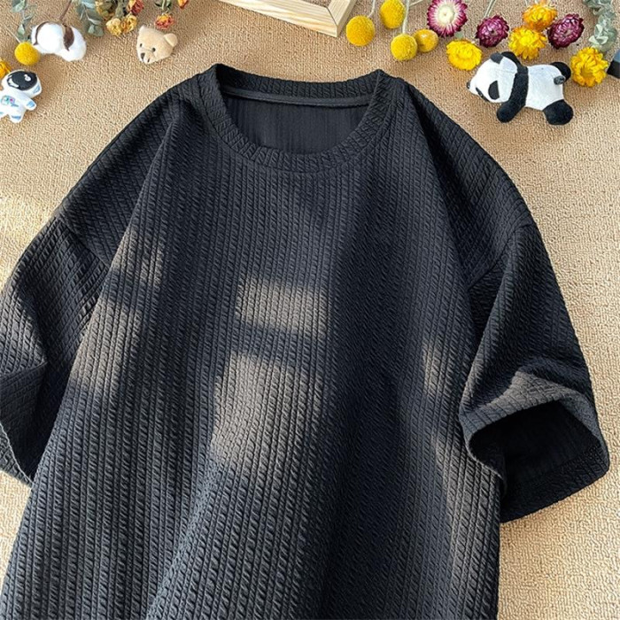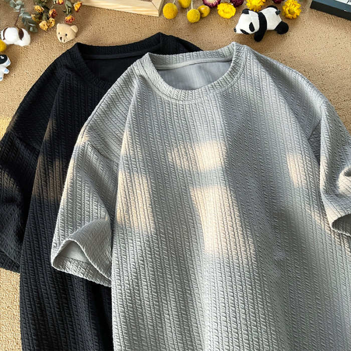 潮牌設計感編織條紋褶皺短袖T恤男大碼寬鬆潮胖子打底衫半袖體恤