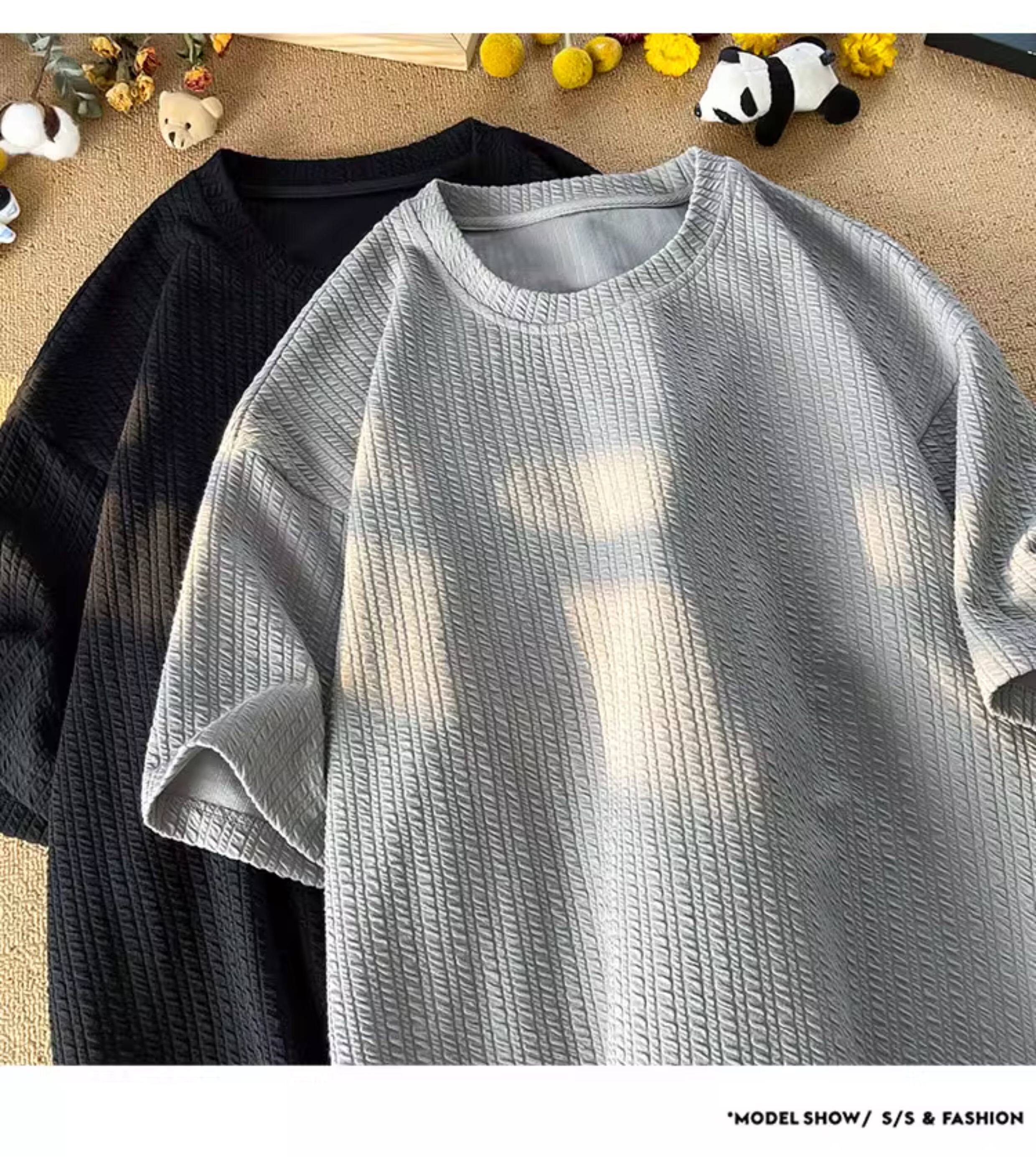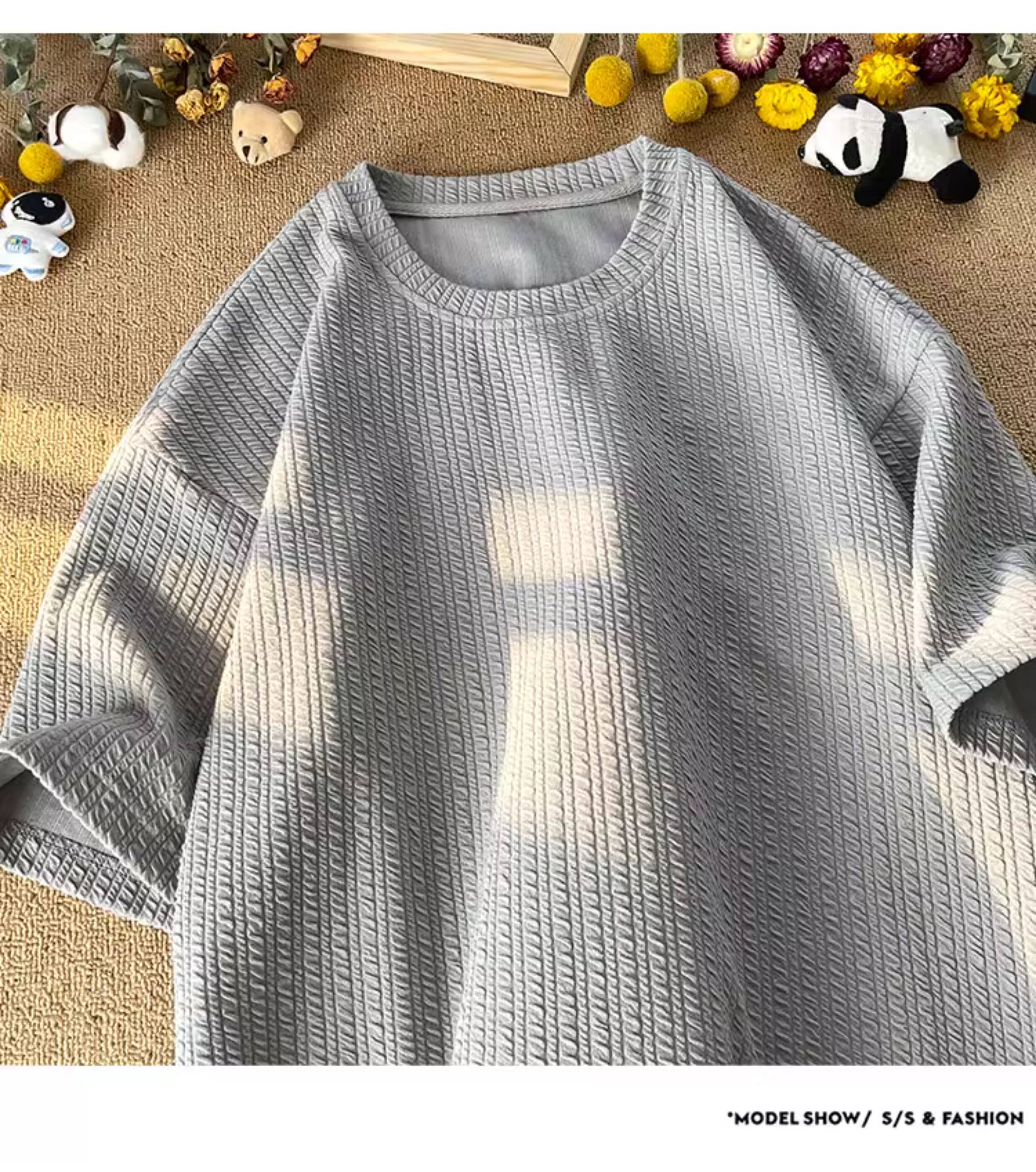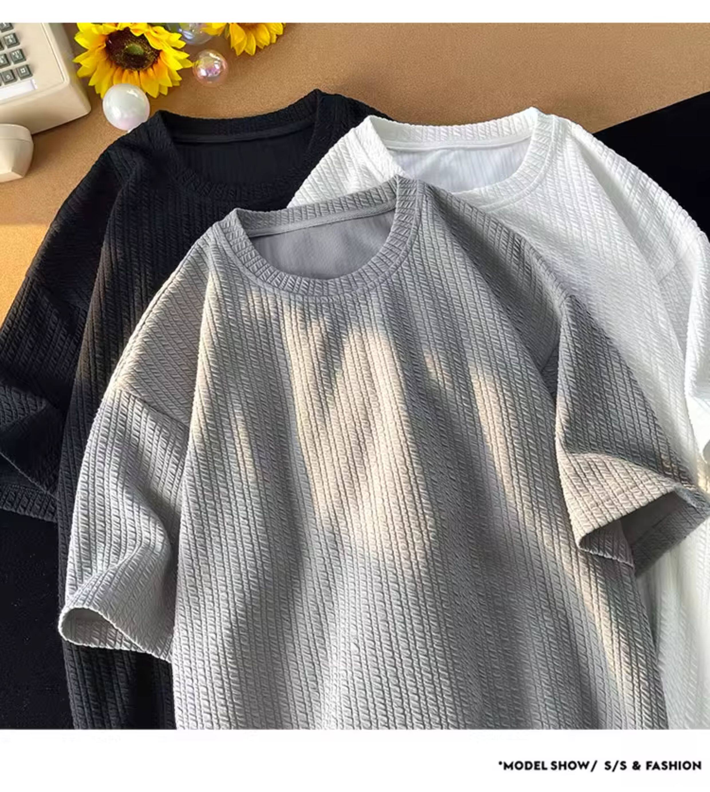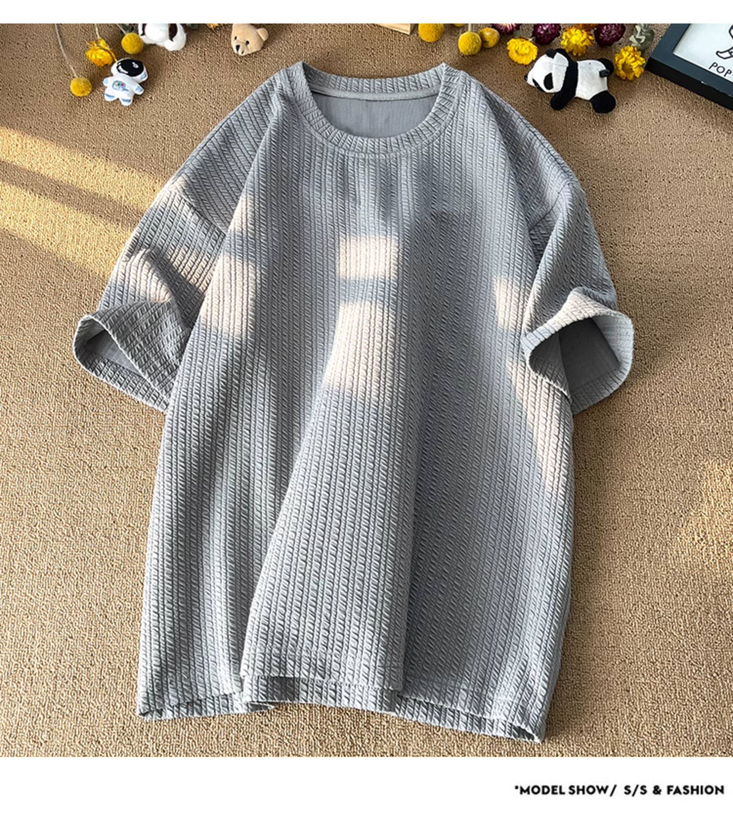 潮牌設計感編織條紋褶皺短袖T恤男大碼寬鬆潮胖子打底衫半袖體恤