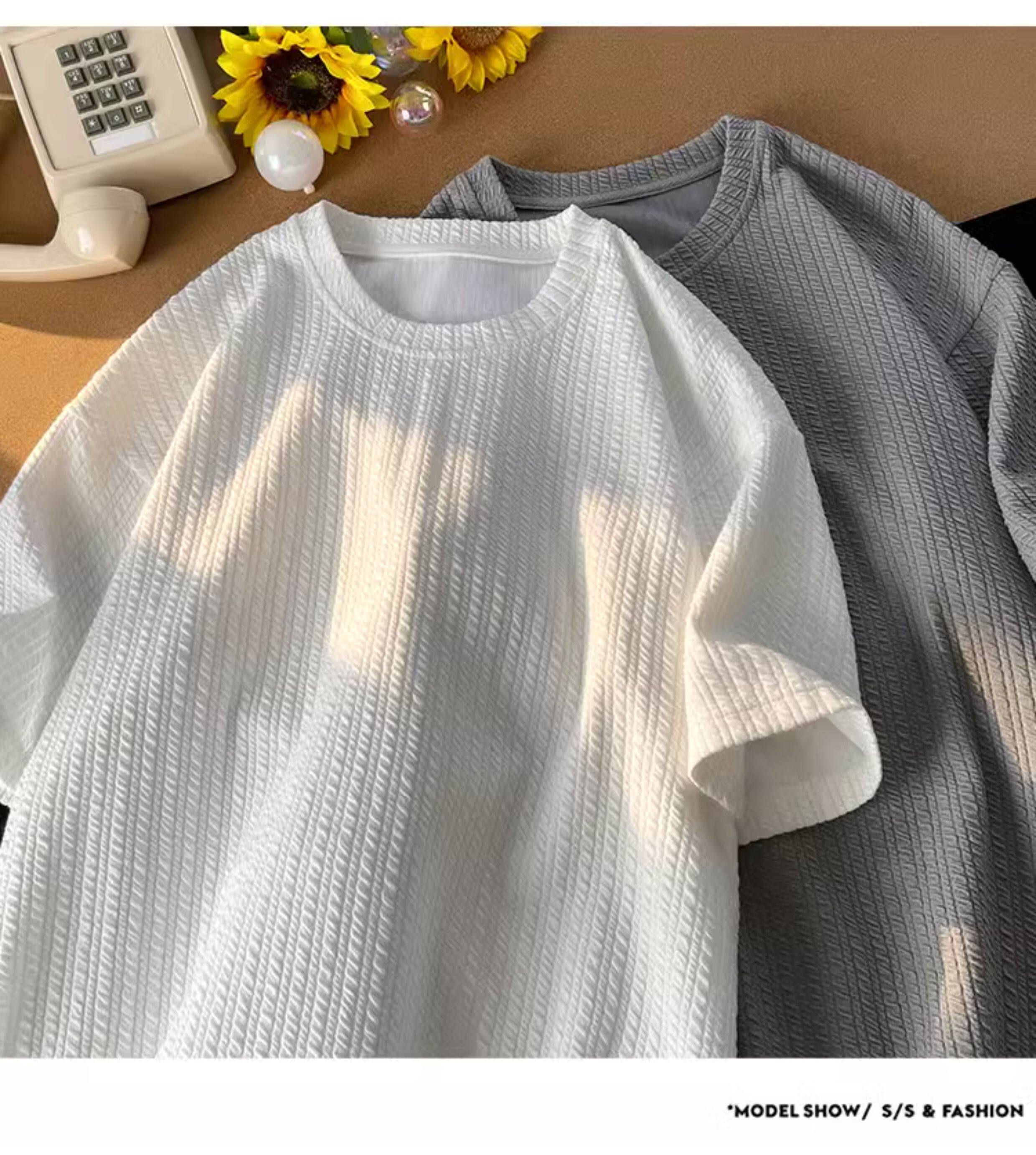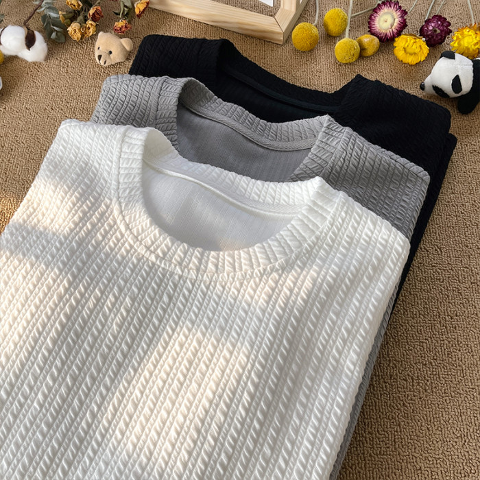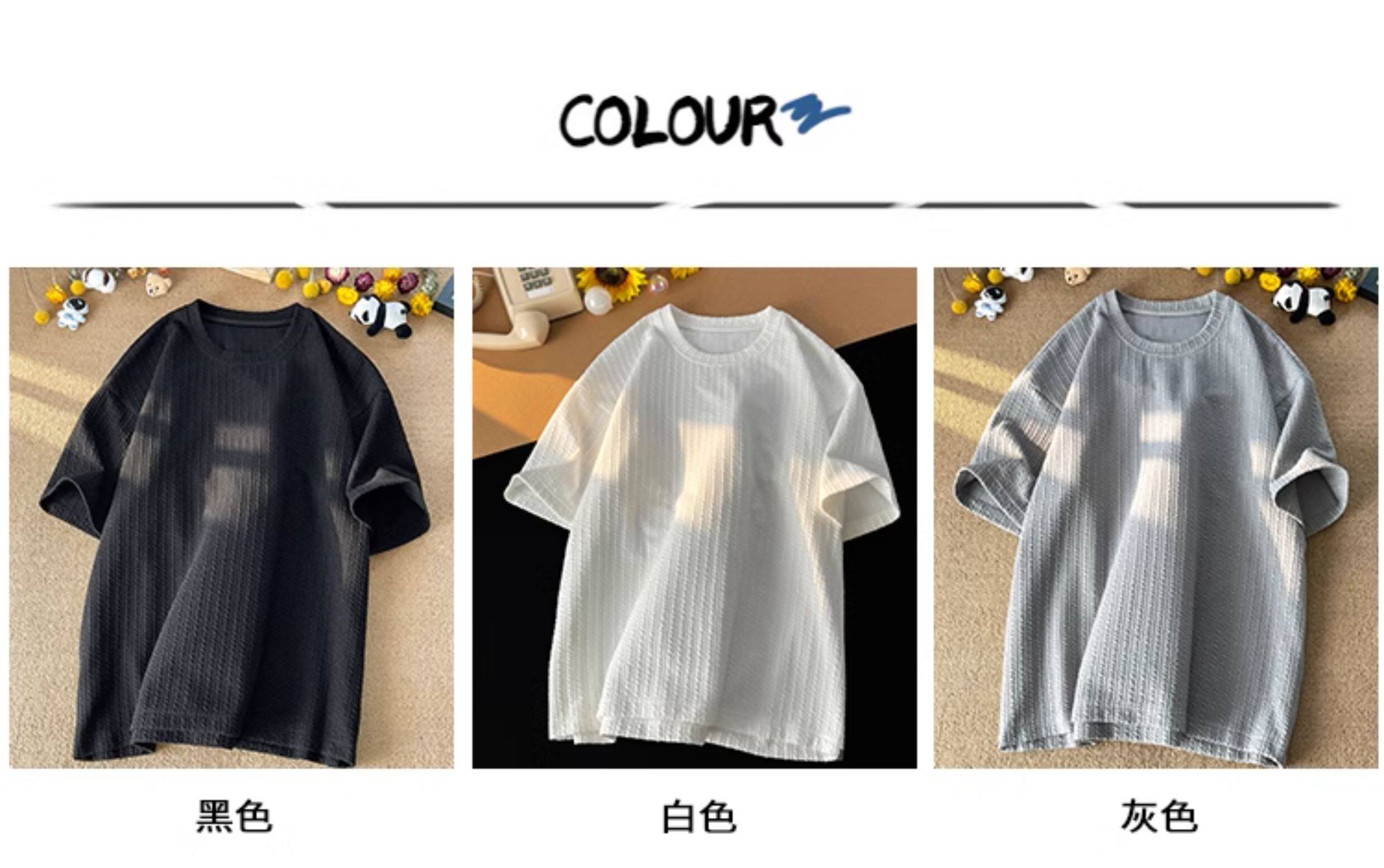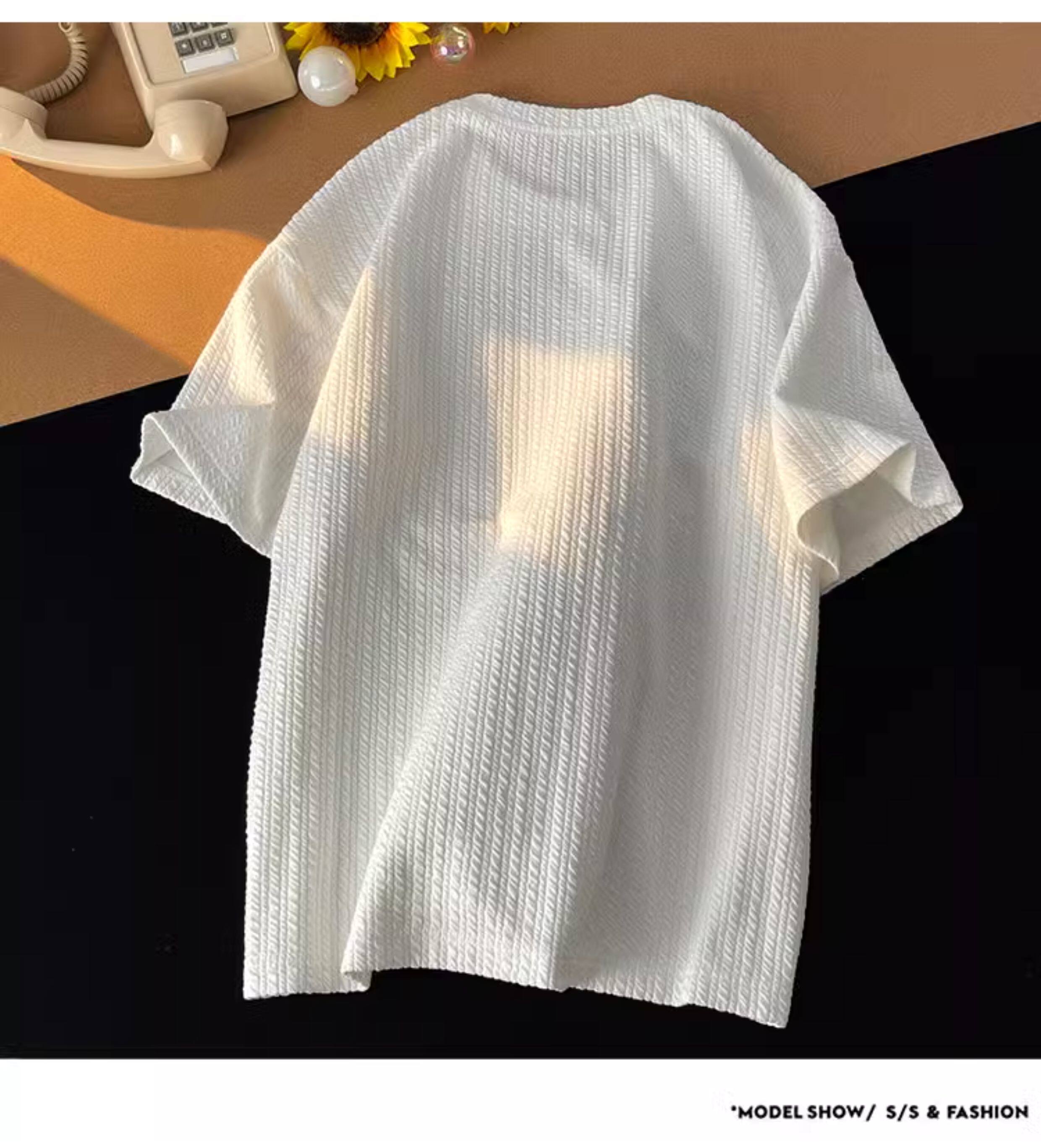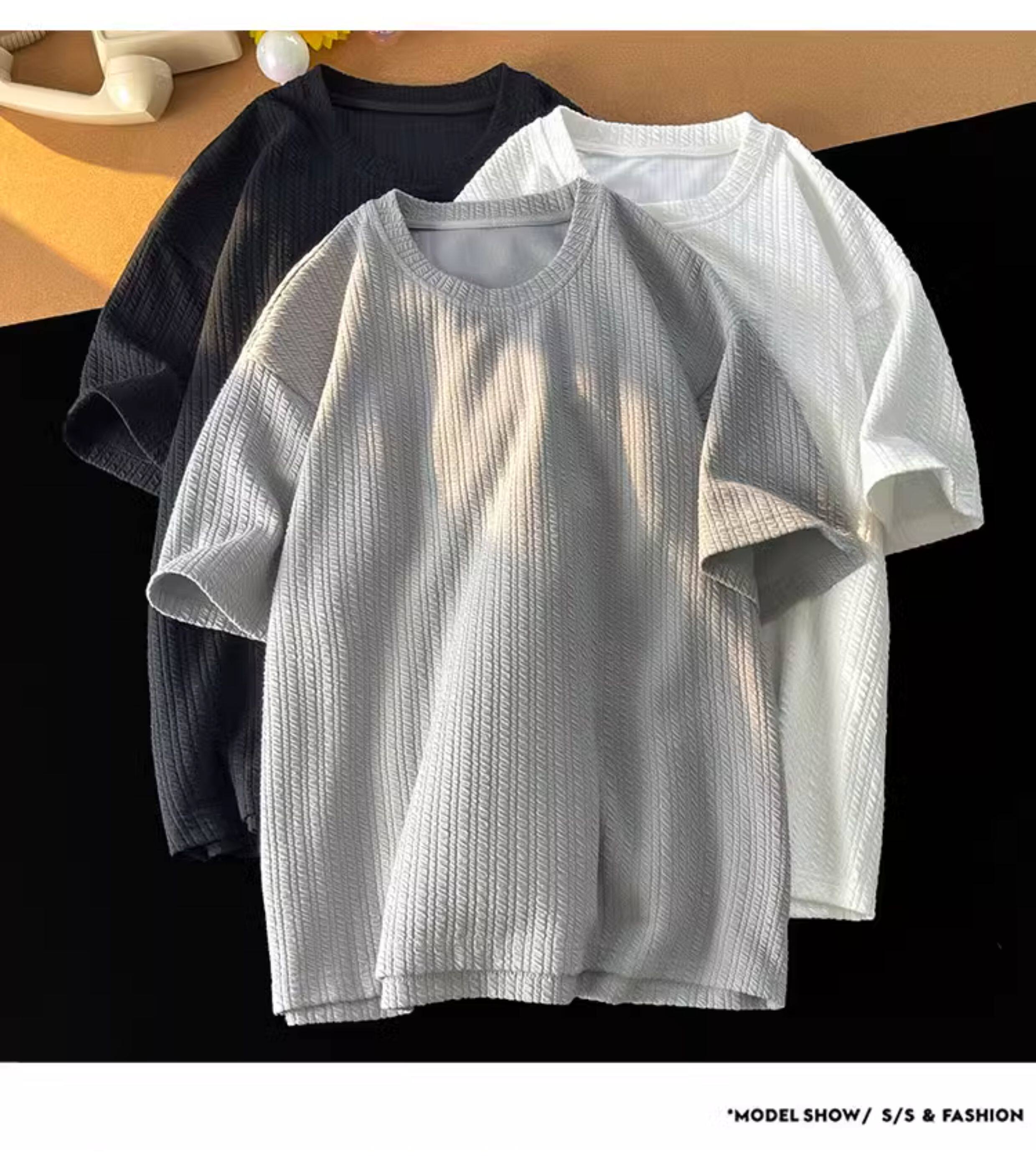 潮牌設計感編織條紋褶皺短袖T恤男大碼寬鬆潮胖子打底衫半袖體恤