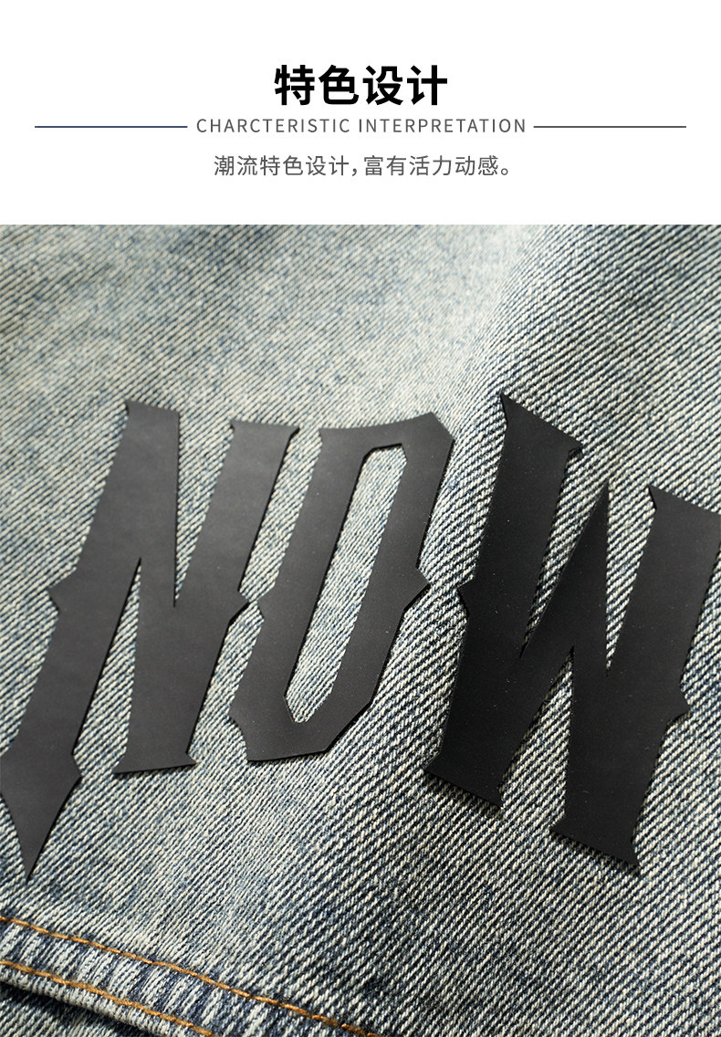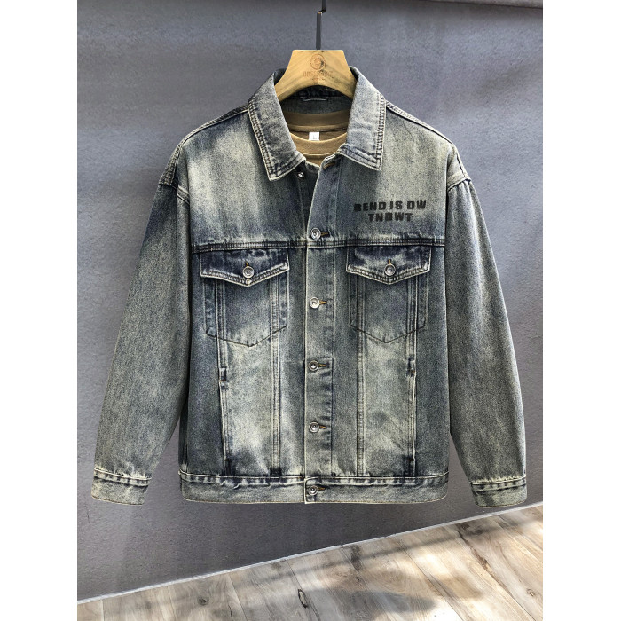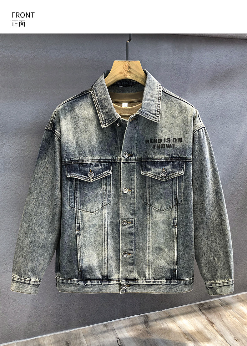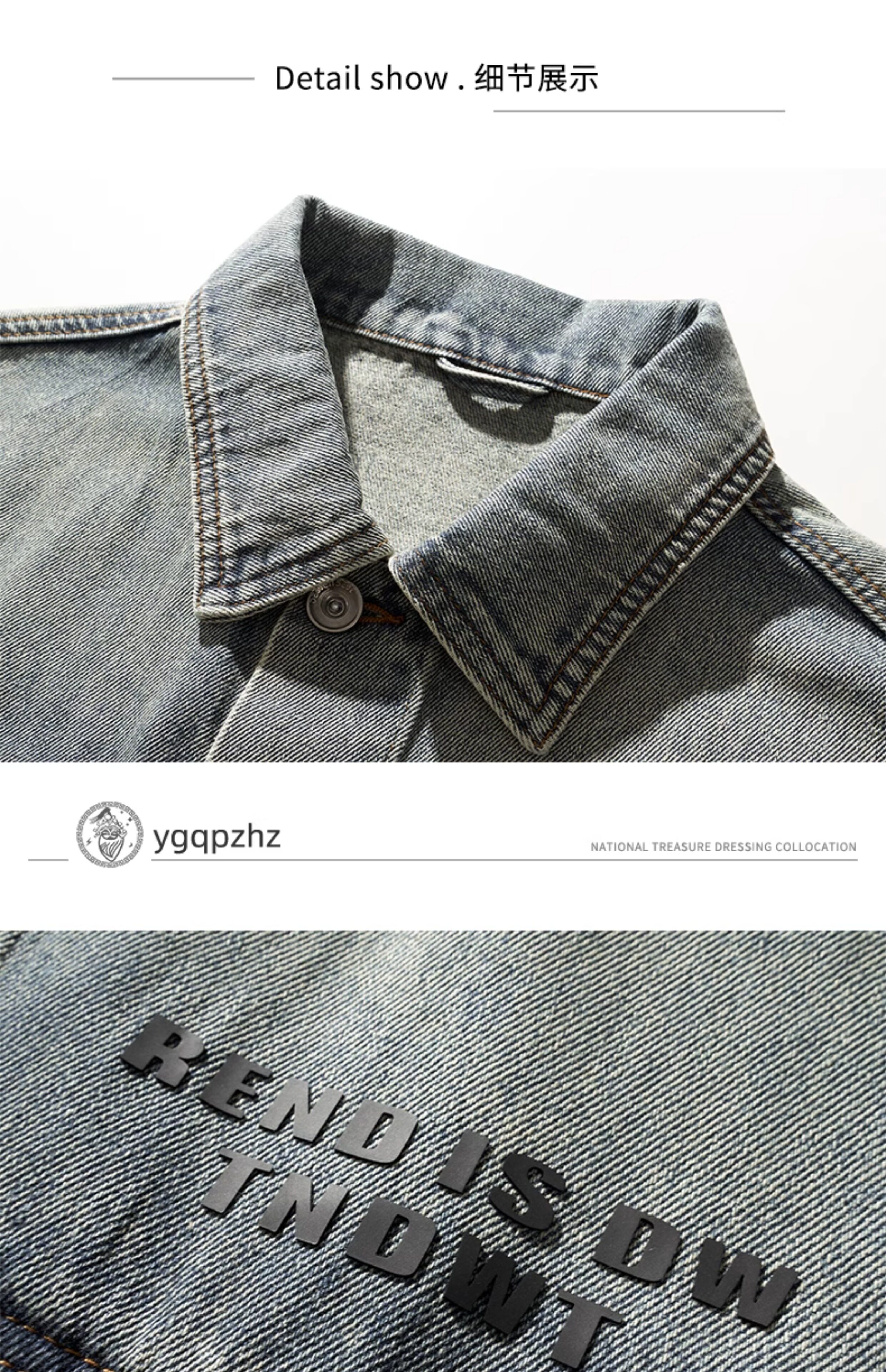 高級復古字母厚板矽膠印水洗牛仔外套男士春秋寬鬆美式工裝夾克男