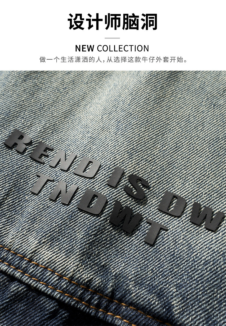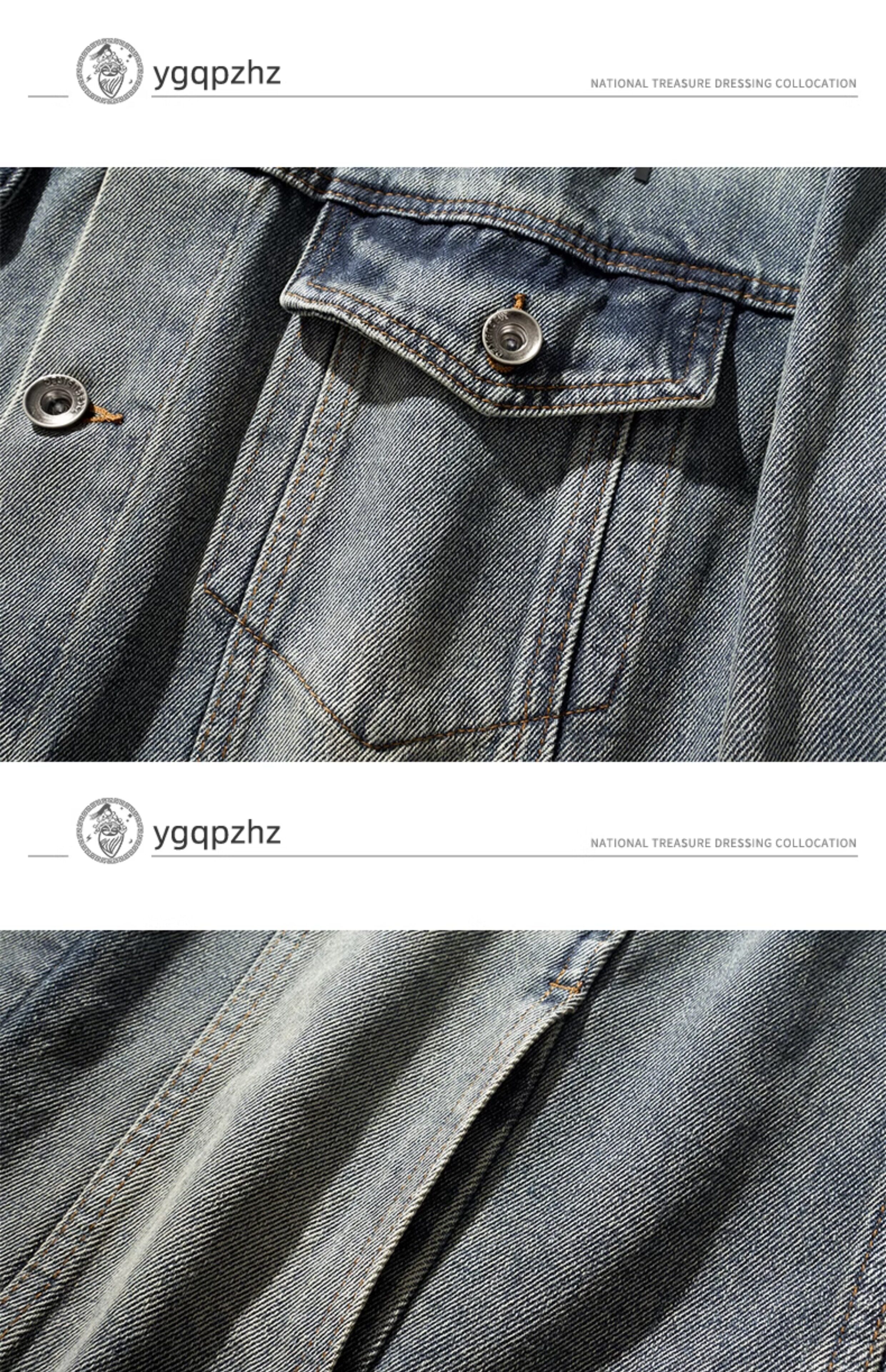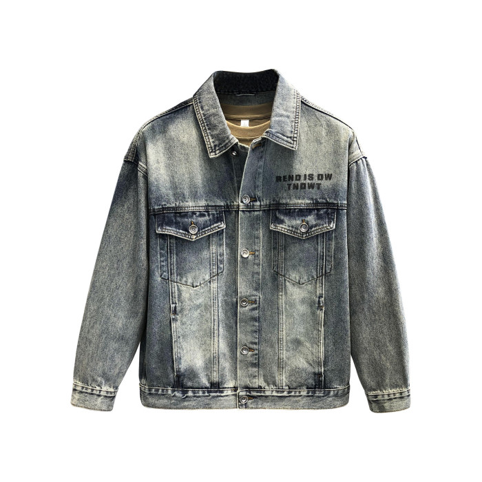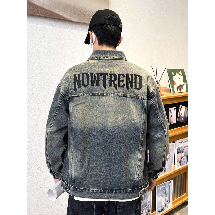 高級復古字母厚板矽膠印水洗牛仔外套男士春秋寬鬆美式工裝夾克男