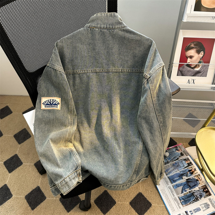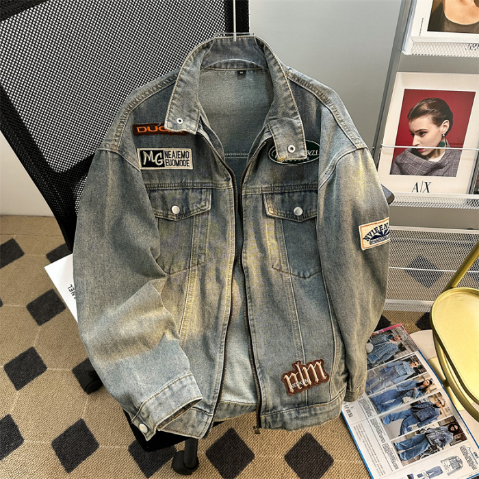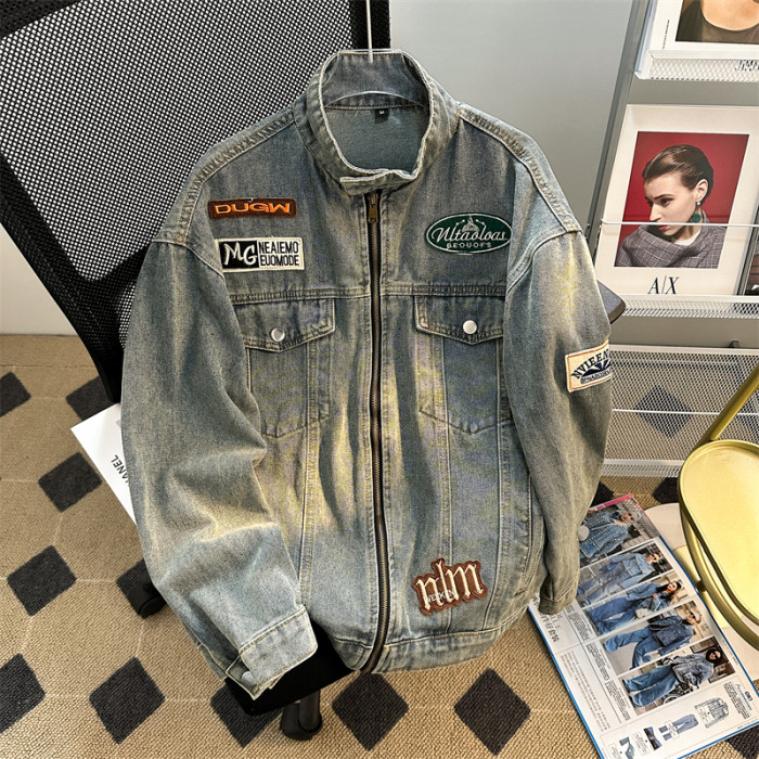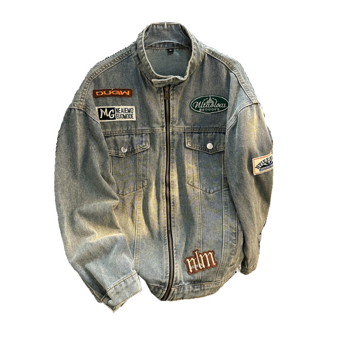 立領機車牛仔外套男款春秋季美式潮牌vibe痞帥寬鬆百搭拉鍊夾克衫