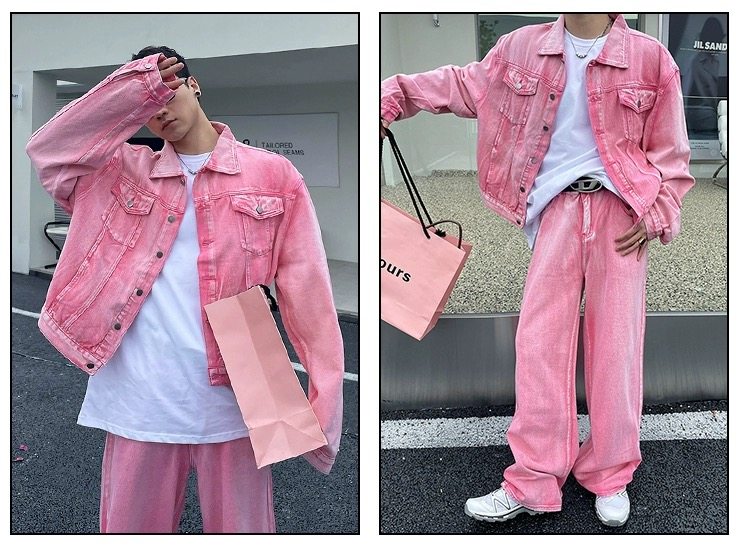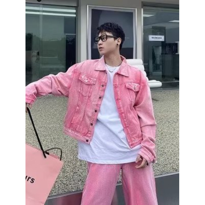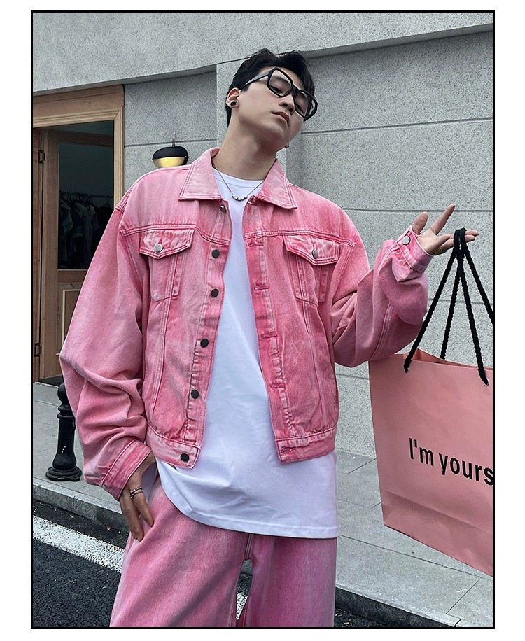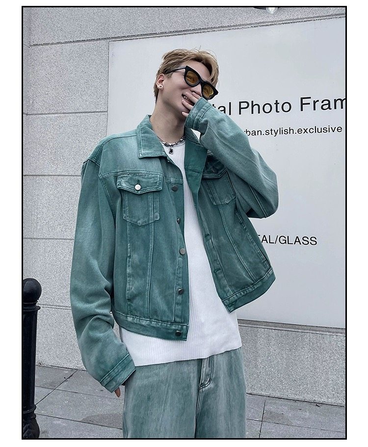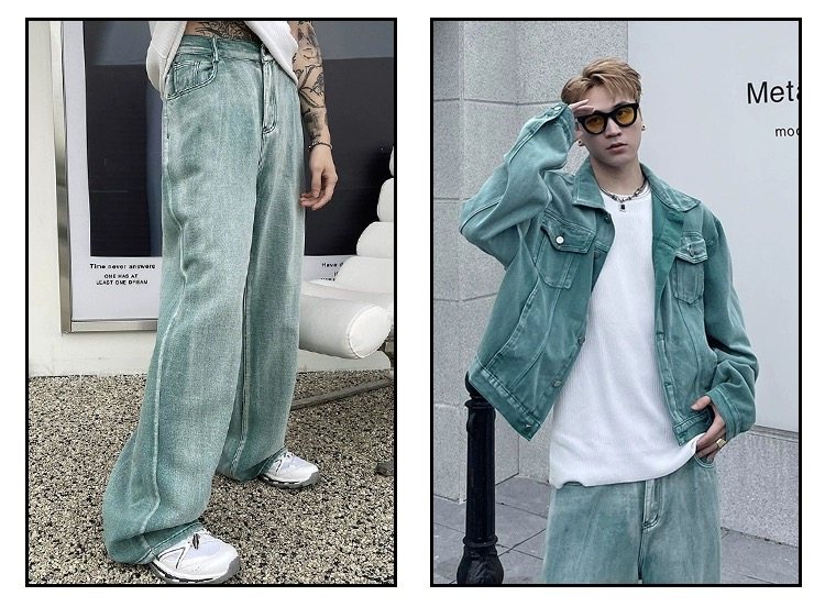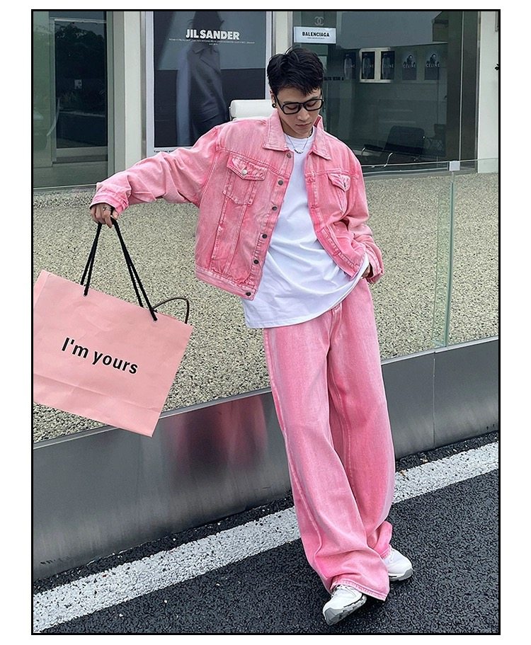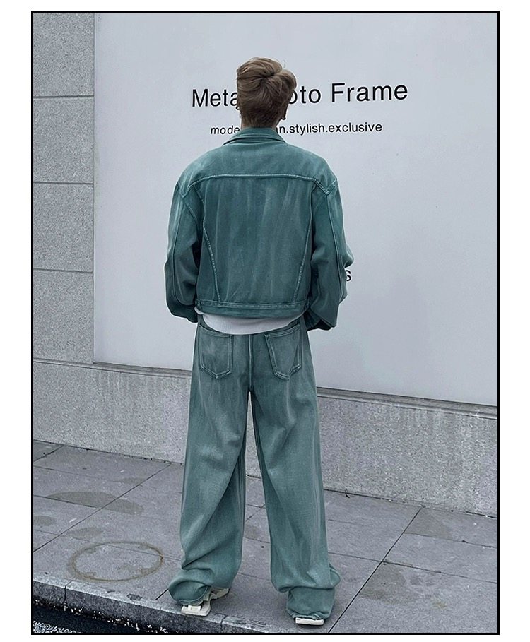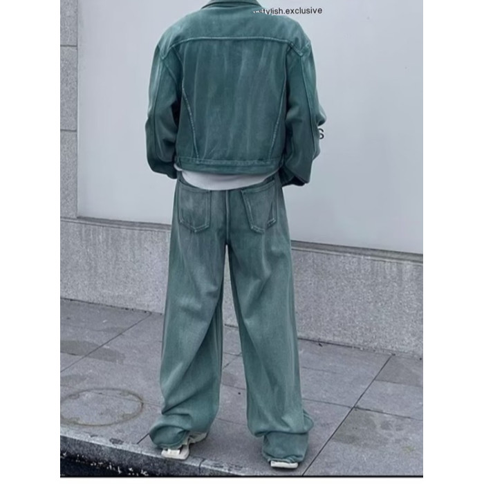 韓版帥氣高級痞帥高街短款牛仔外套時尚男款水洗做舊濶腿褲兩件裝