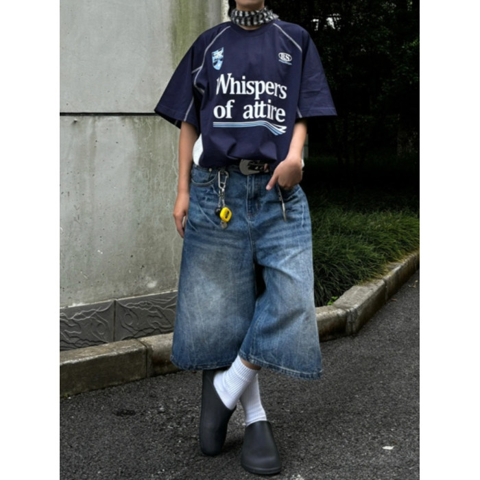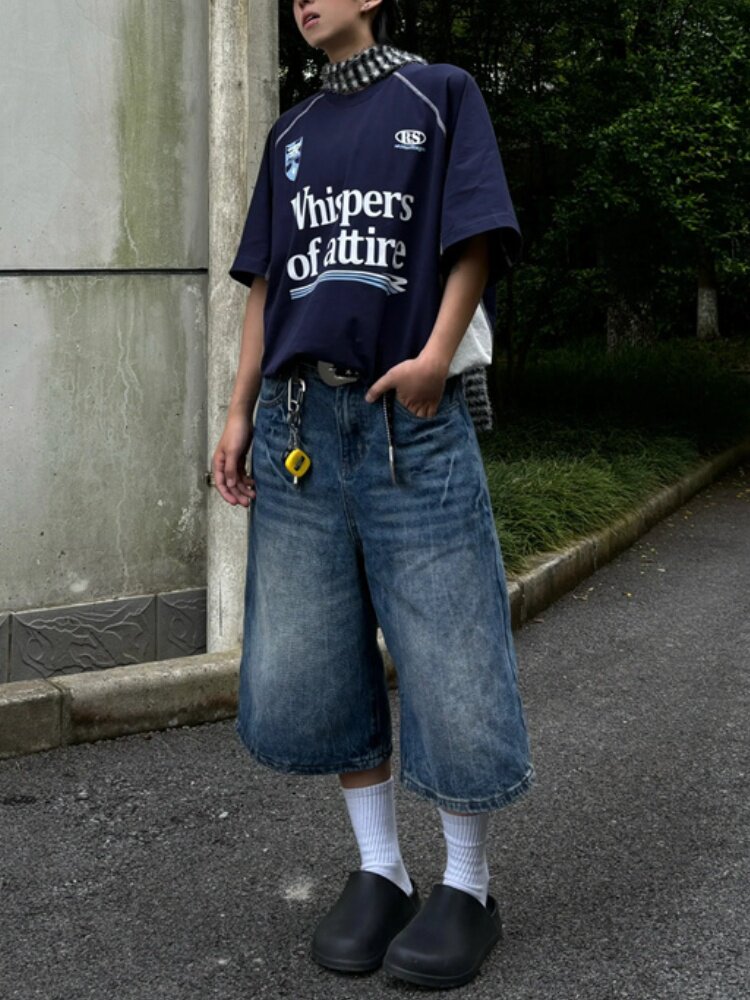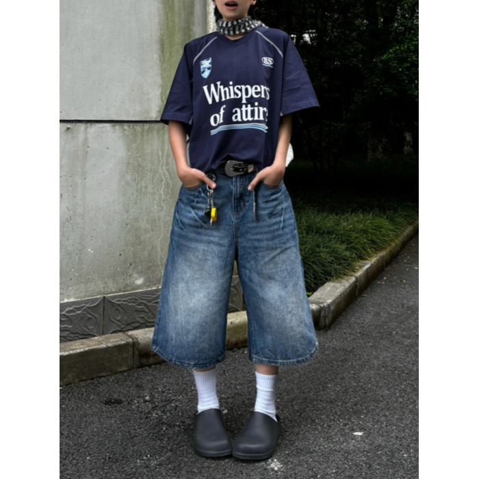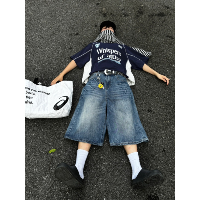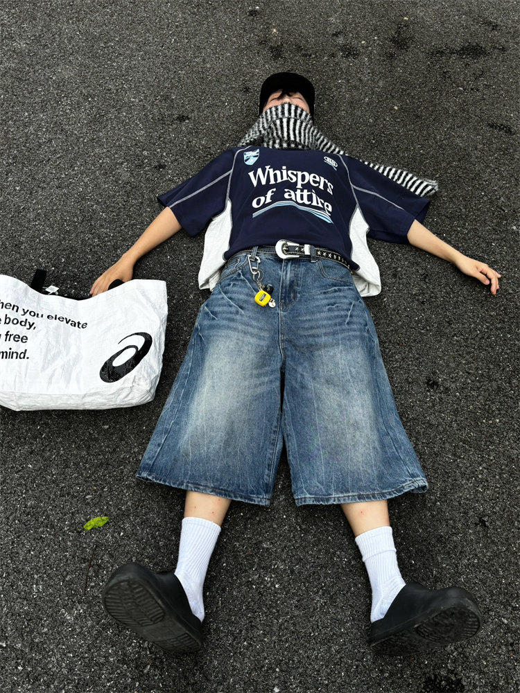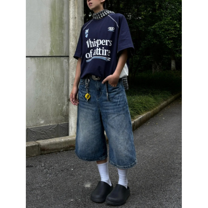 春夏新款閃電紋七分牛仔褲男款寬鬆直筒潮牌時尚休閒短褲水洗復古