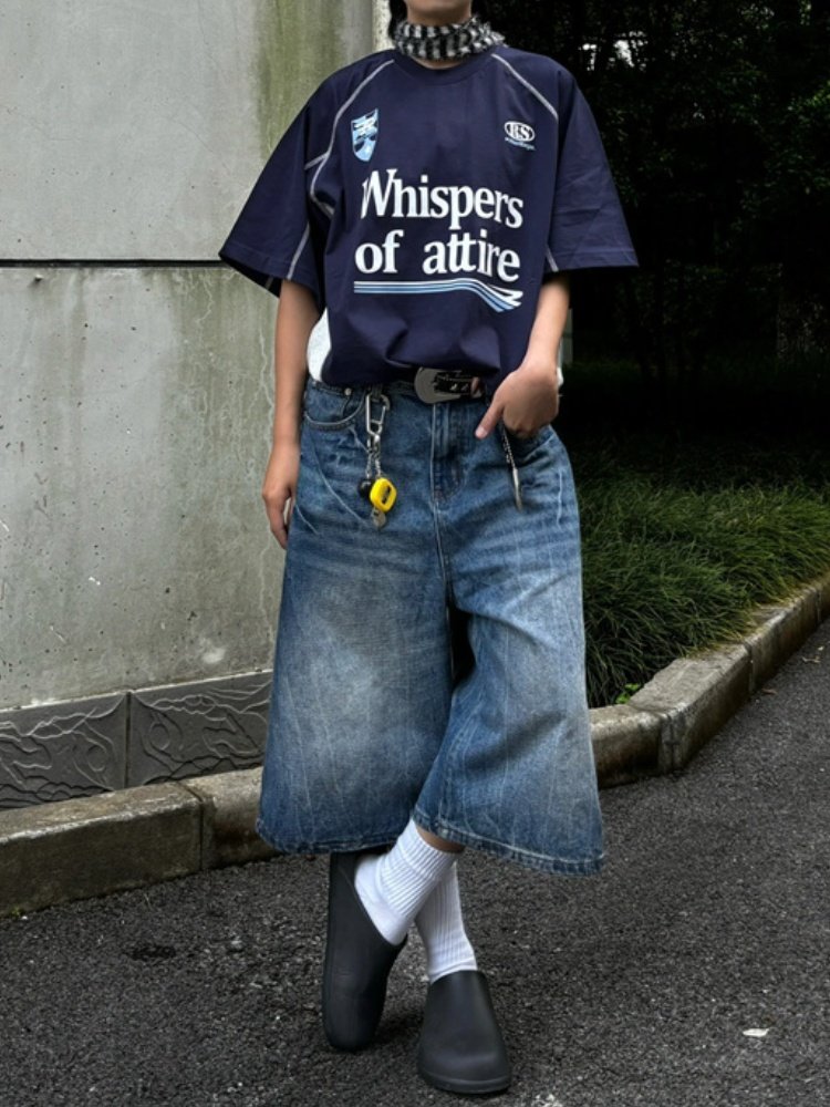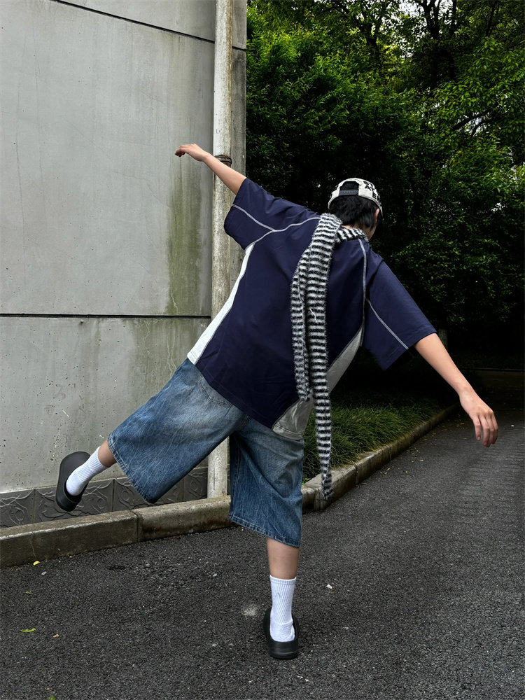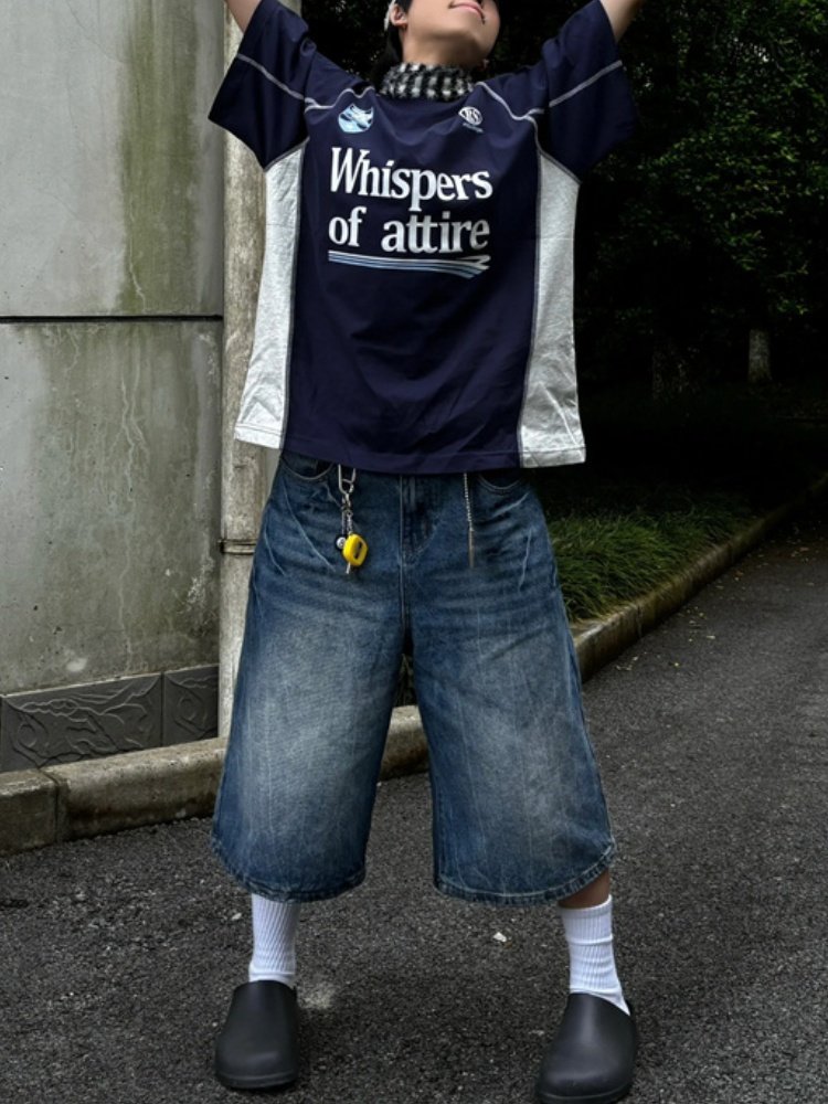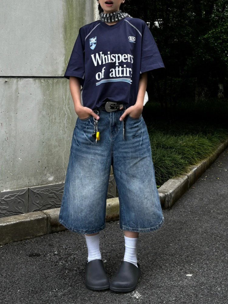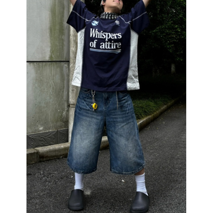 春夏新款閃電紋七分牛仔褲男款寬鬆直筒潮牌時尚休閒短褲水洗復古