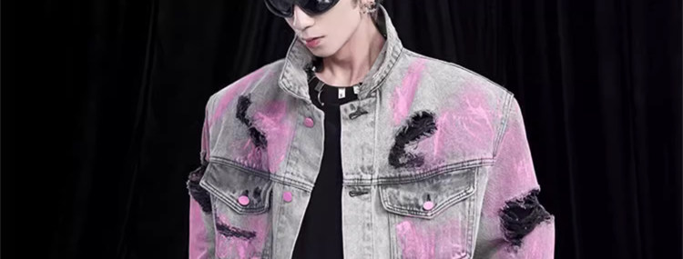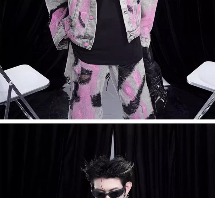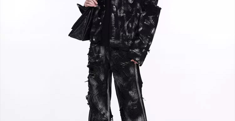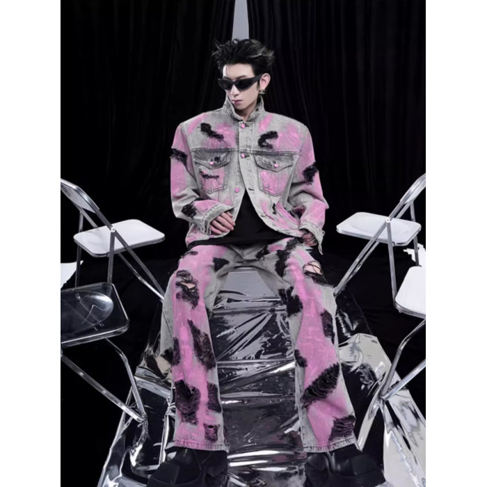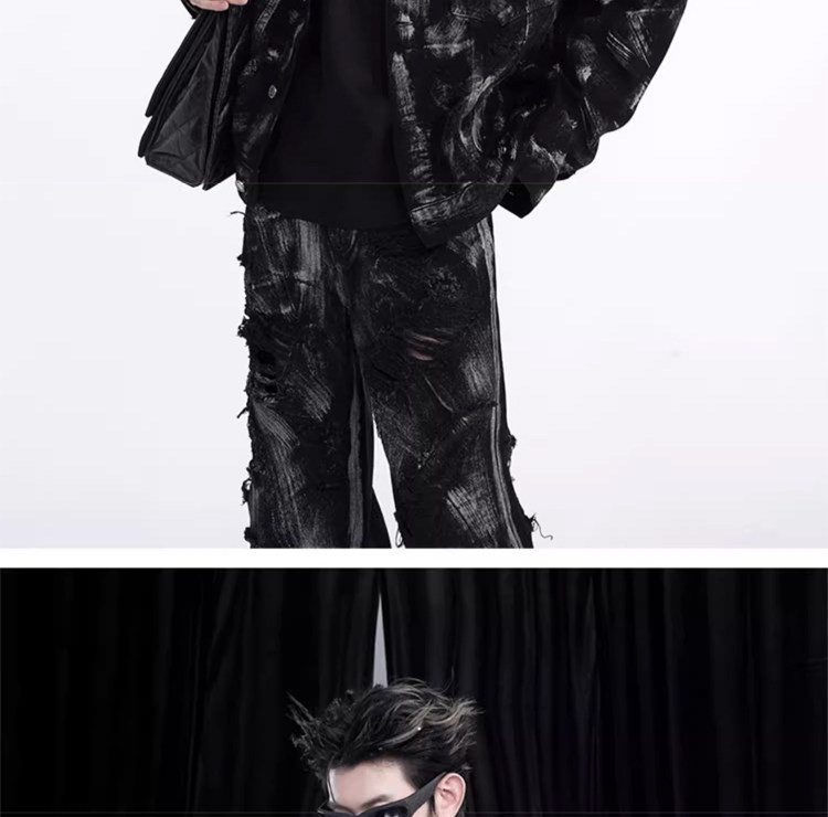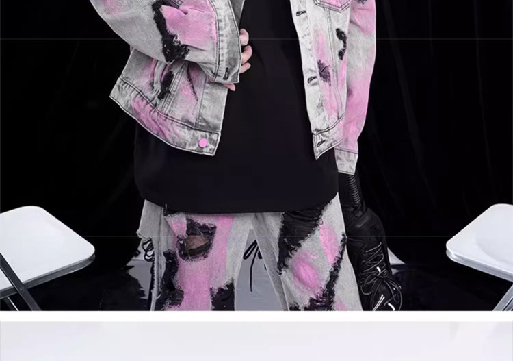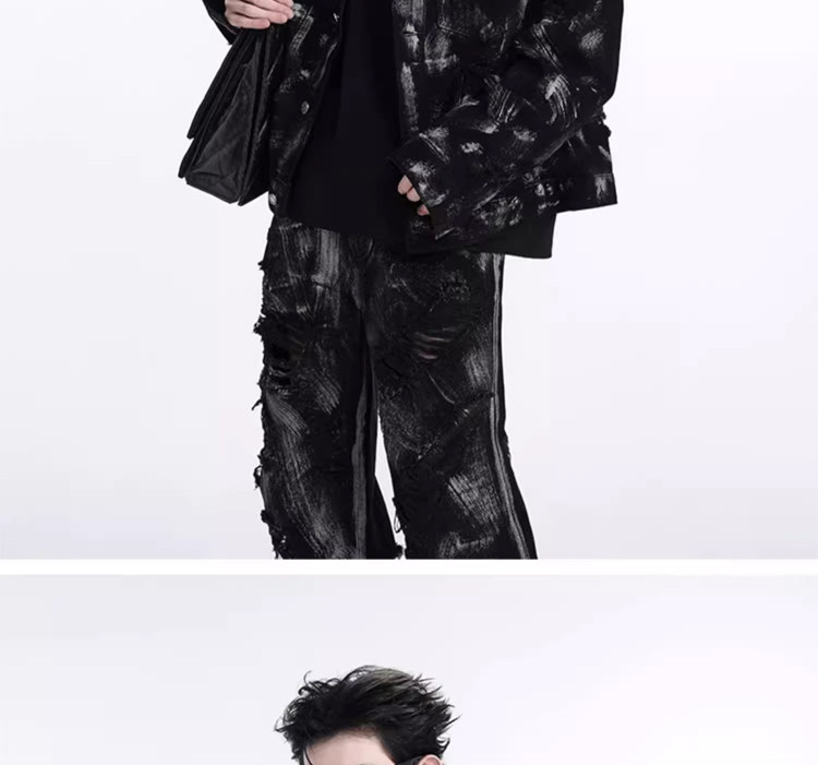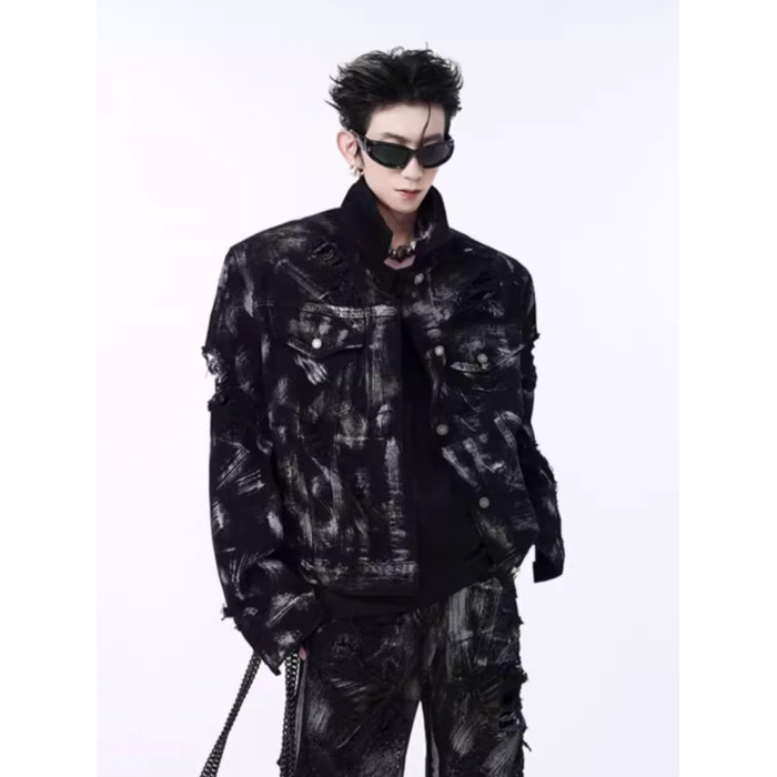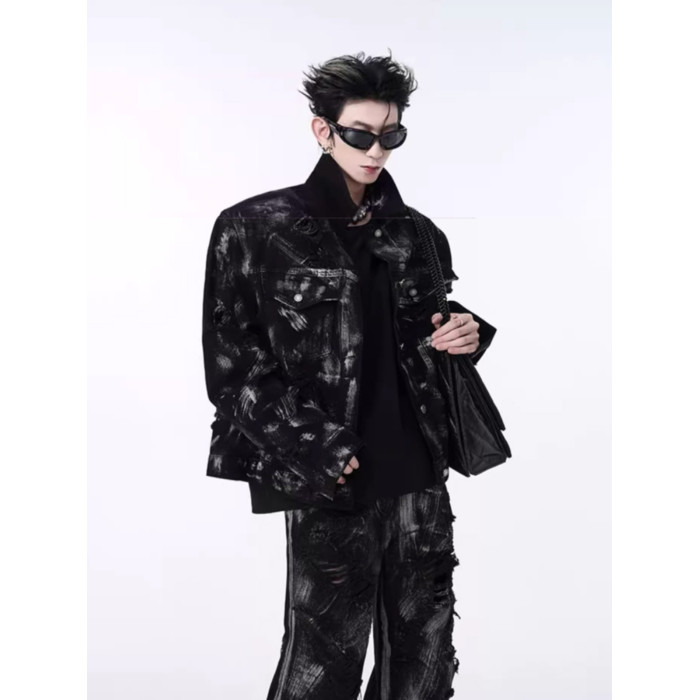 廢土風牛仔外套男歐美街頭塗鴉水洗做舊破洞墊肩夾克牛仔套裝潮牌