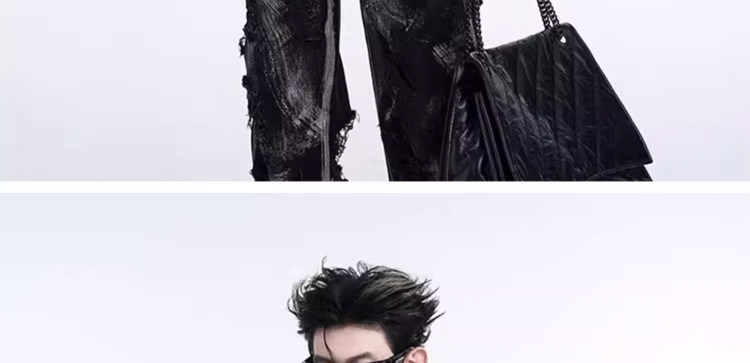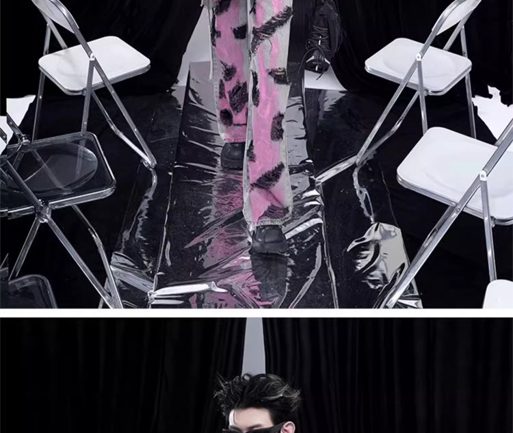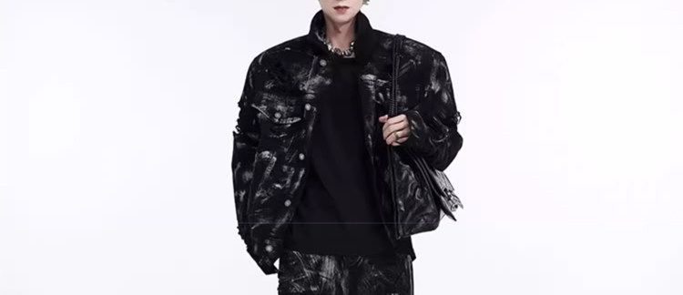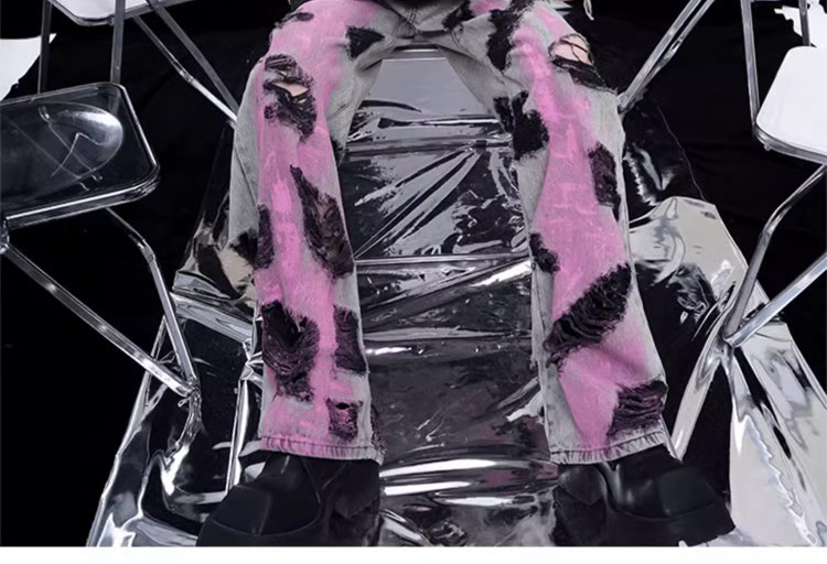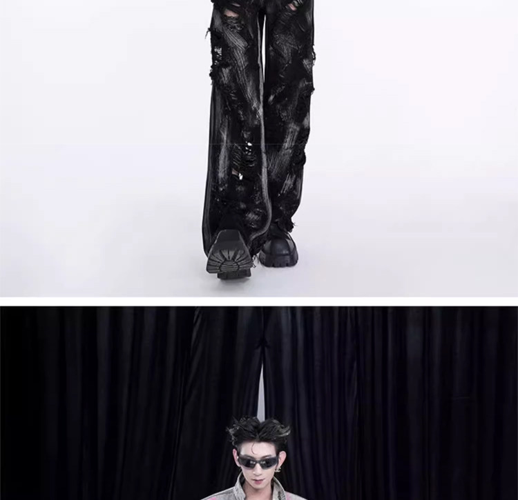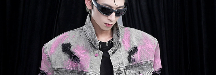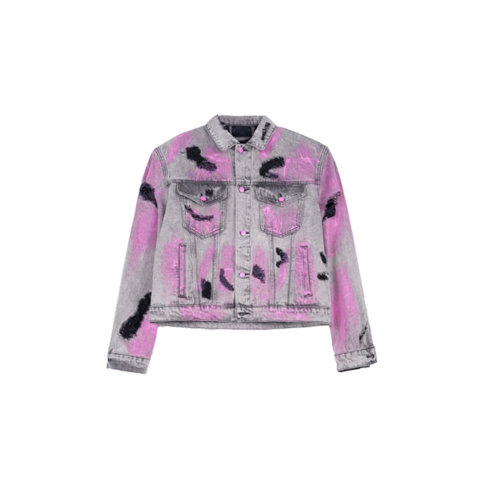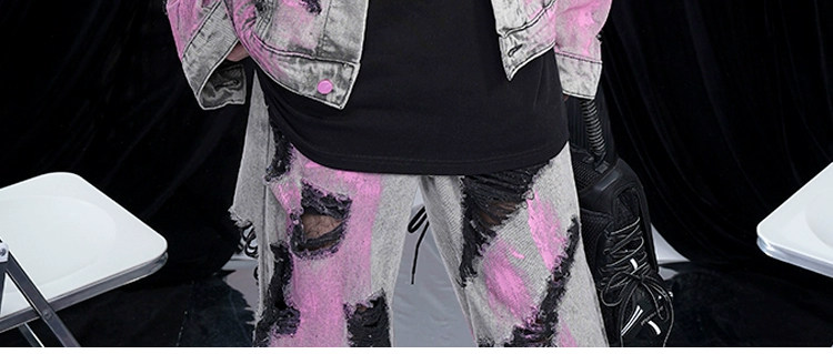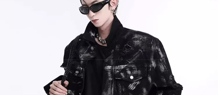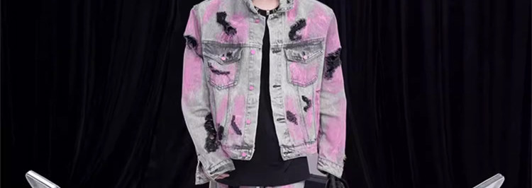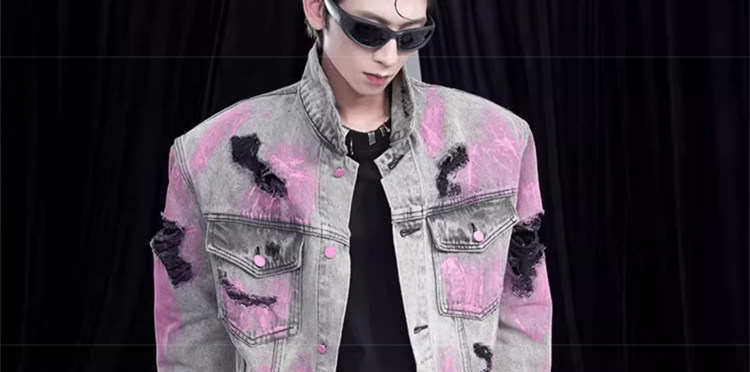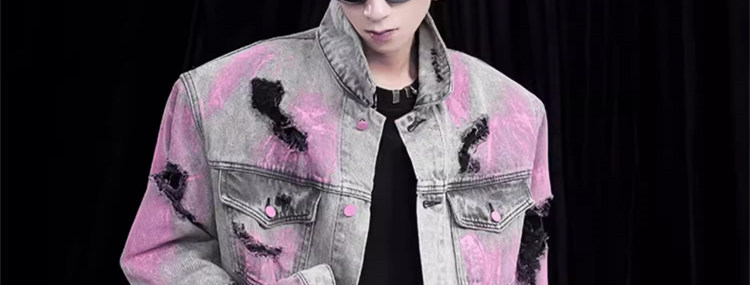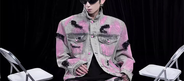 廢土風牛仔外套男歐美街頭塗鴉水洗做舊破洞墊肩夾克牛仔套裝潮牌
