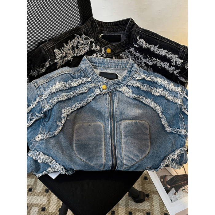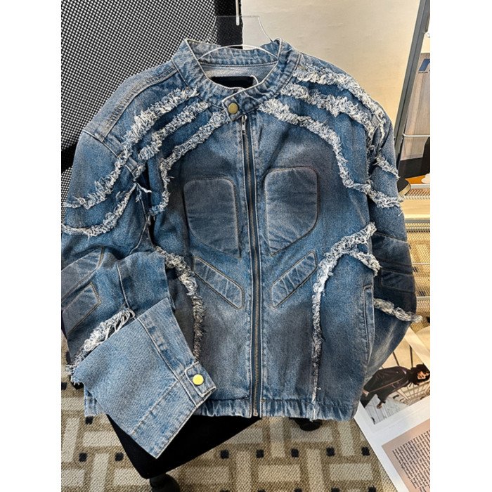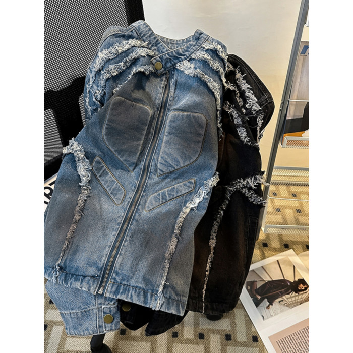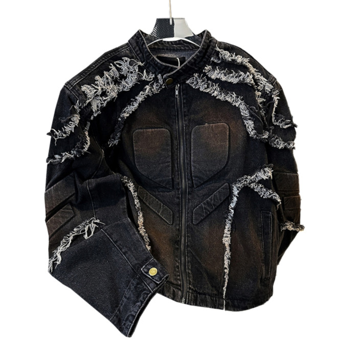 浮雕毛邊墊肩牛仔外套男款春秋季復古美式痞帥上衣潮牌機車服夾克