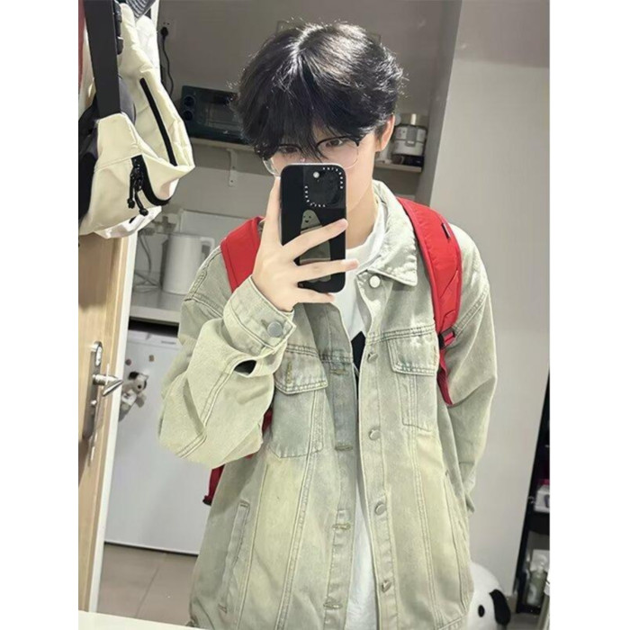 美式潮牌黃泥水洗淺色牛仔外套男女學院風青少年復古情侶棒球服