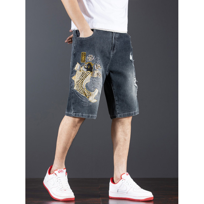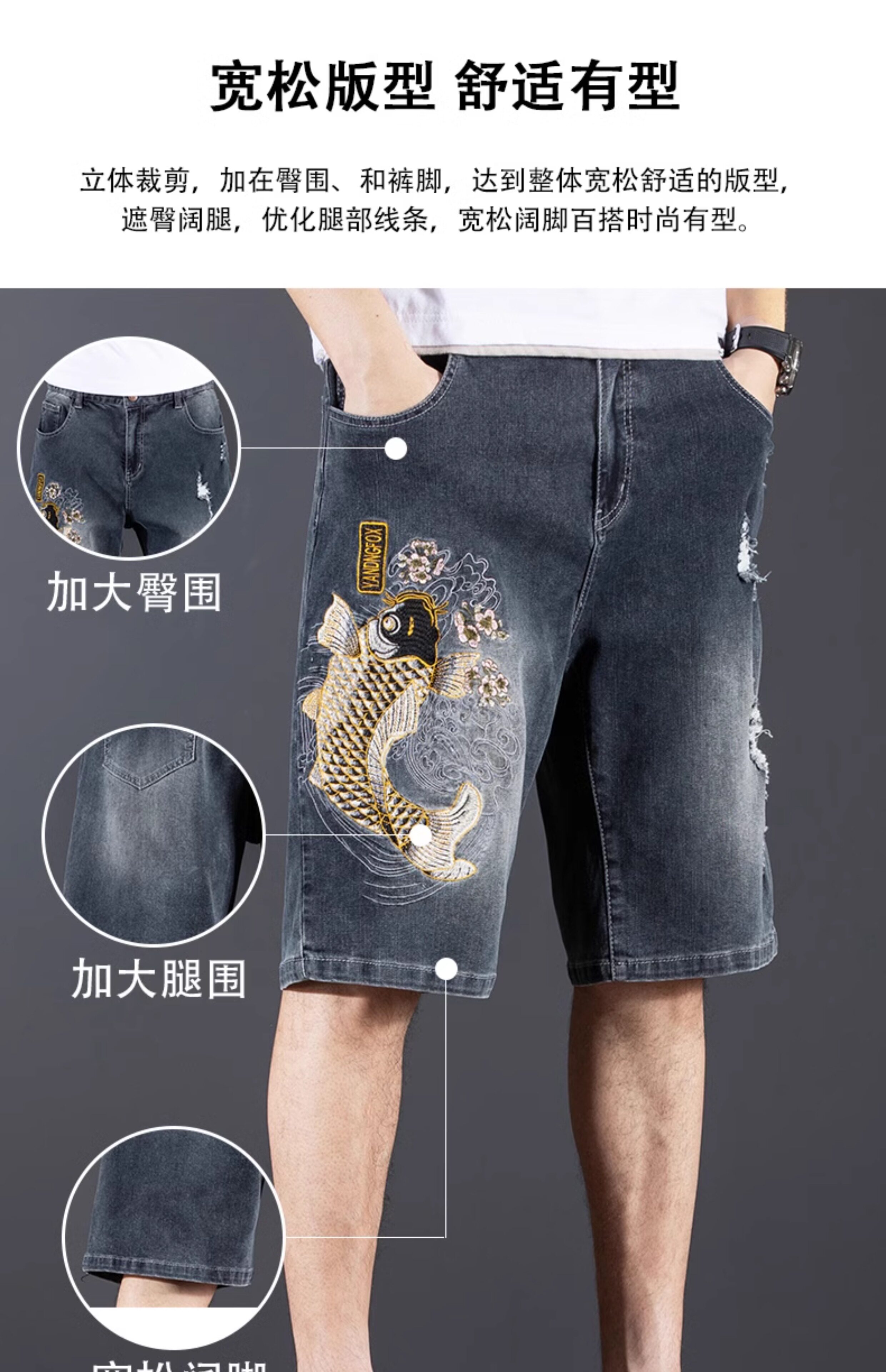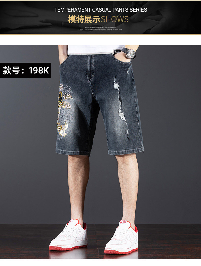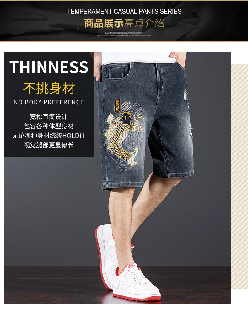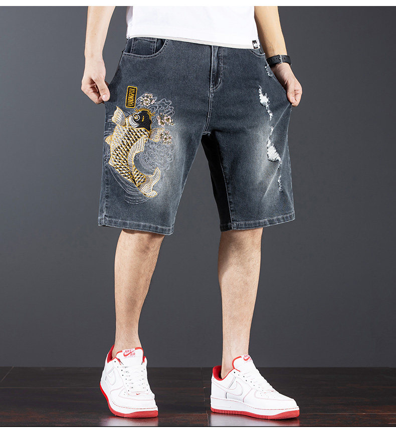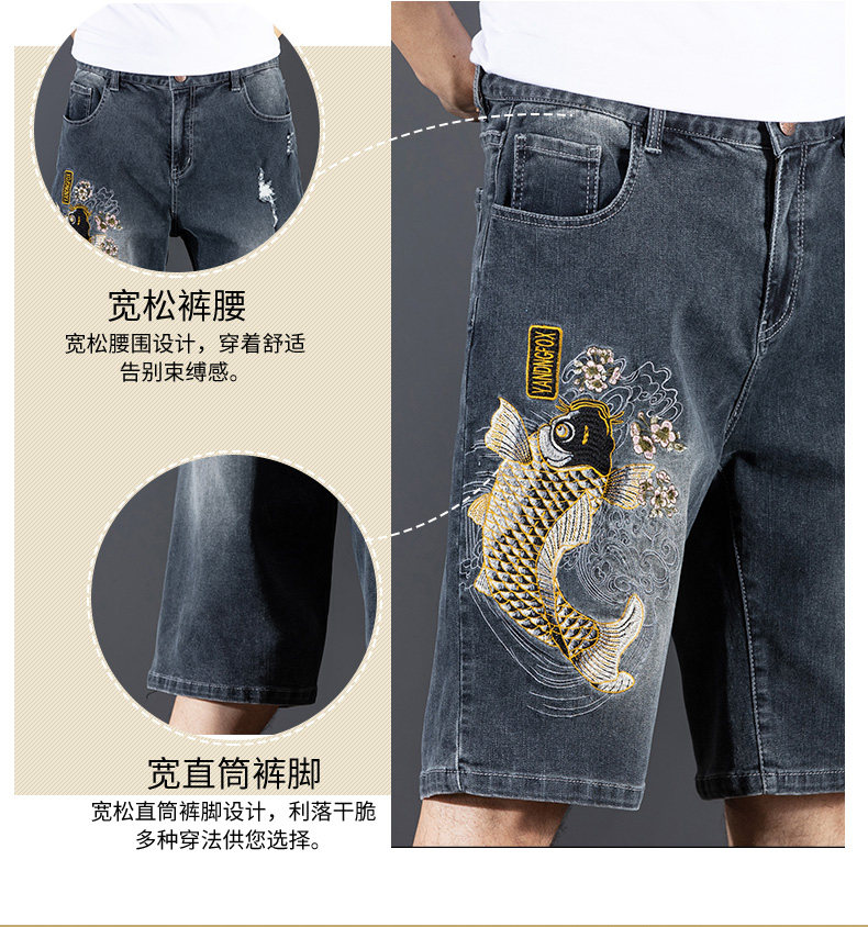 新中式國潮刺綉牛仔短褲男士五分中褲彈力寬鬆破洞潮牌大碼綉花款