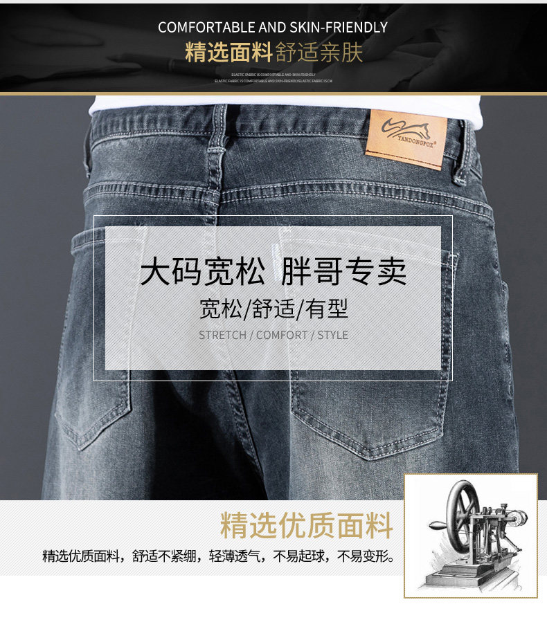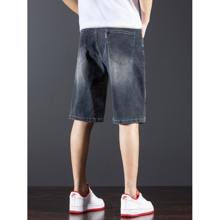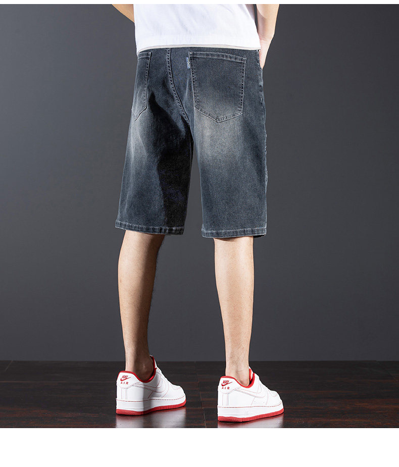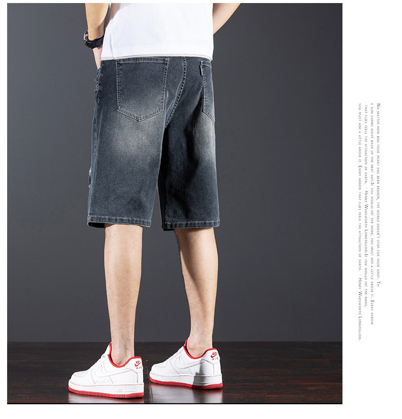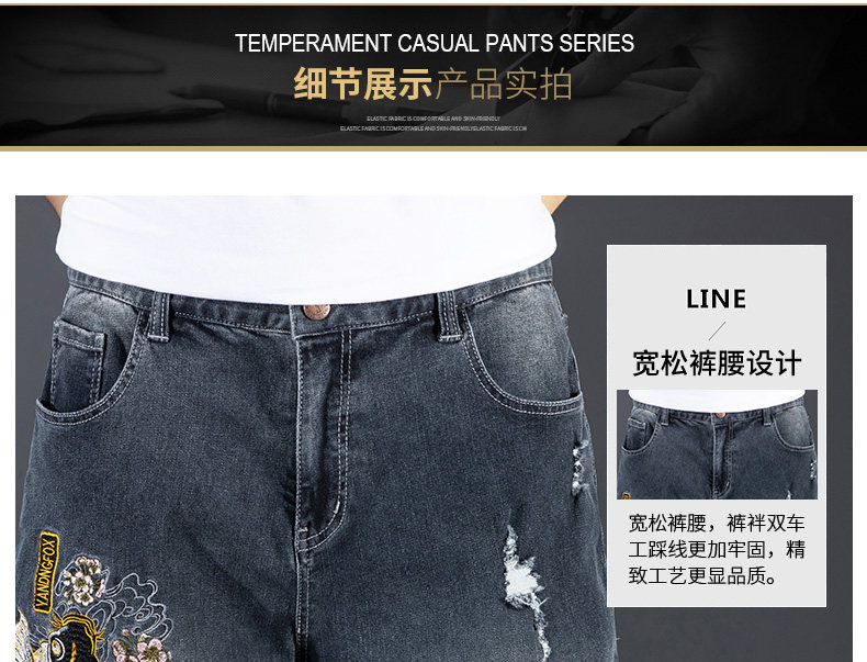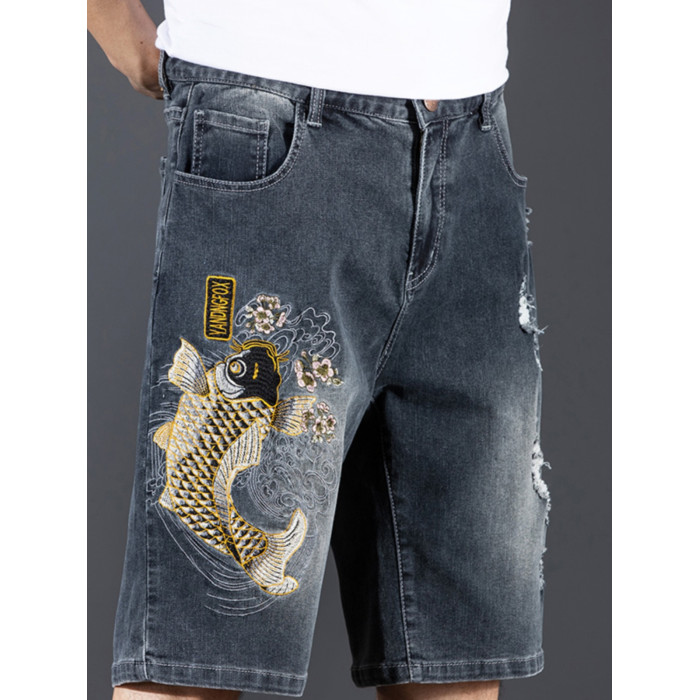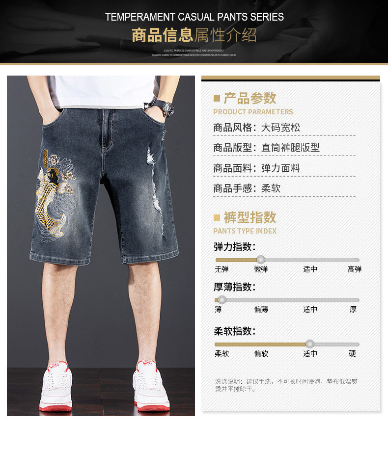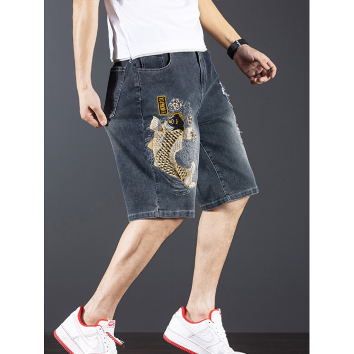 新中式國潮刺綉牛仔短褲男士五分中褲彈力寬鬆破洞潮牌大碼綉花款