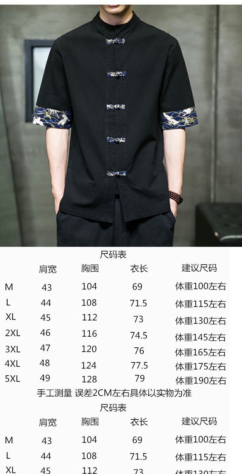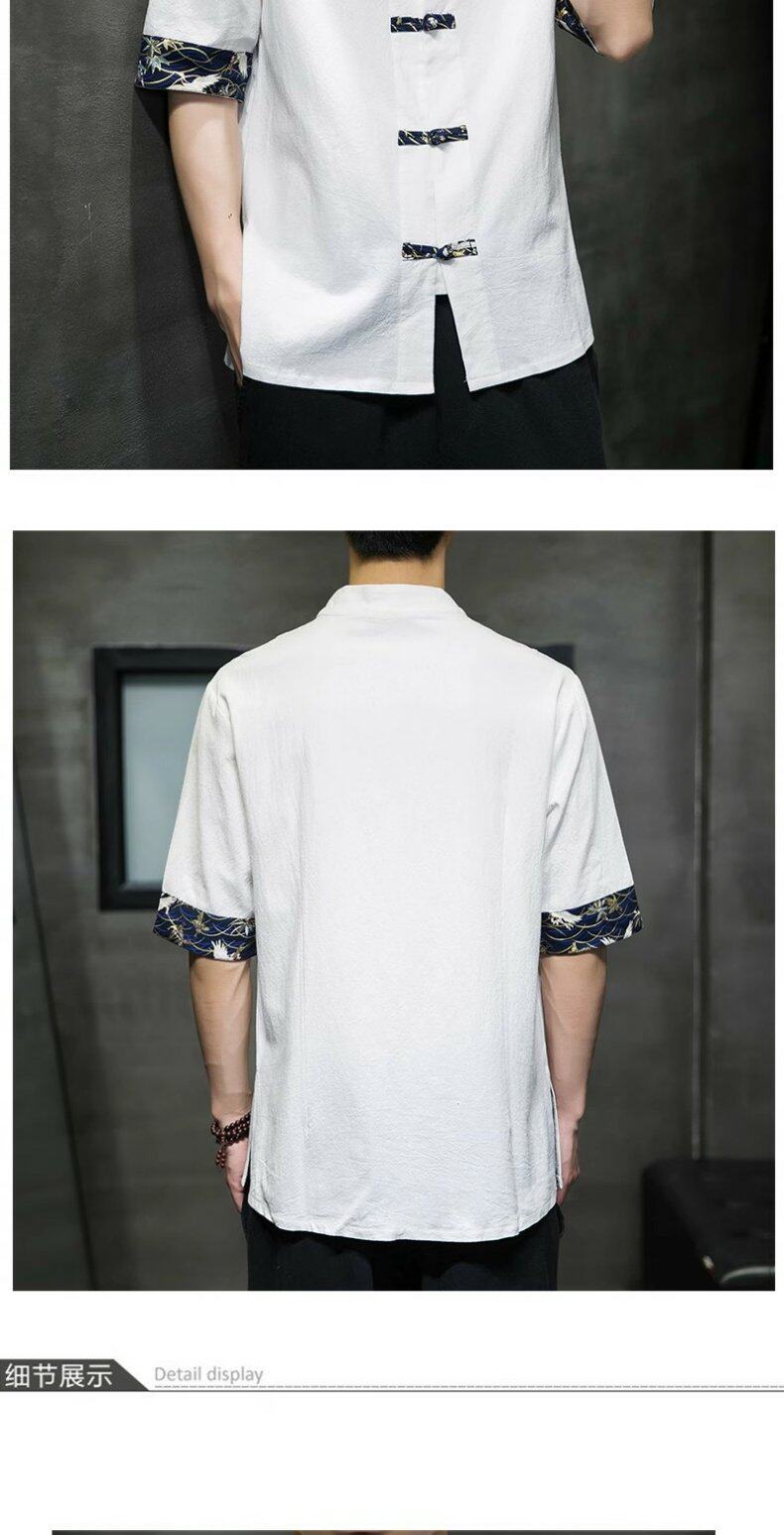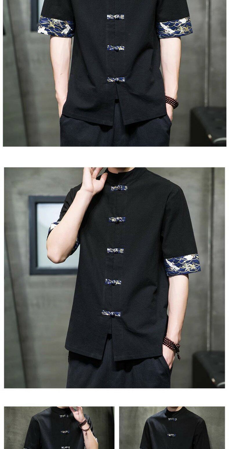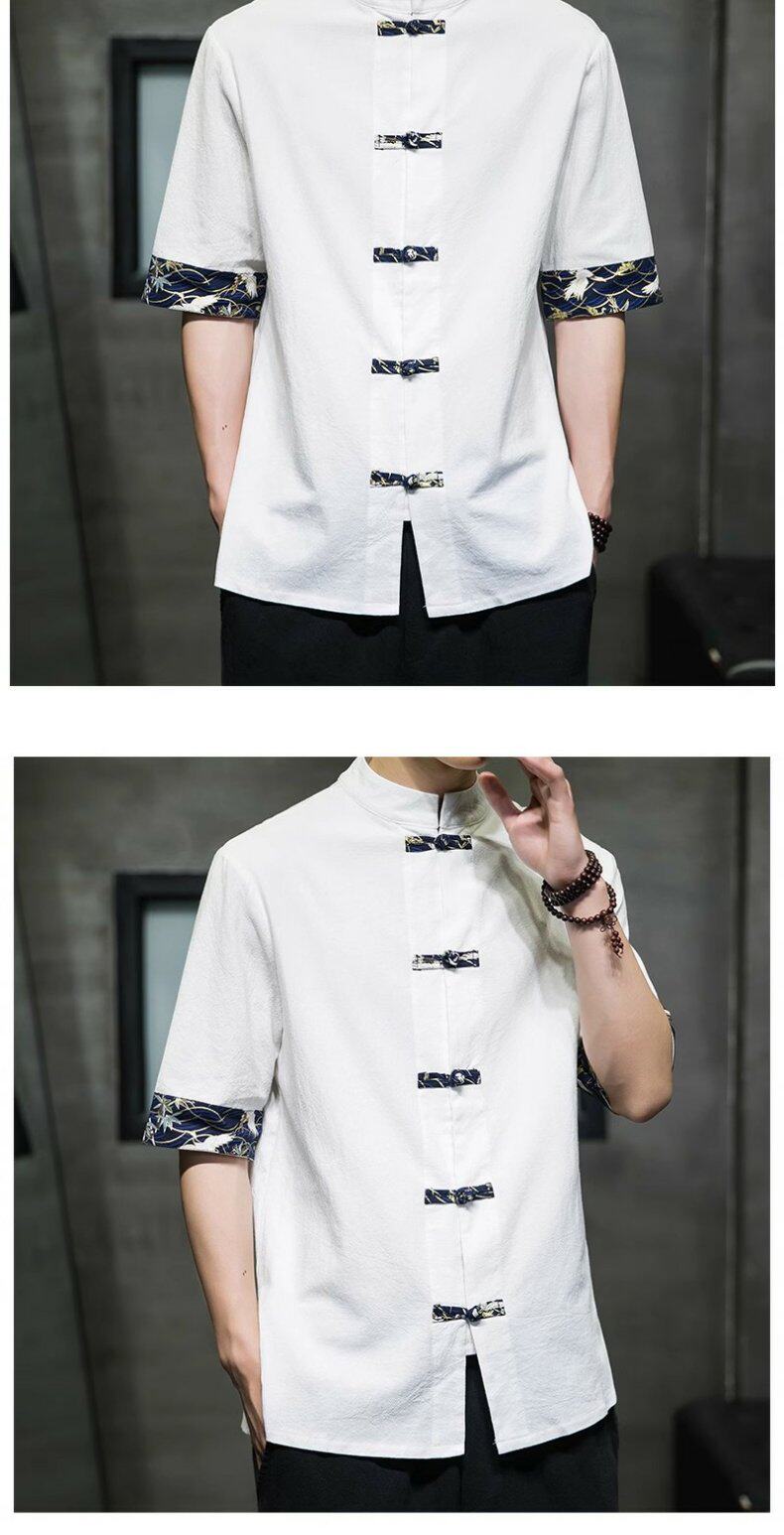 風夏季短袖襯衫男印花撞色盤釦唐裝漢服寬鬆大碼復古棉麻襯衣