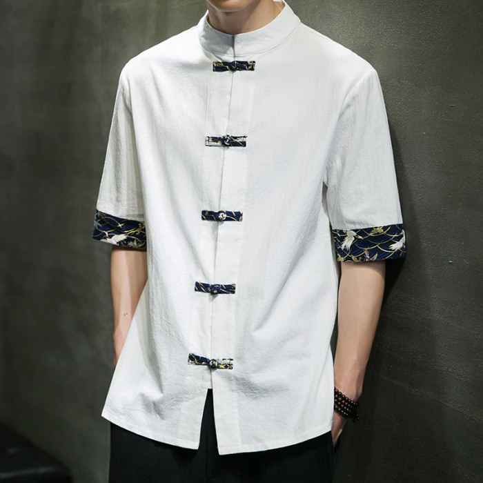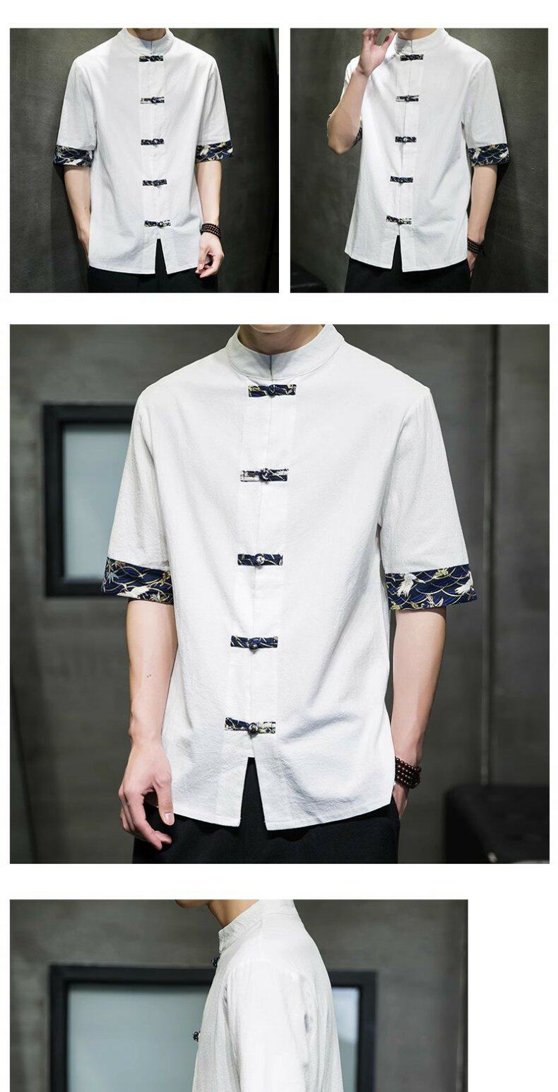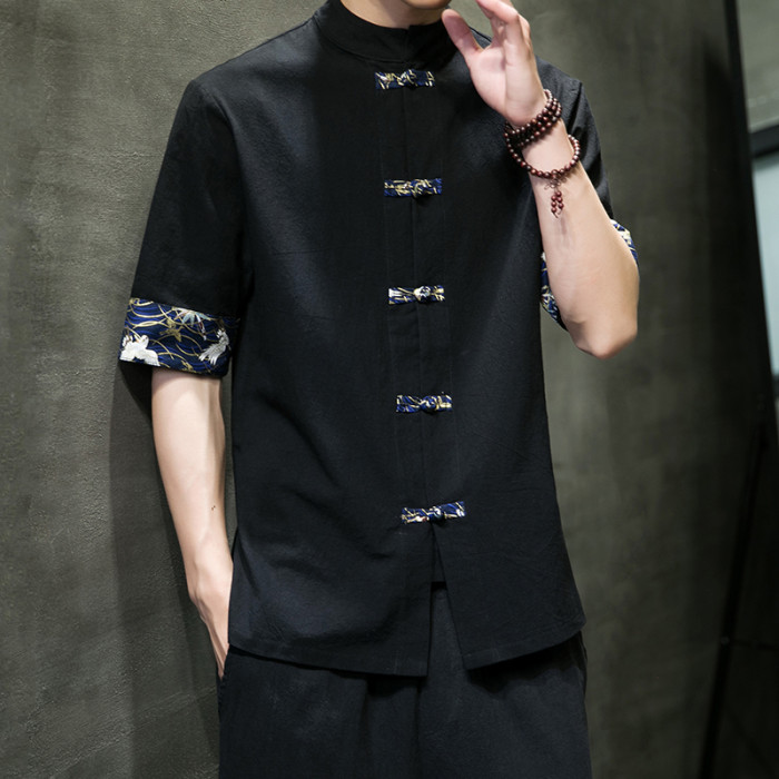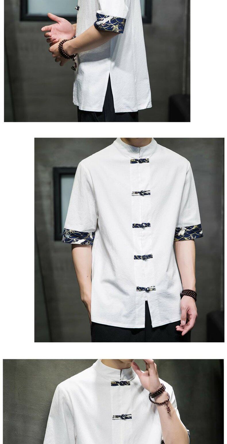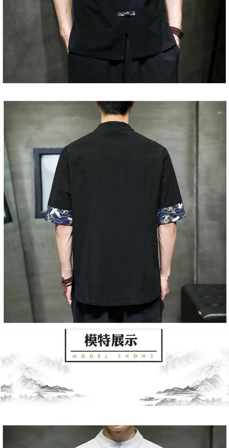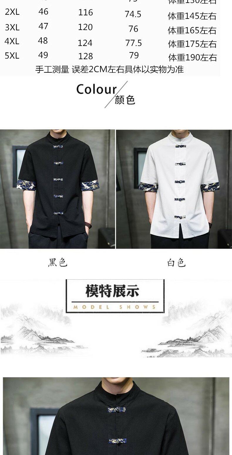 風夏季短袖襯衫男印花撞色盤釦唐裝漢服寬鬆大碼復古棉麻襯衣