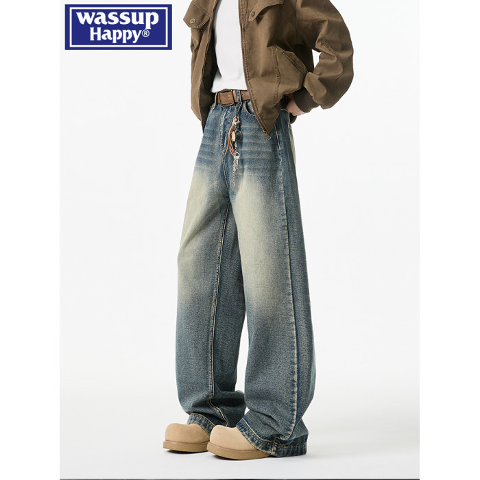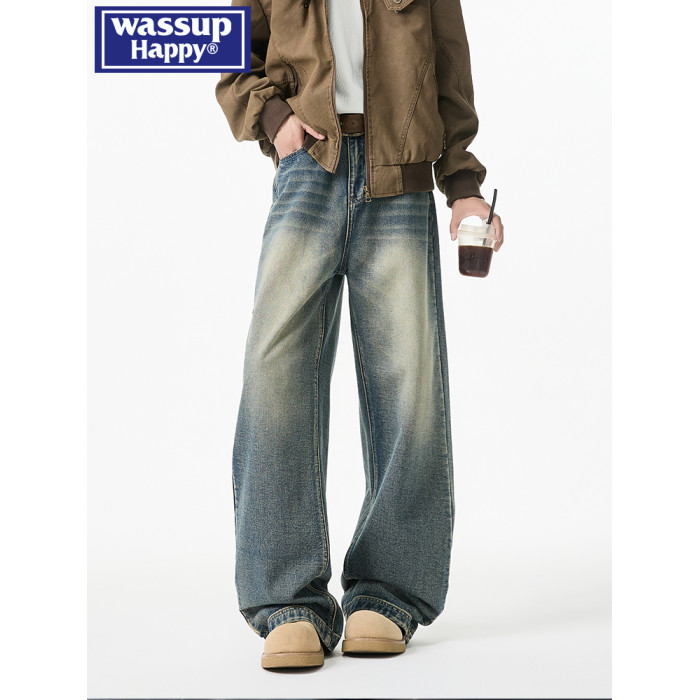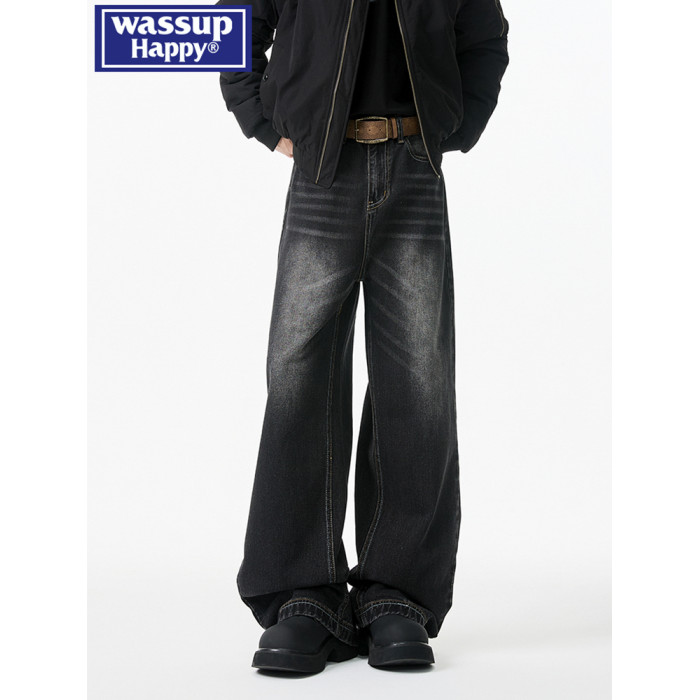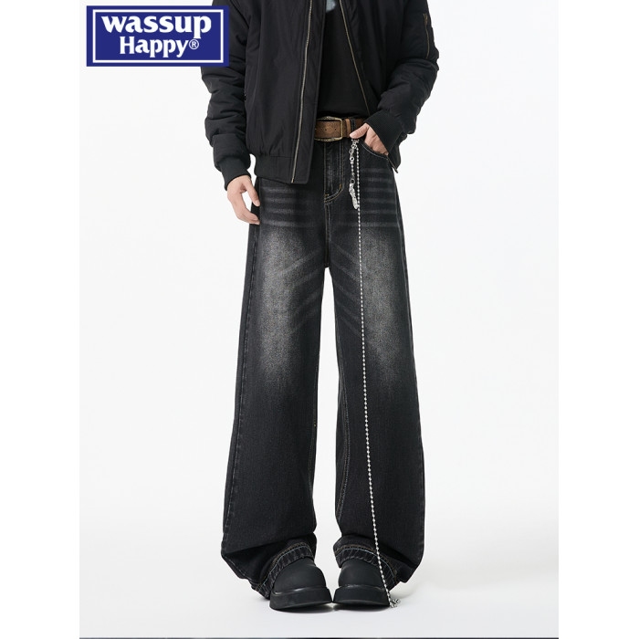 wassup happy牛仔褲男款春秋冬潮牌痞帥水洗直筒加絨大碼濶腿長褲