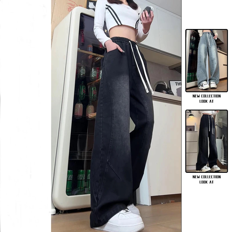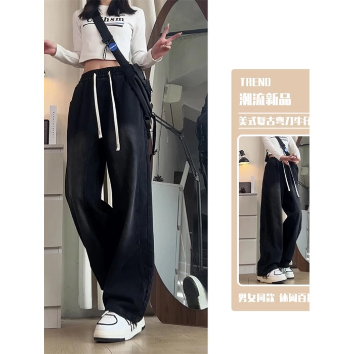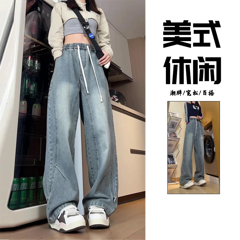 藍色松緊腰微喇牛仔褲男女款秋季美式水洗復古褲子直筒濶腿彎刀褲