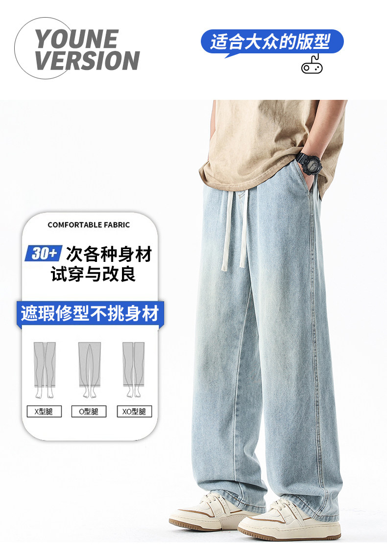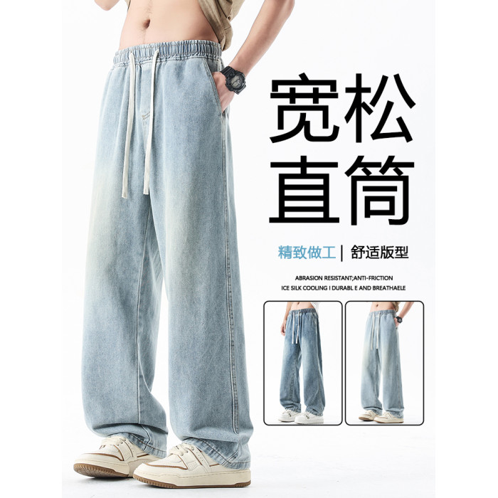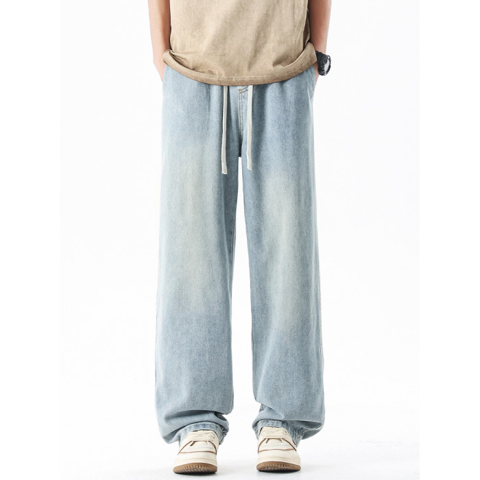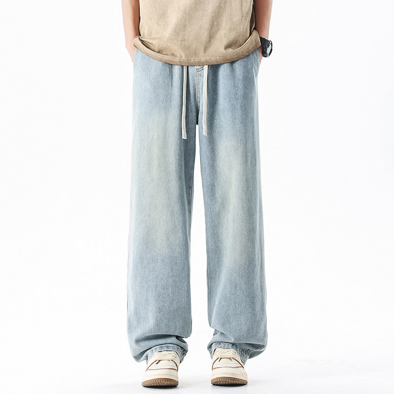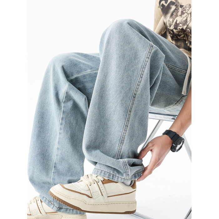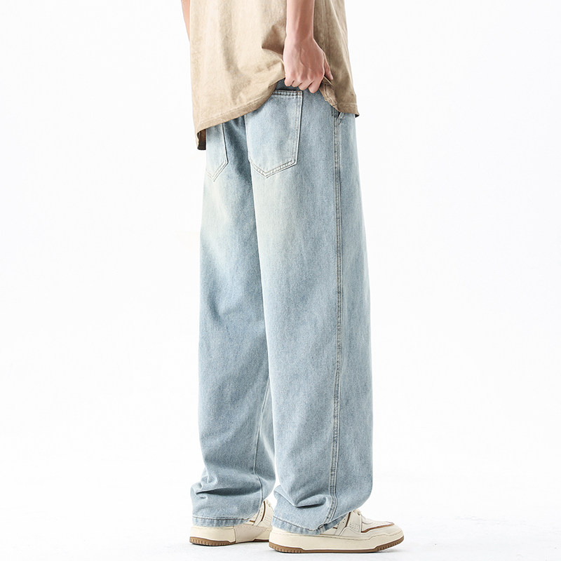 淺藍色牛仔褲男秋冬新款直筒寬鬆濶腿男生美式潮牌百搭青少年褲子