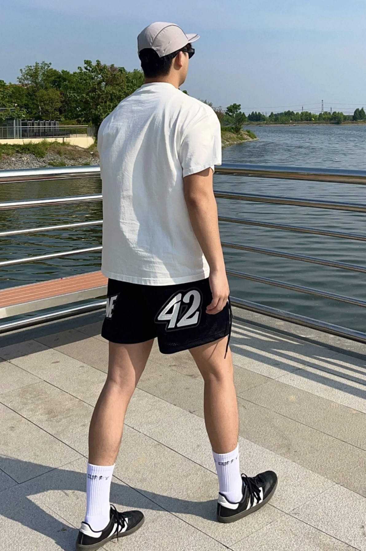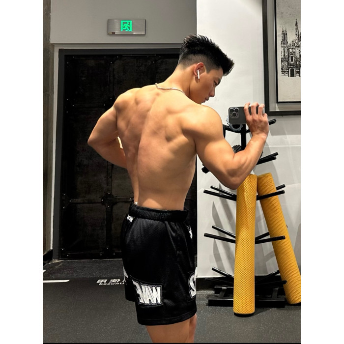 美式復古貼布刺綉圖案美式短褲夏季雙層網眼透氣抽繩四分運動褲潮