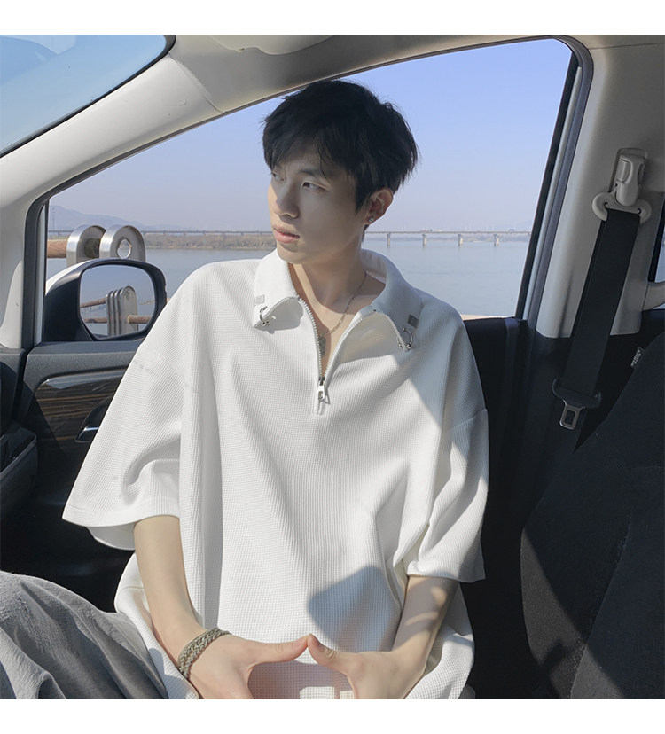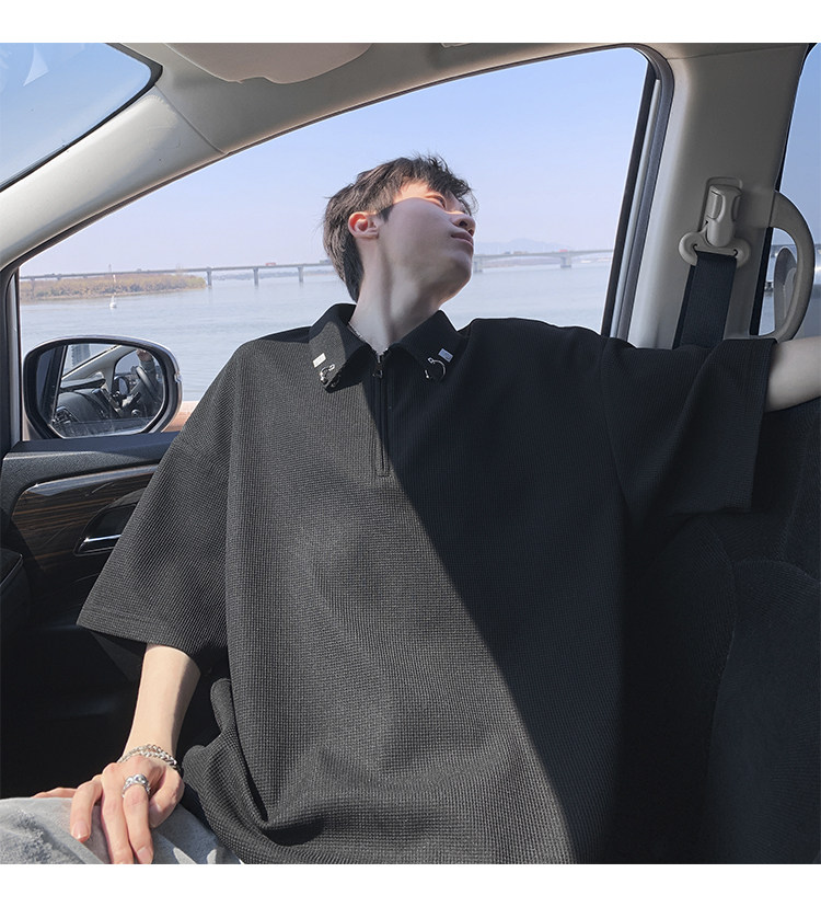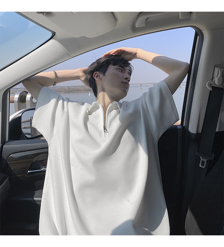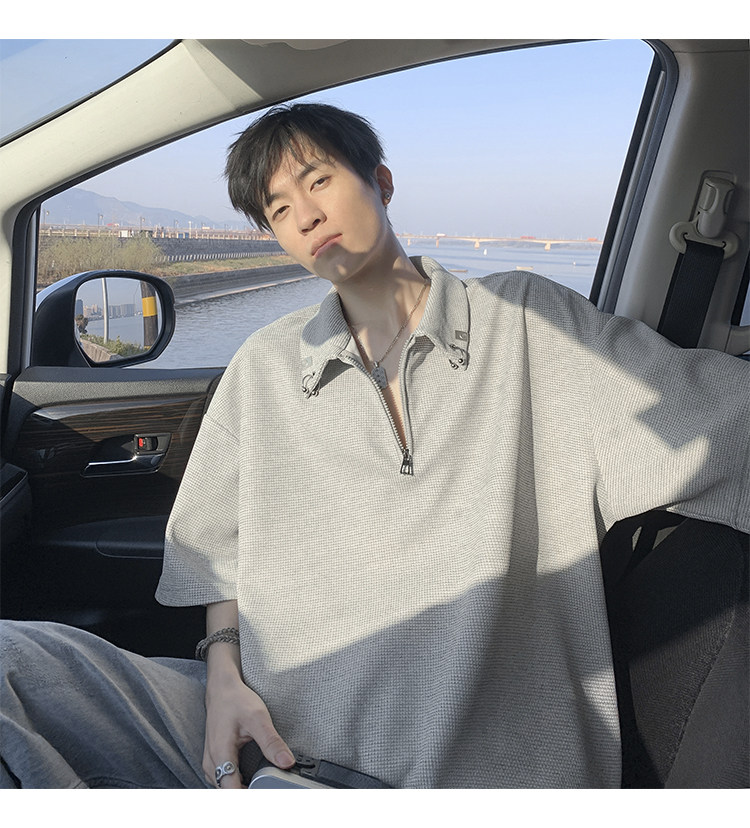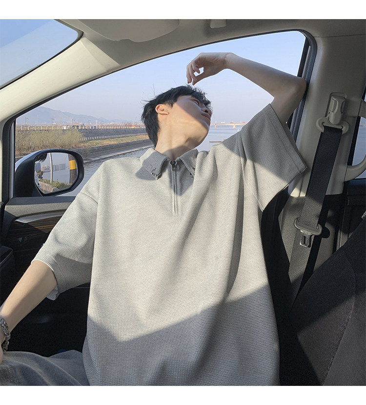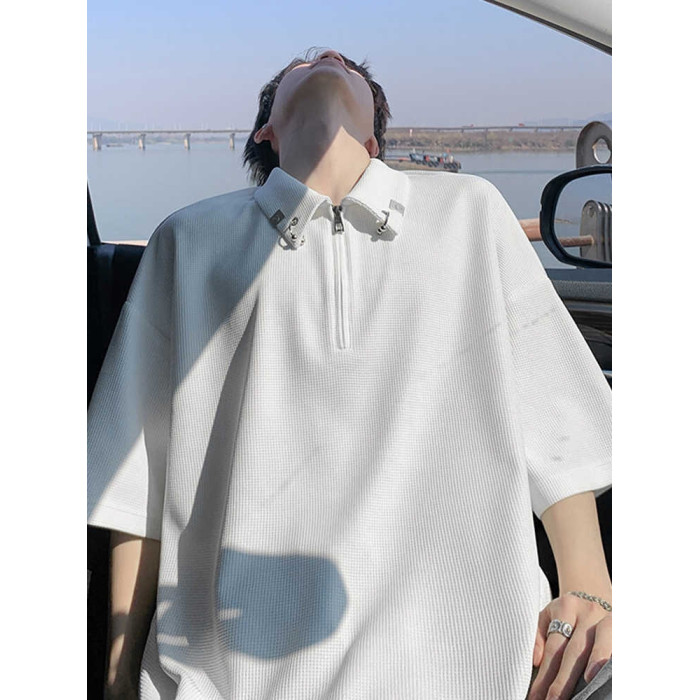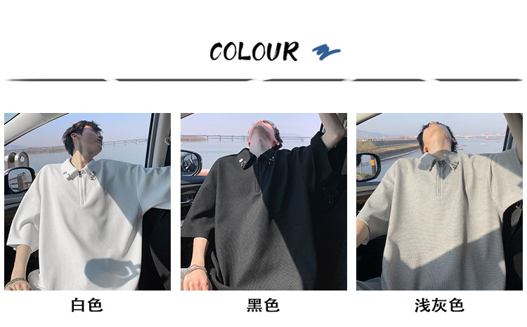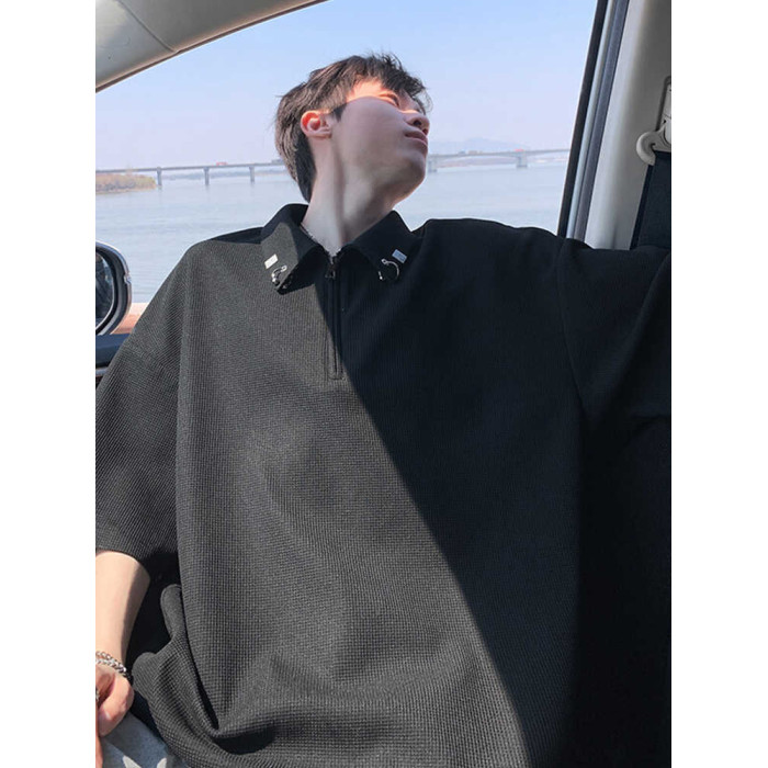 半拉鍊華夫格短袖polo衫男夏季潮牌美式衣服寬鬆潮流重磅半袖t恤