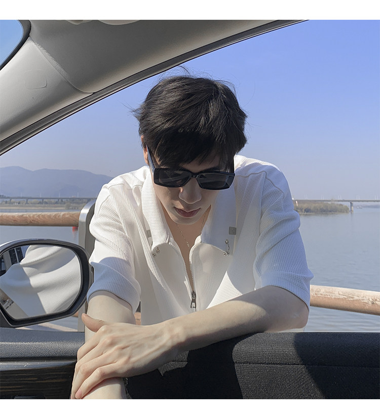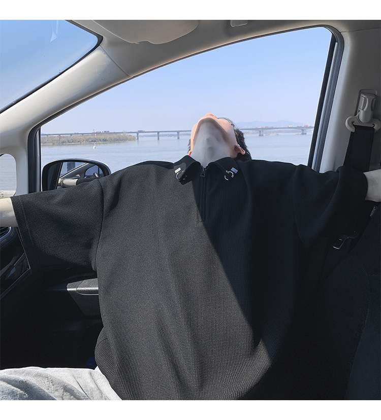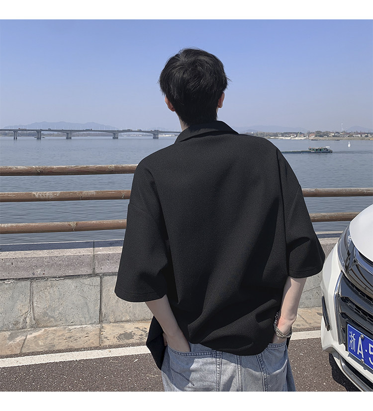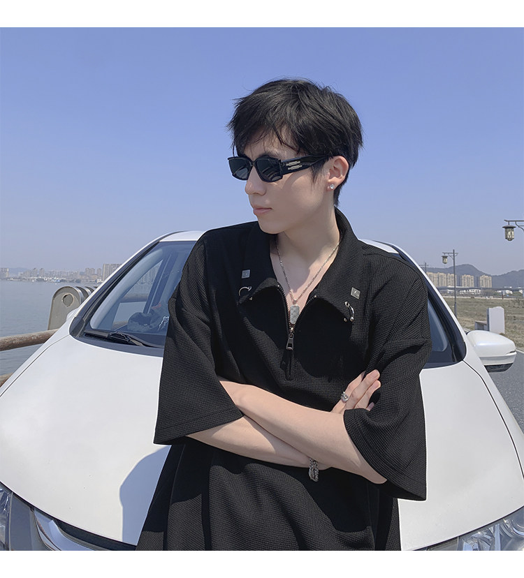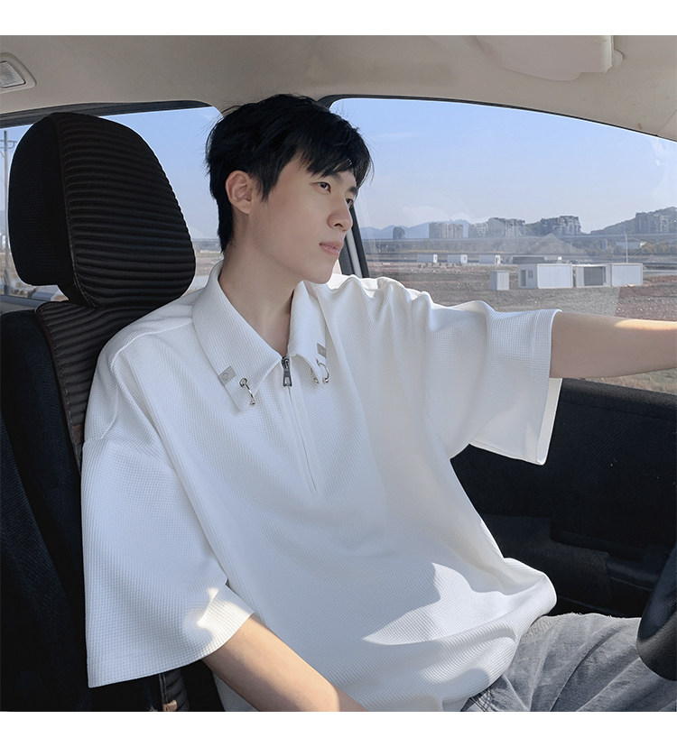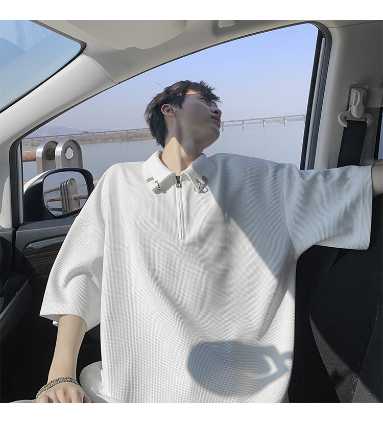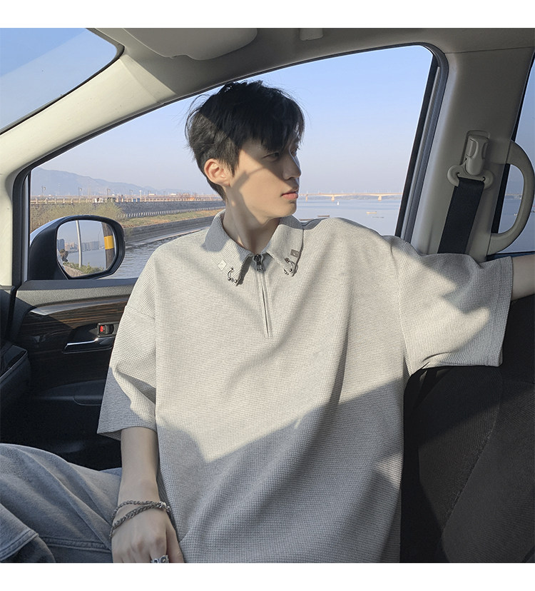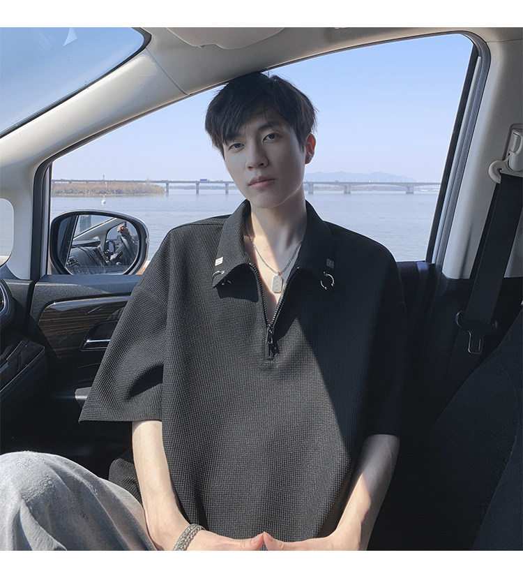 半拉鍊華夫格短袖polo衫男夏季潮牌美式衣服寬鬆潮流重磅半袖t恤