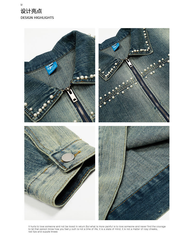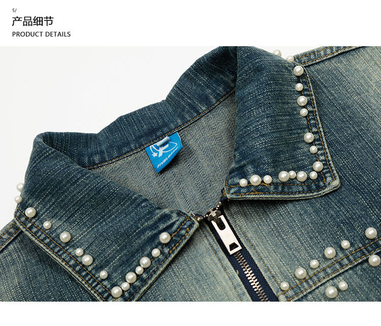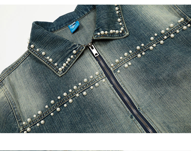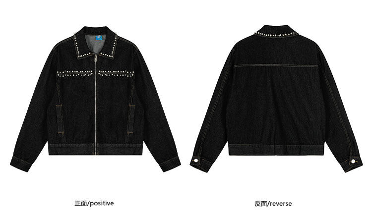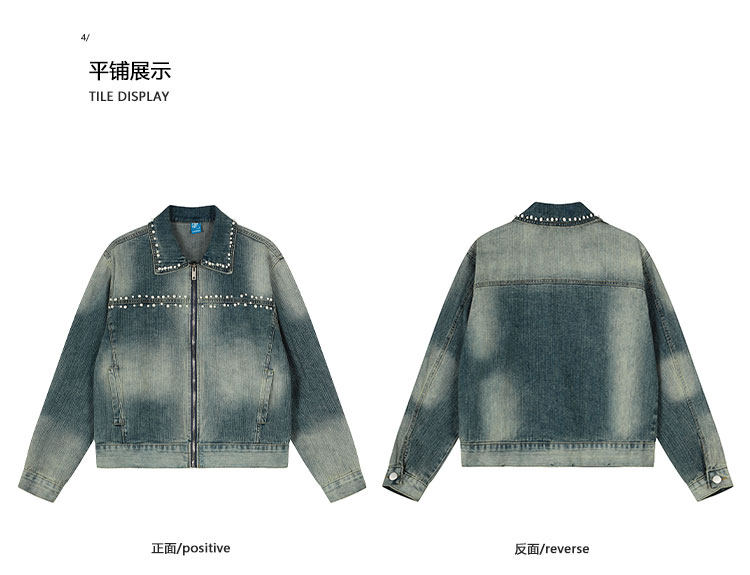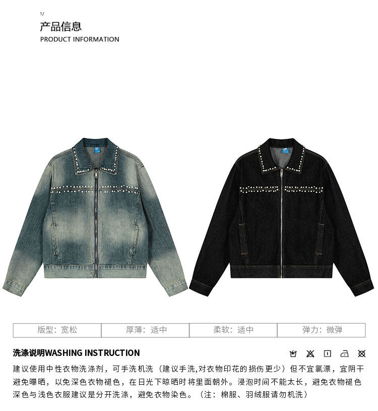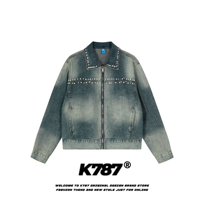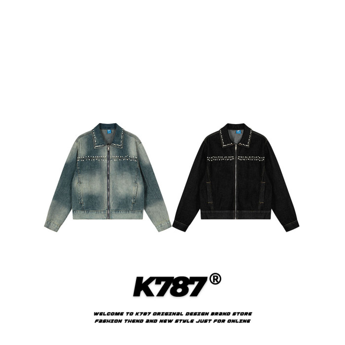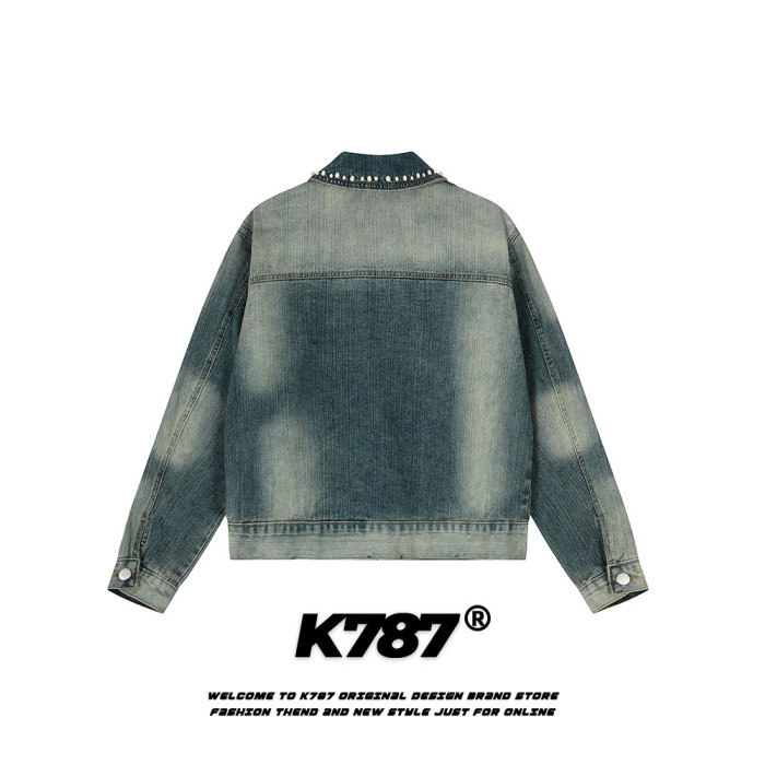 K787美式復古釘珠設計感明線水洗牛仔外套男女寬鬆百搭短款夾克潮