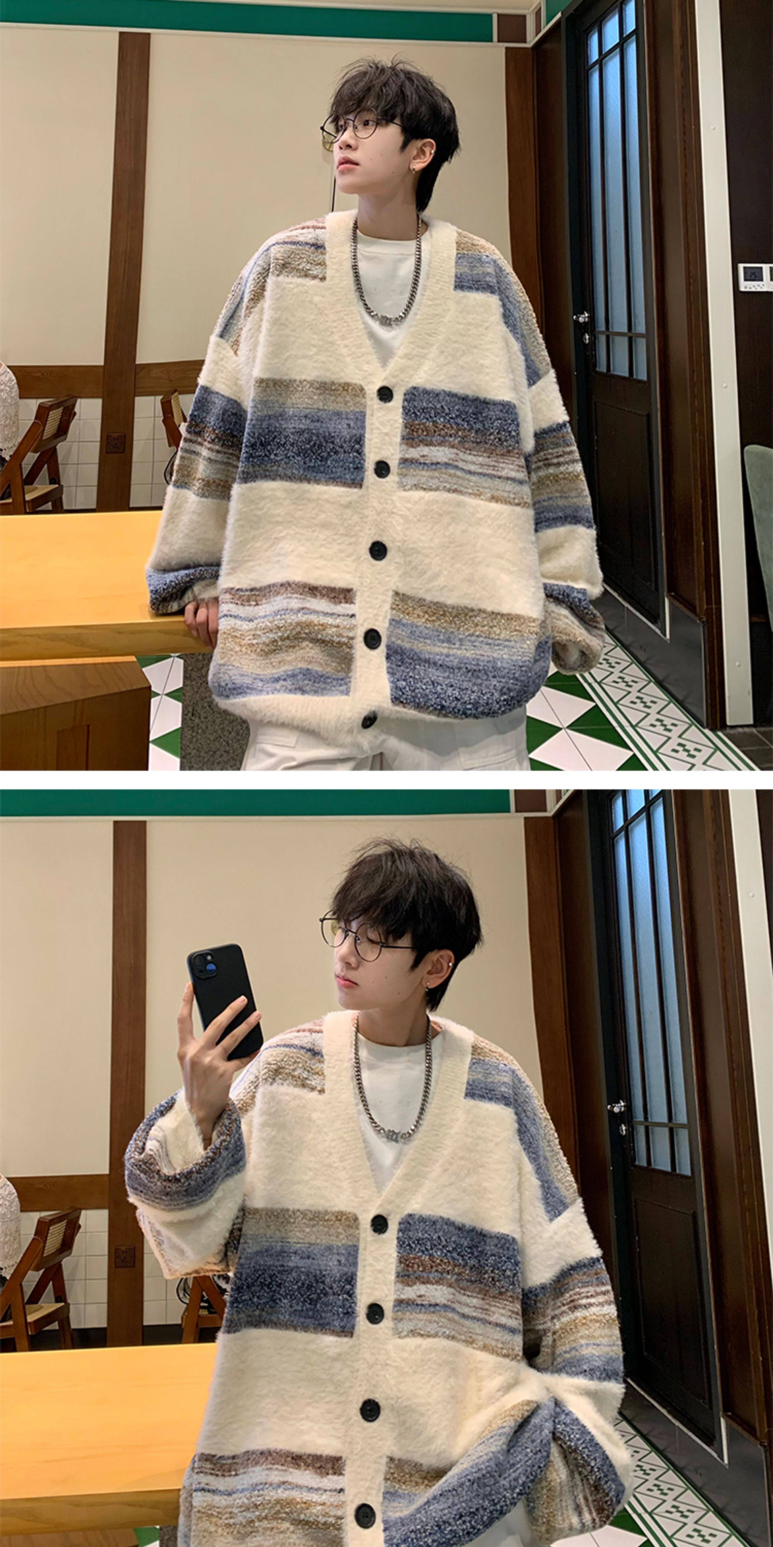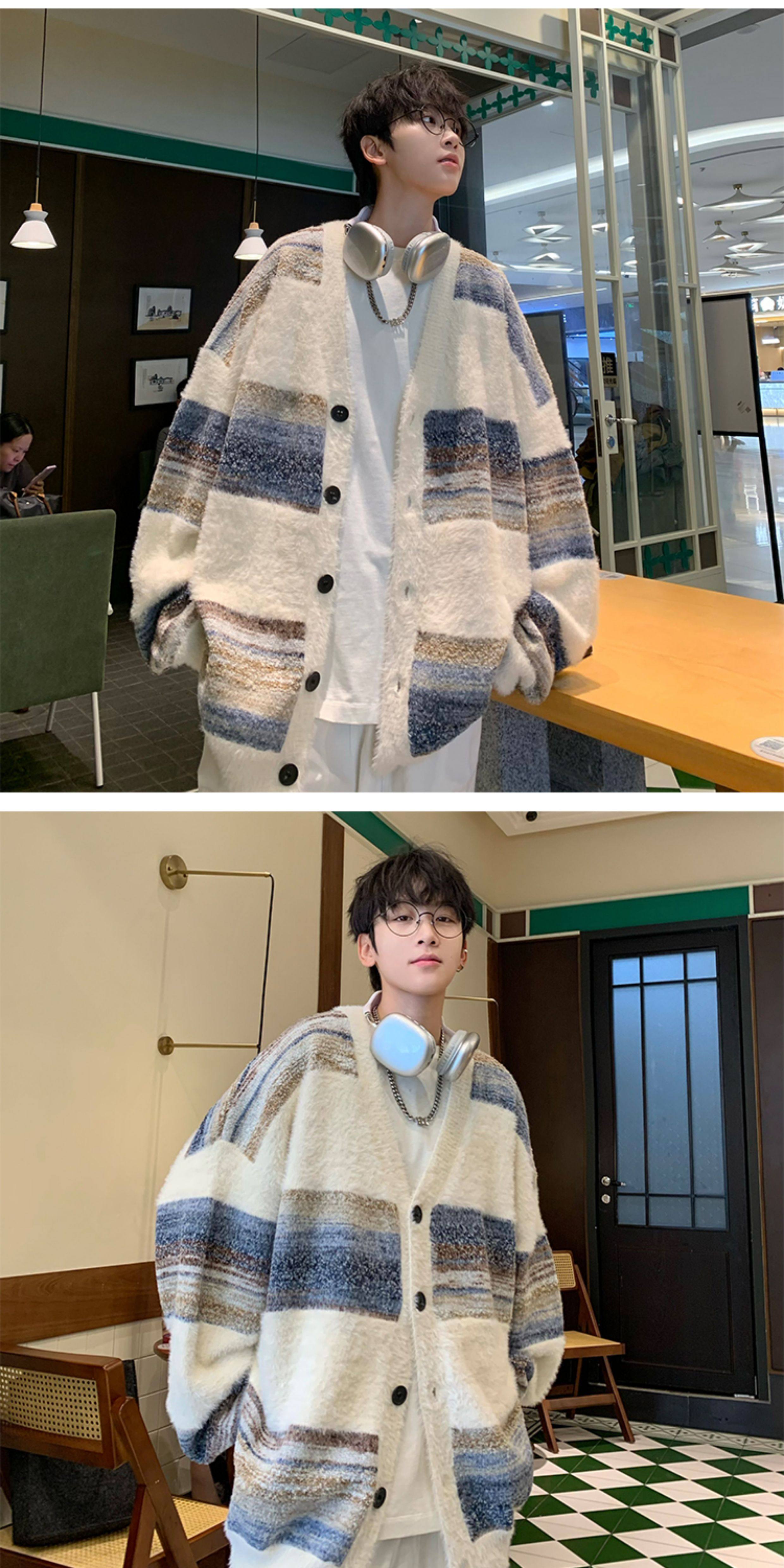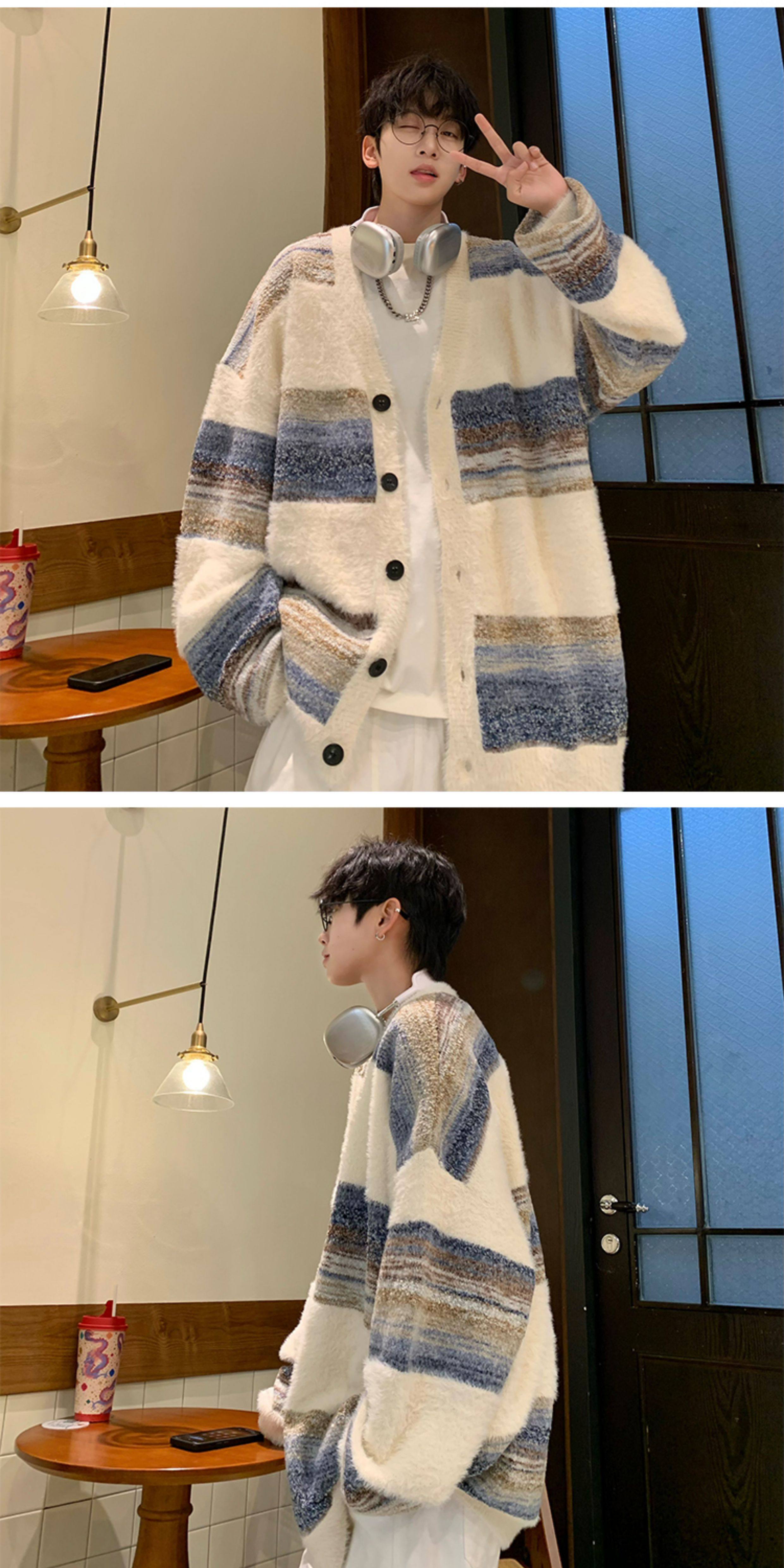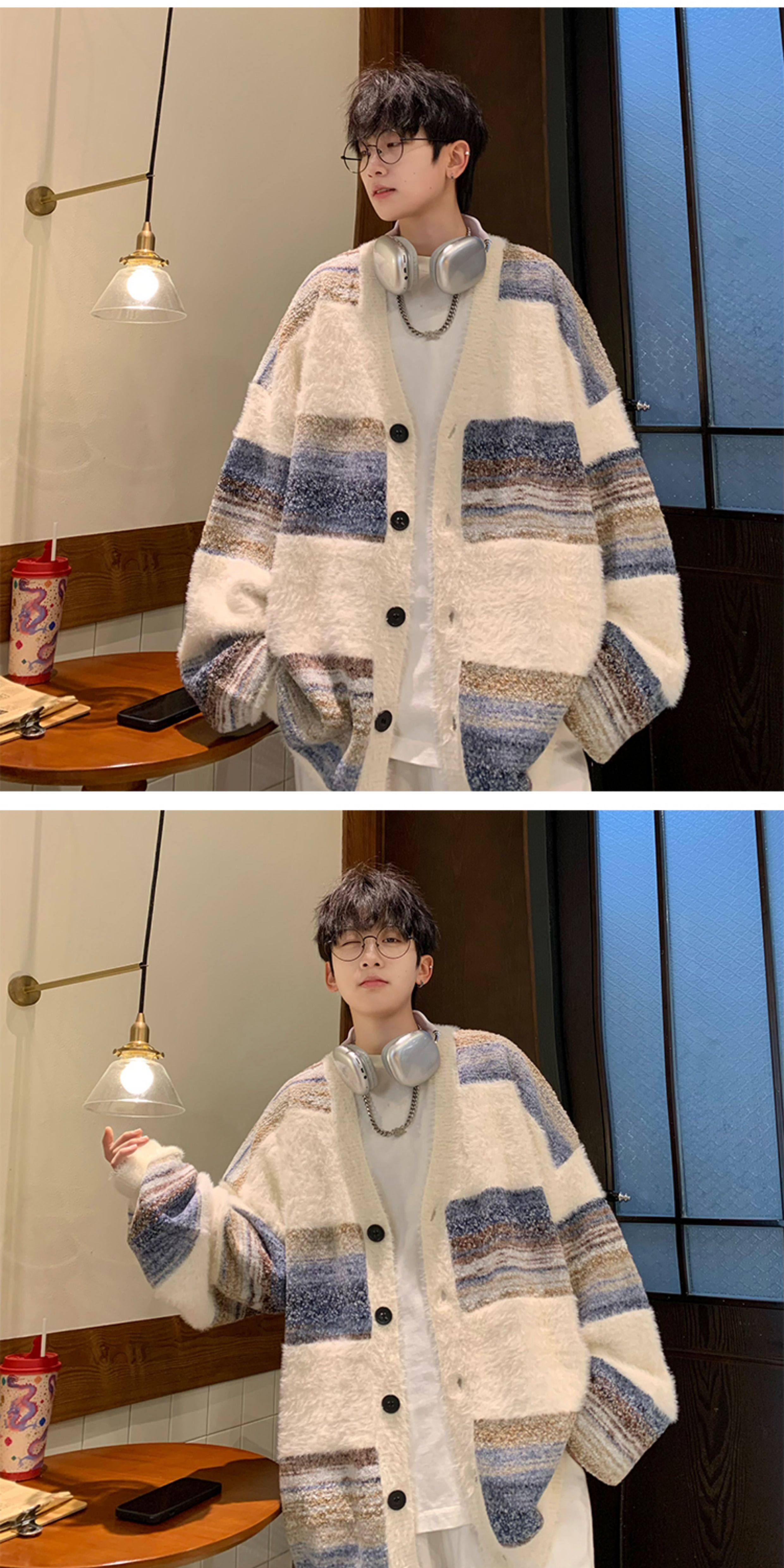 MISTERLIN丨美式復古慵懶風條紋開衫ins毛衣男潮牌針織衫情侶外套