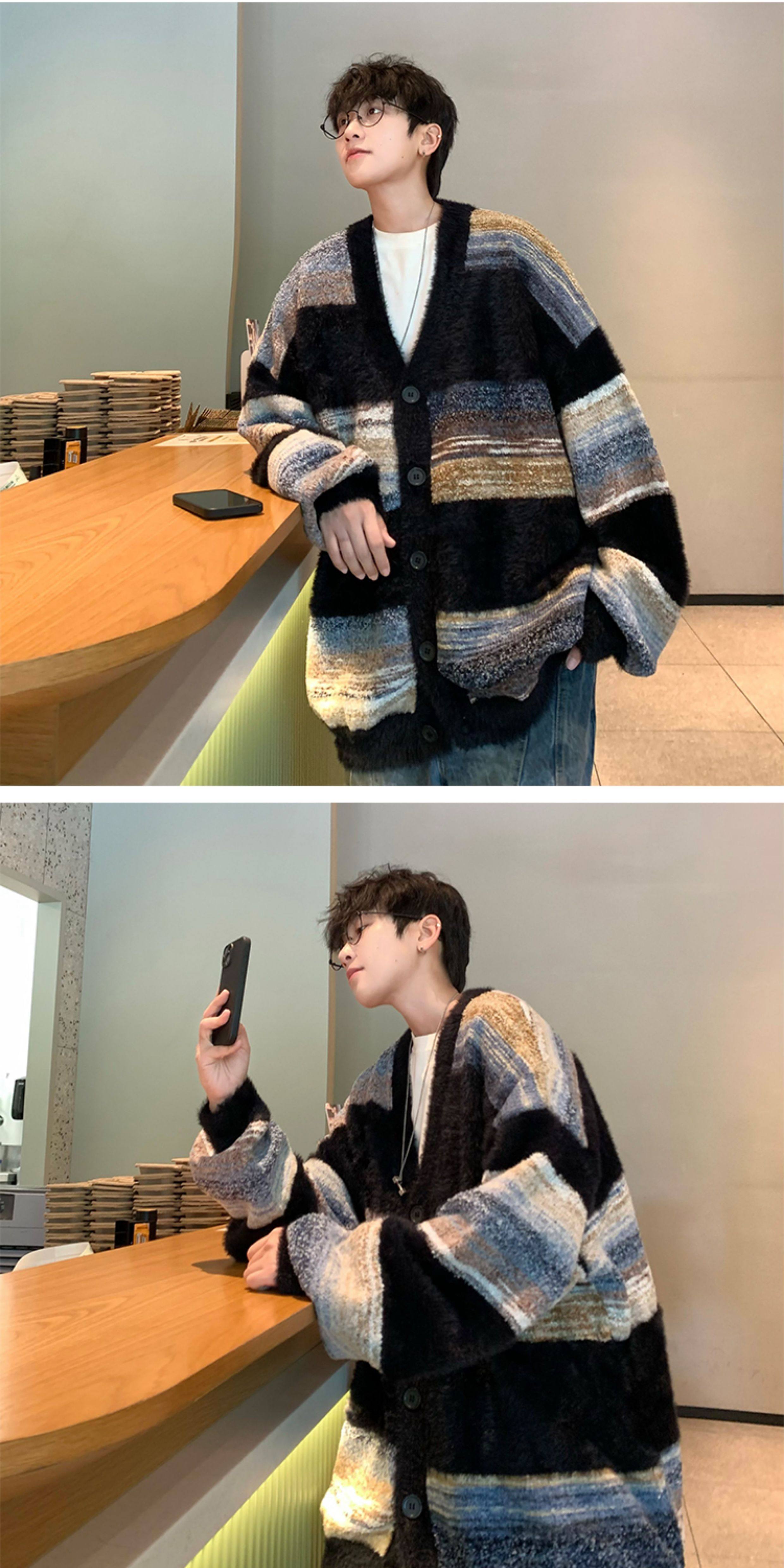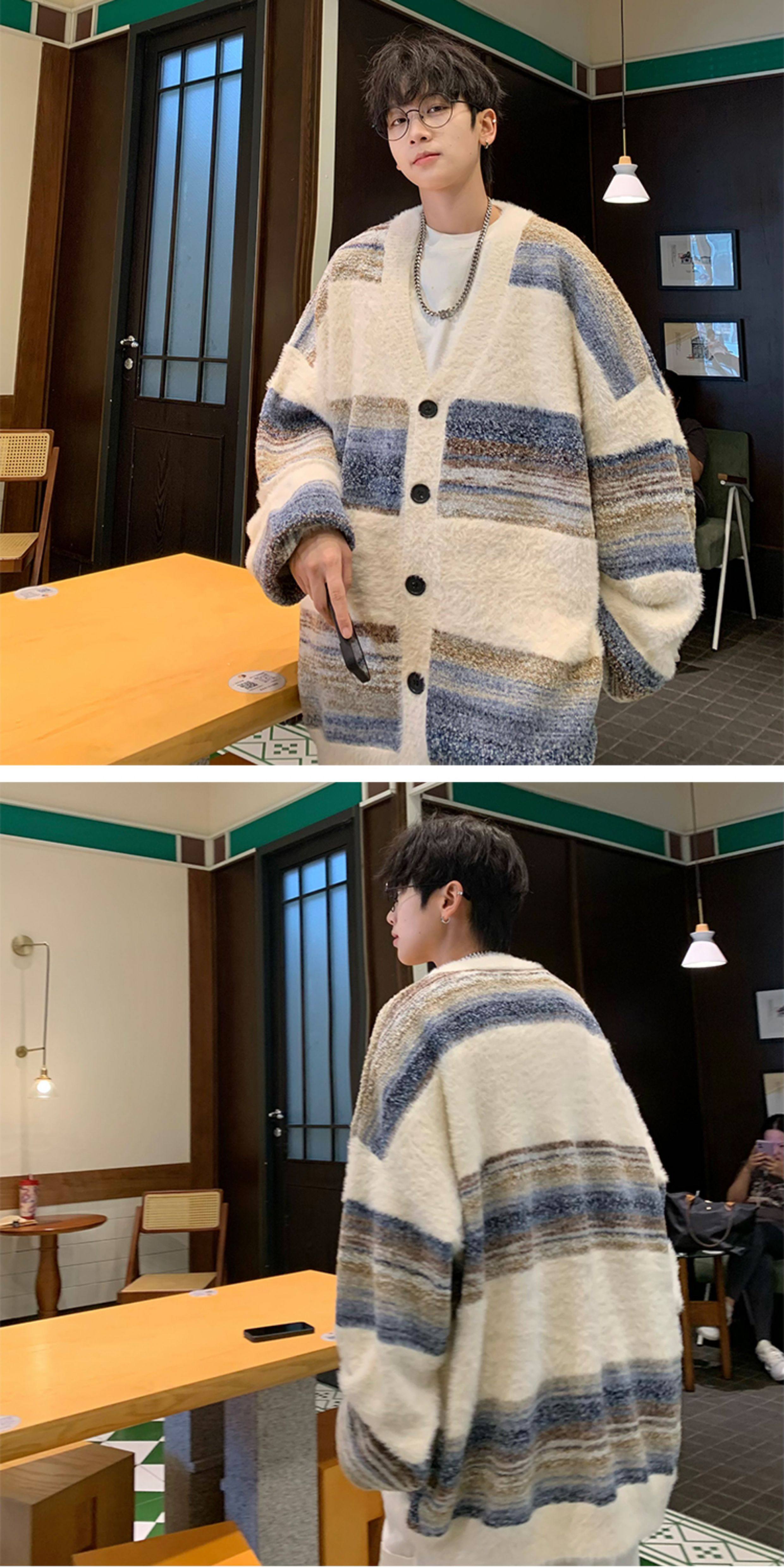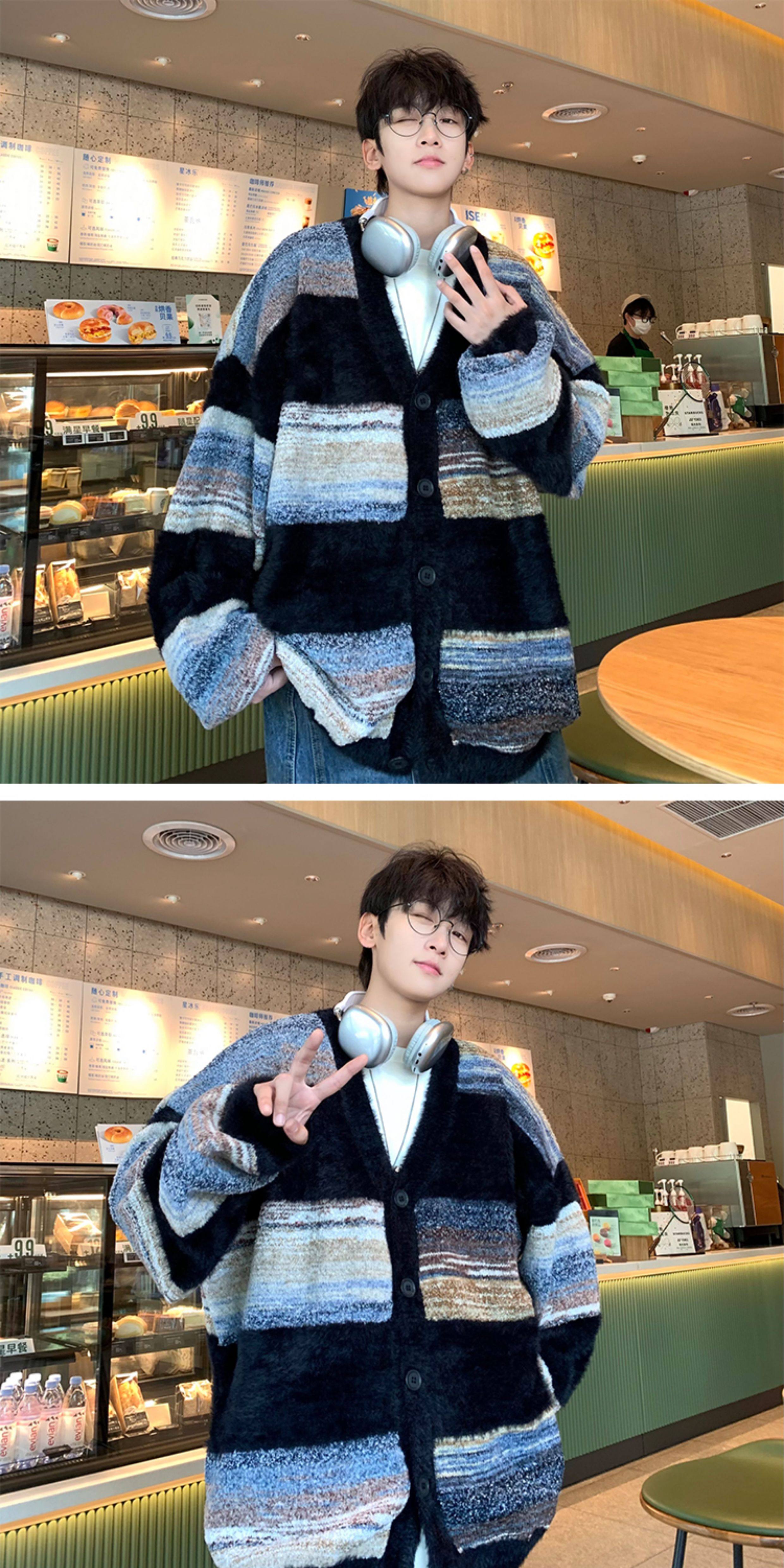 MISTERLIN丨美式復古慵懶風條紋開衫ins毛衣男潮牌針織衫情侶外套