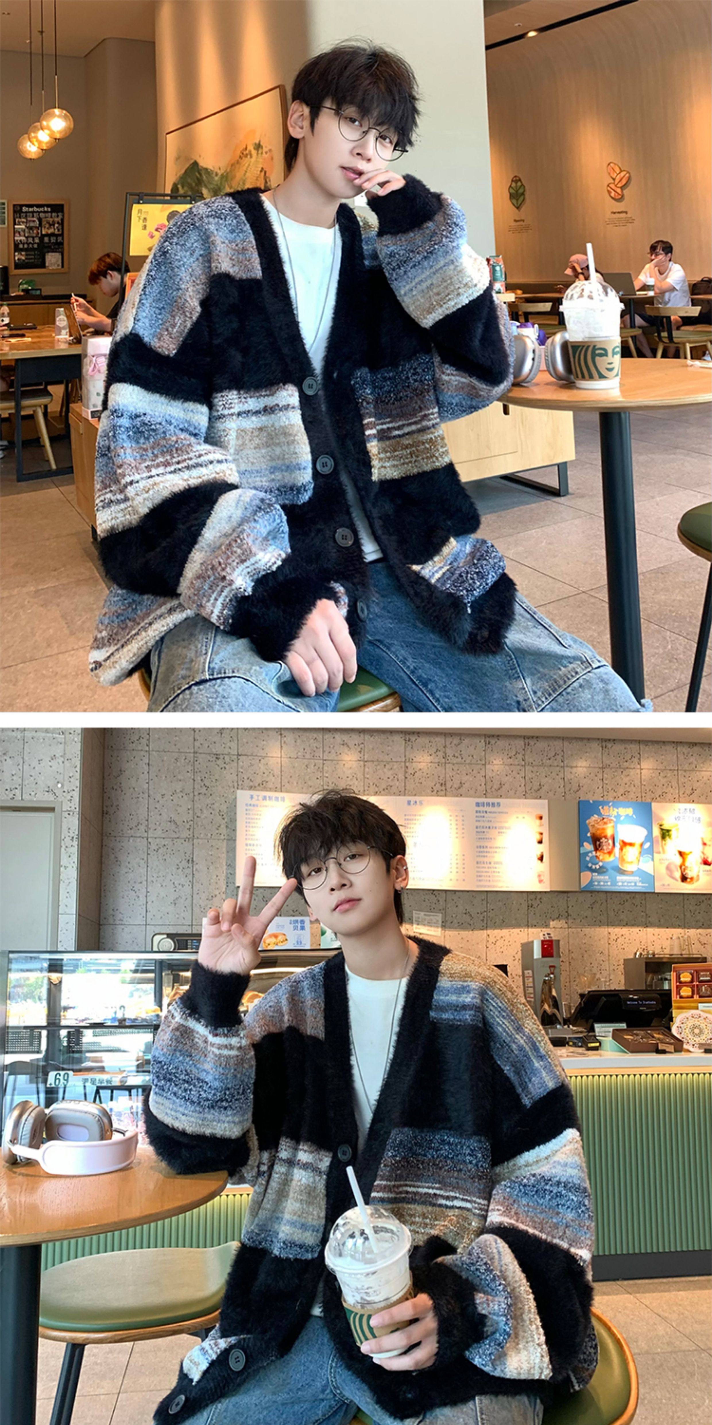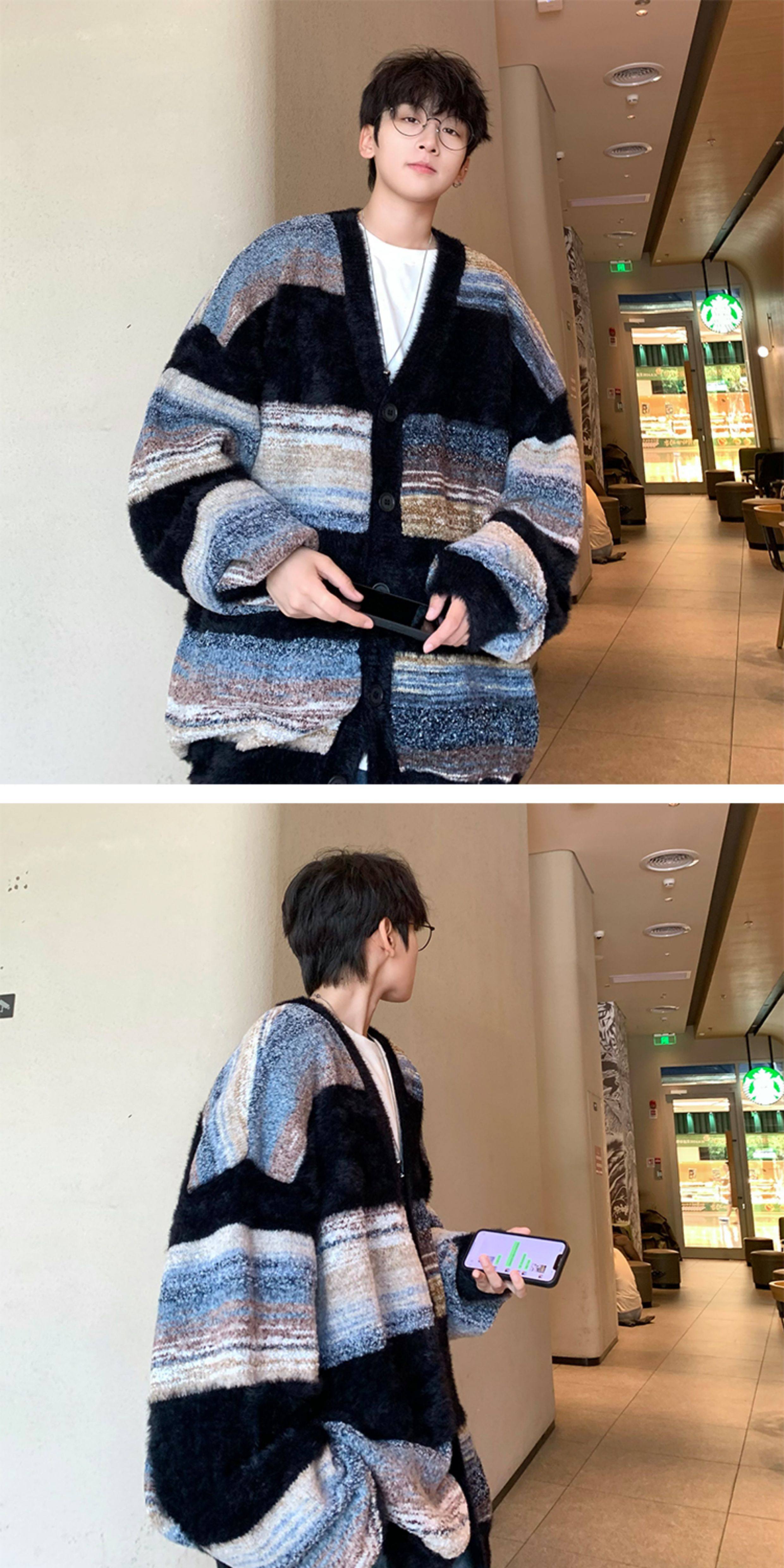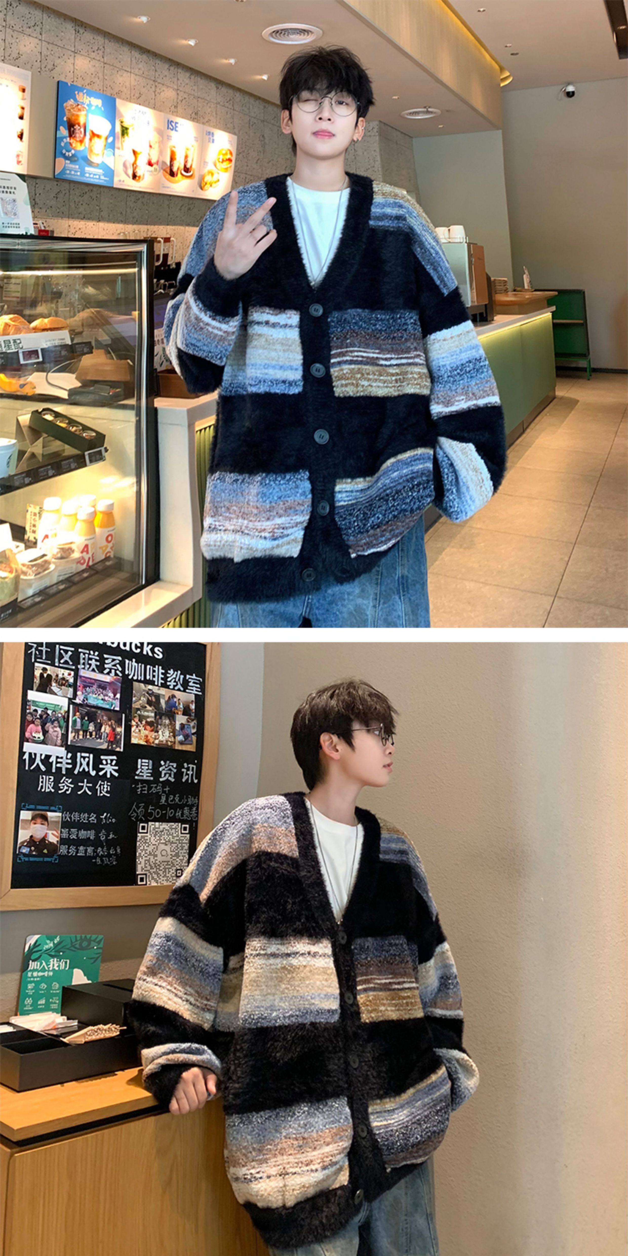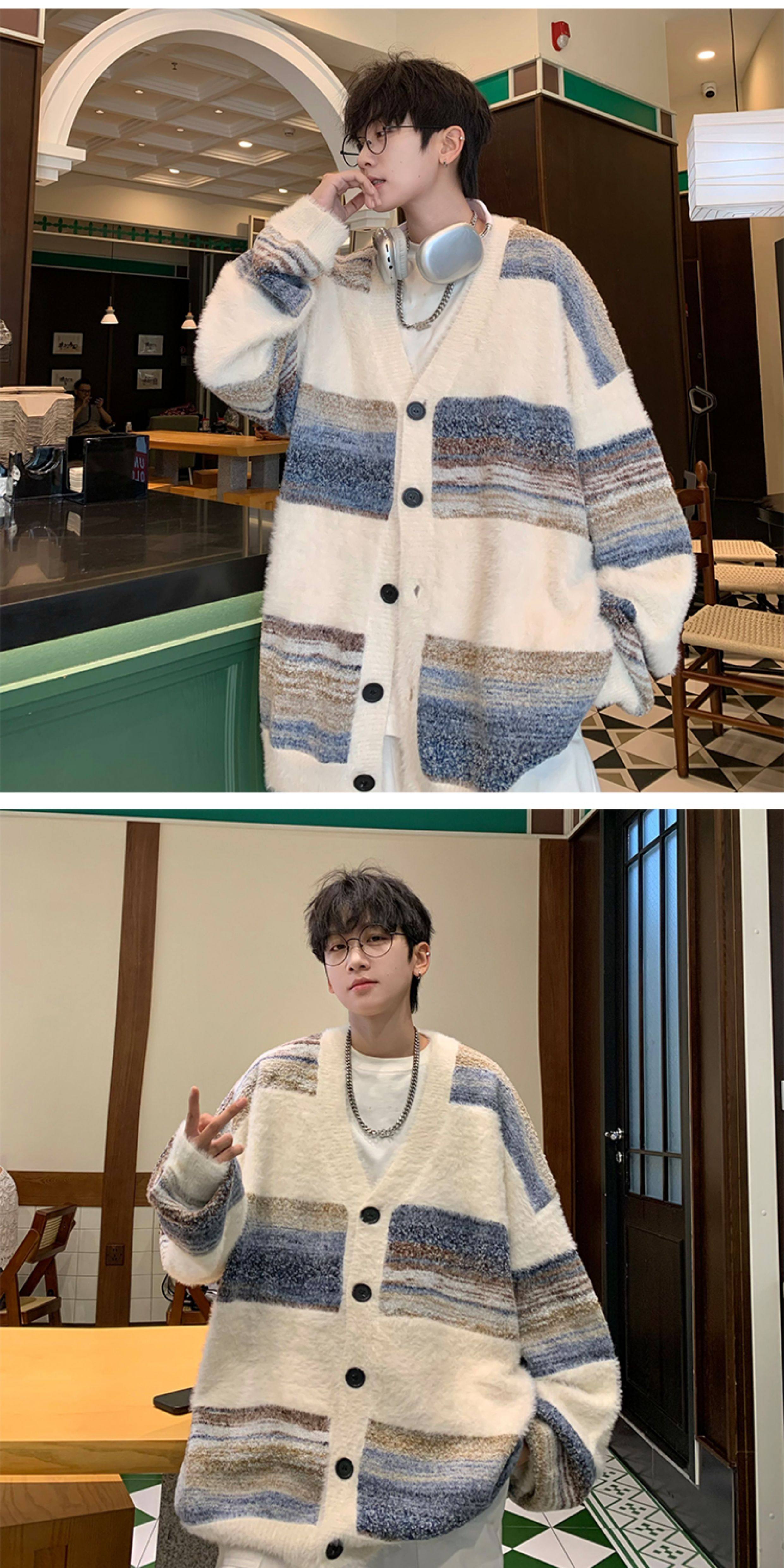 MISTERLIN丨美式復古慵懶風條紋開衫ins毛衣男潮牌針織衫情侶外套