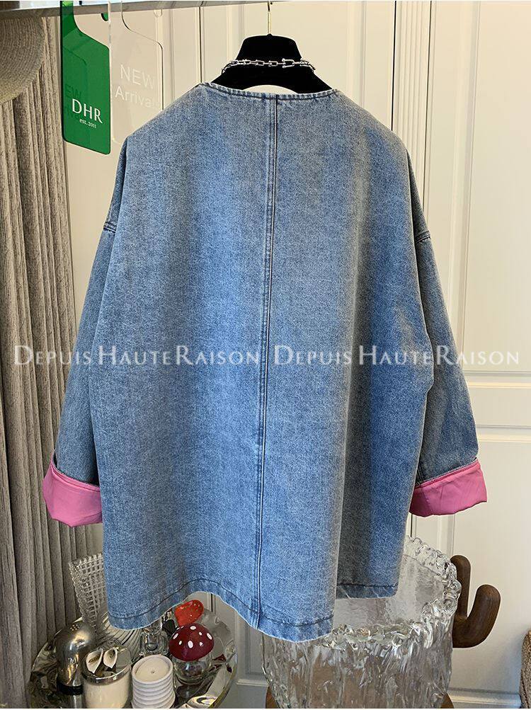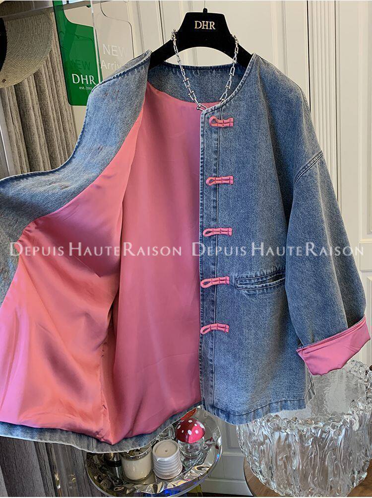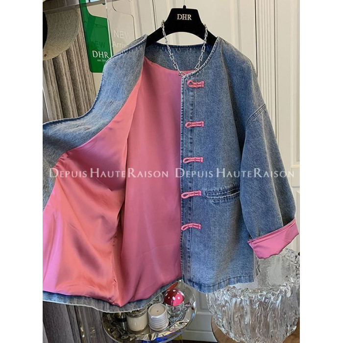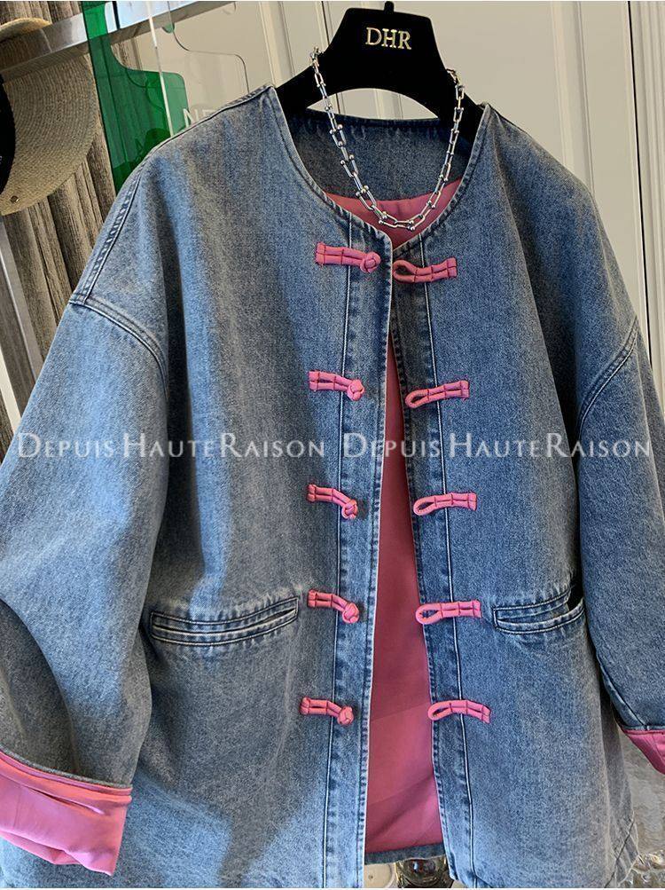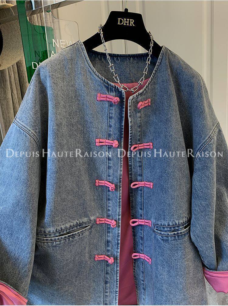 特大碼300斤歐貨撞色牛仔外套男女裝秋冬情侶新中式盤釦夾克上衣2