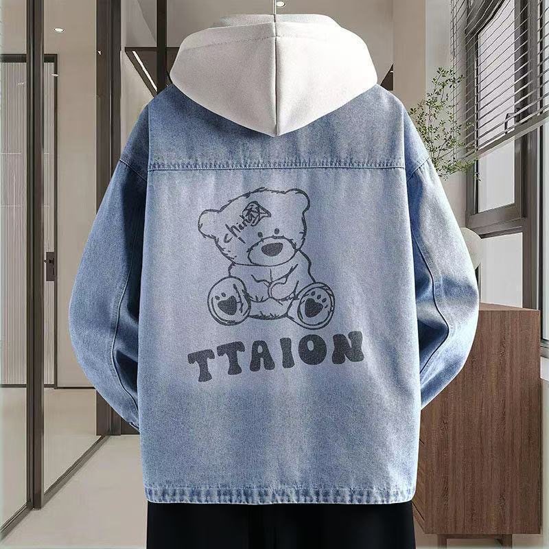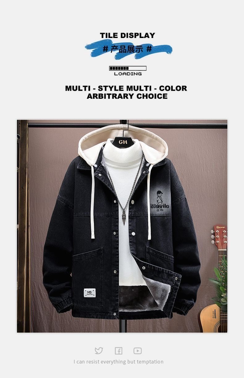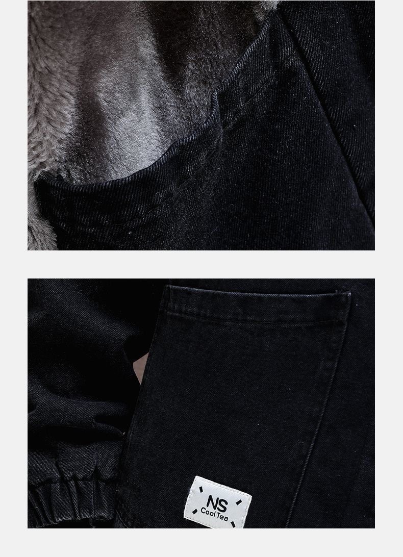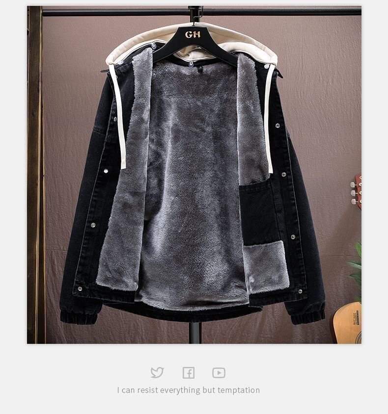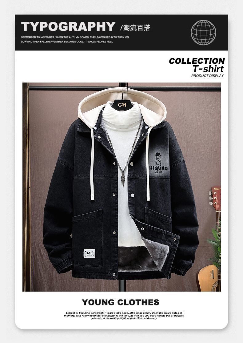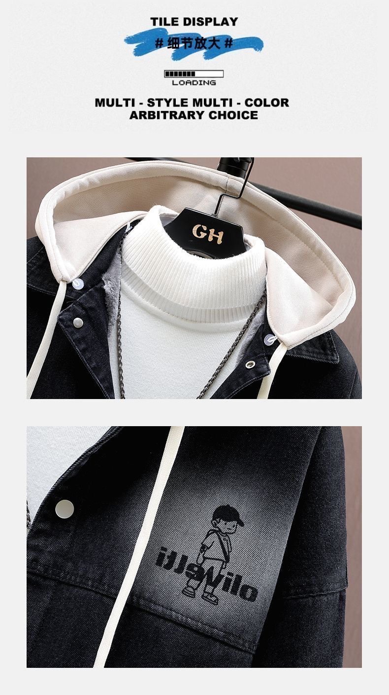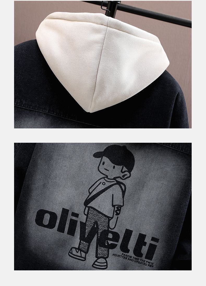 加絨加厚青少年連帽牛仔外套2025百搭寬鬆時尚耐磨潮港風寬鬆夾克