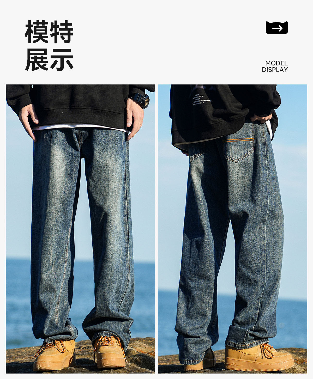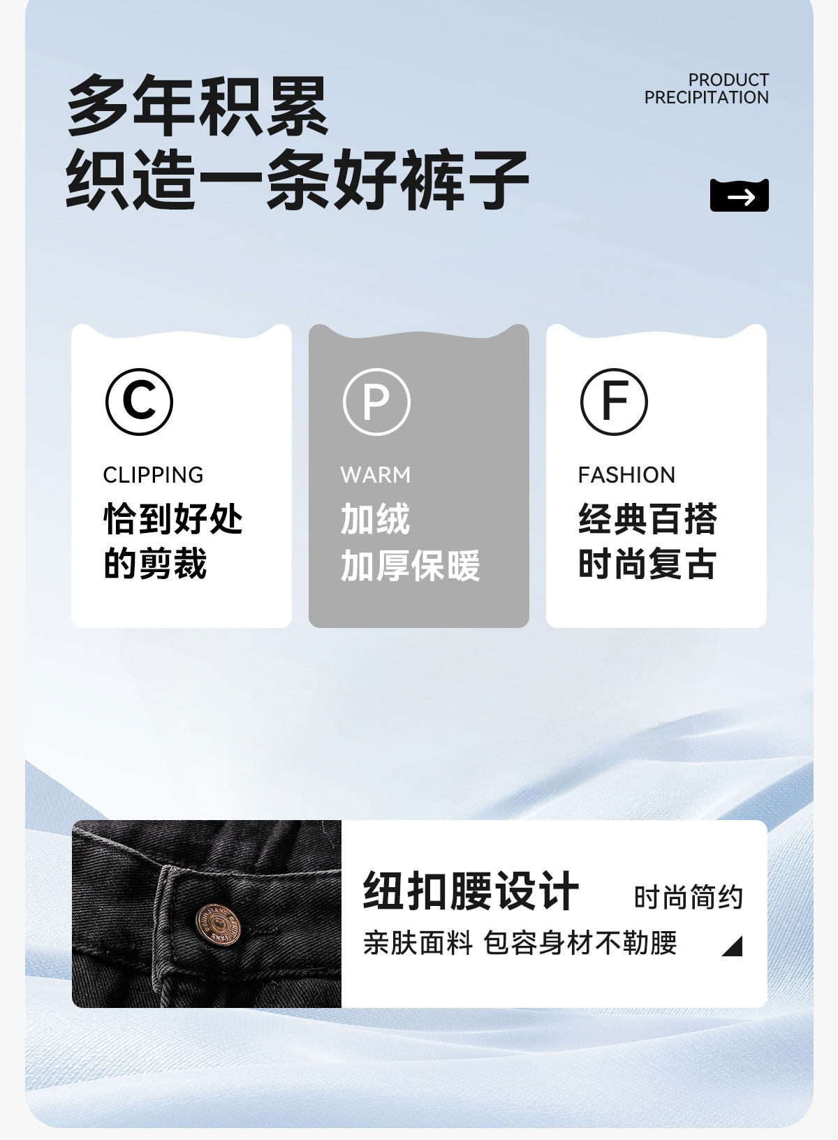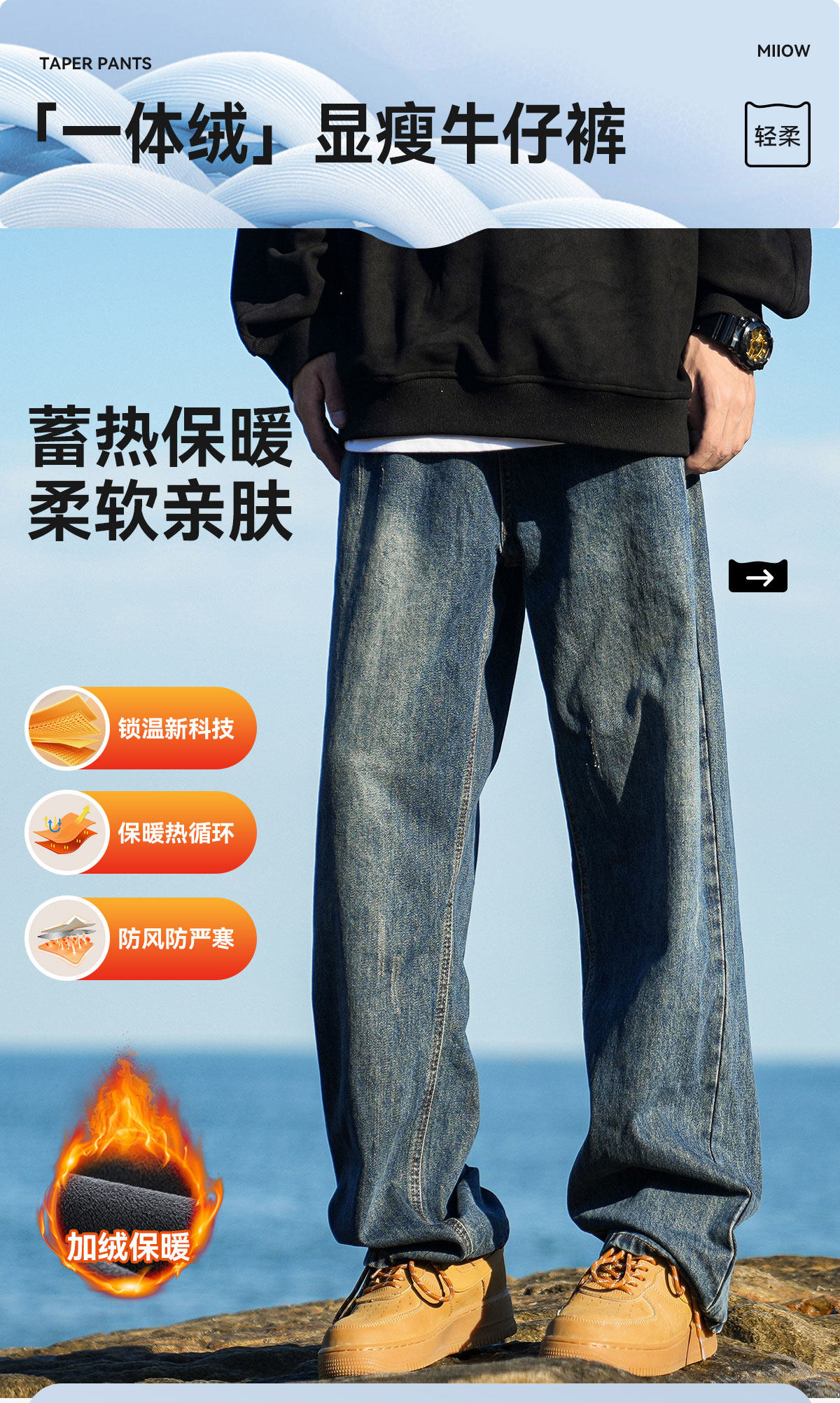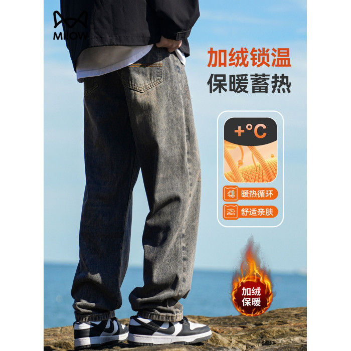 貓人直筒加絨復古牛仔褲男款冬季美式濶腿休閒褲防風加厚保暖褲子