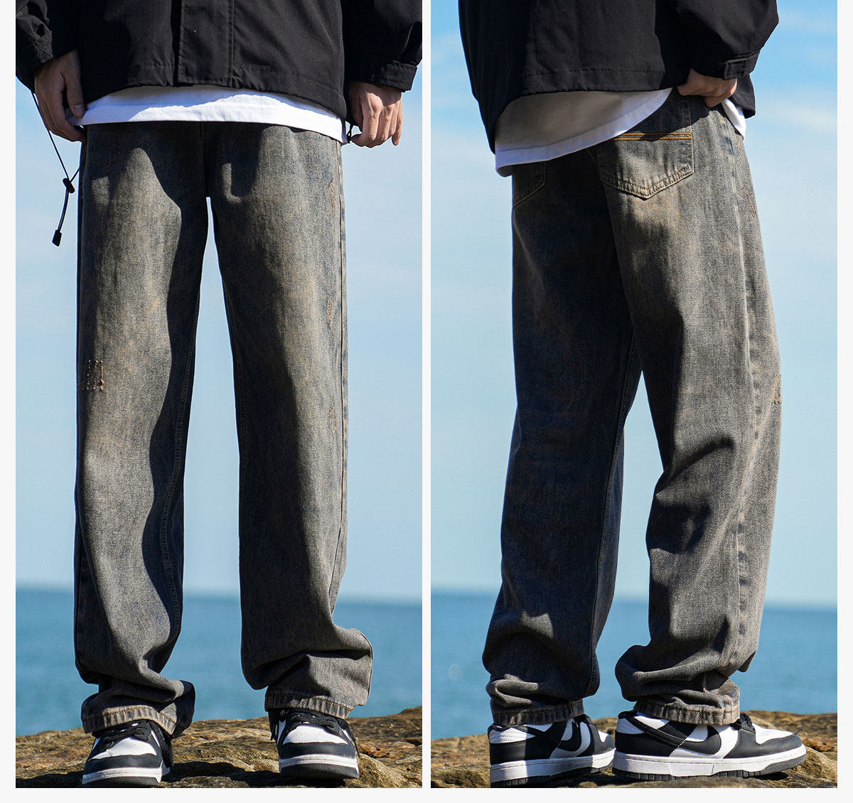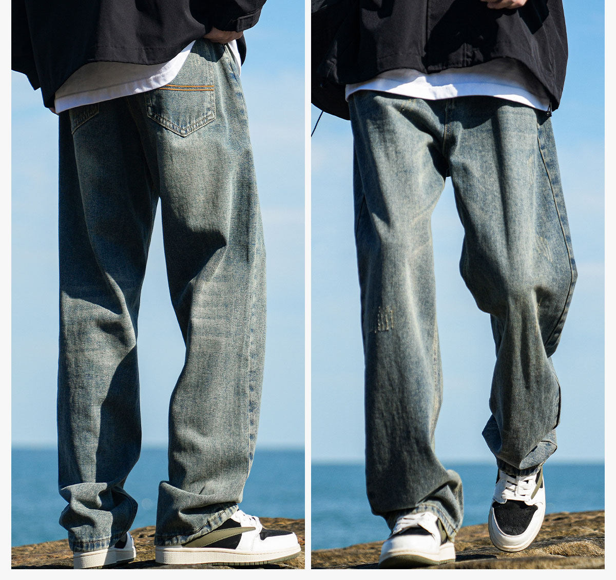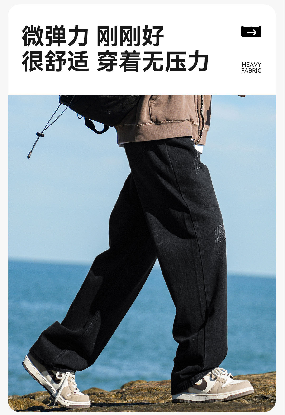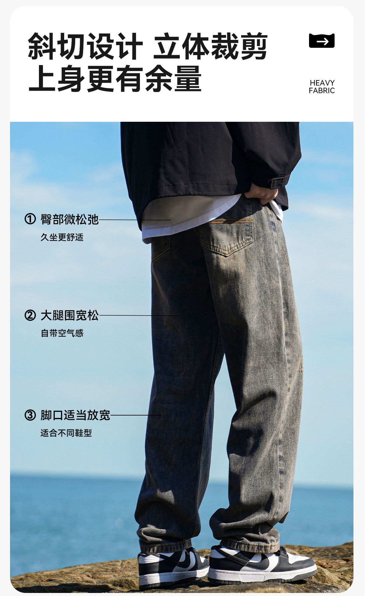 貓人直筒加絨復古牛仔褲男款冬季美式濶腿休閒褲防風加厚保暖褲子