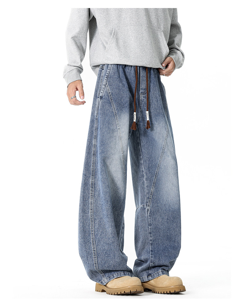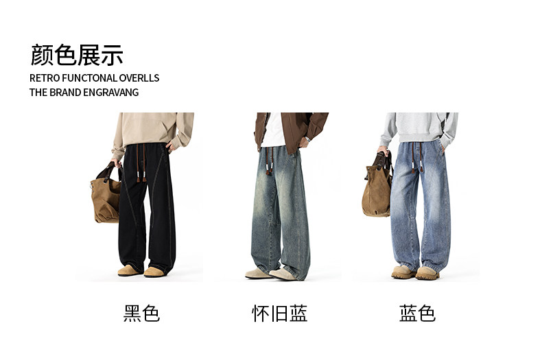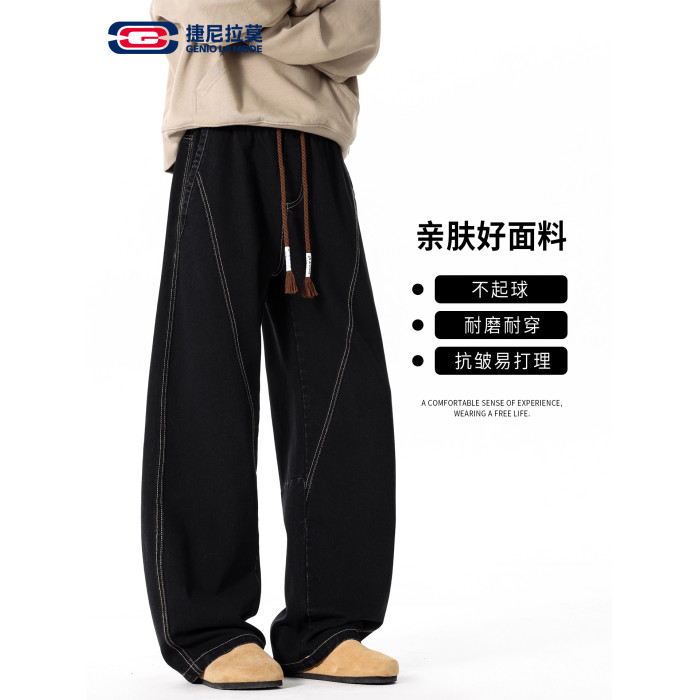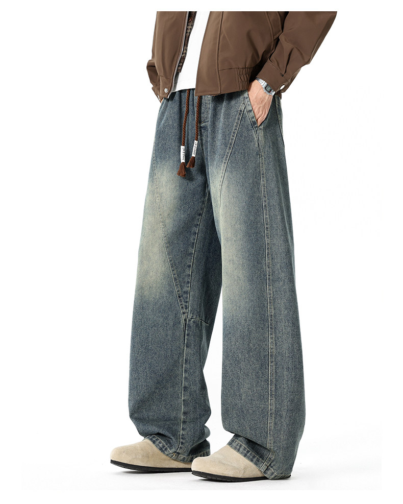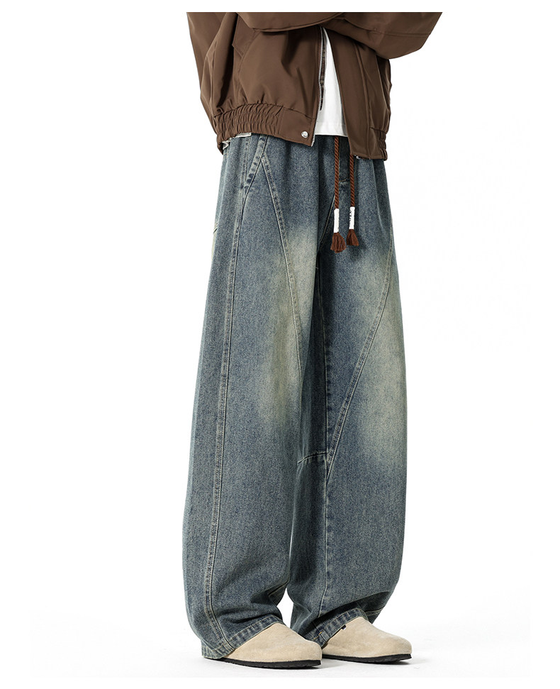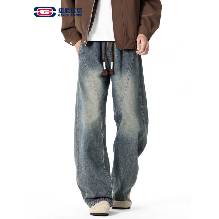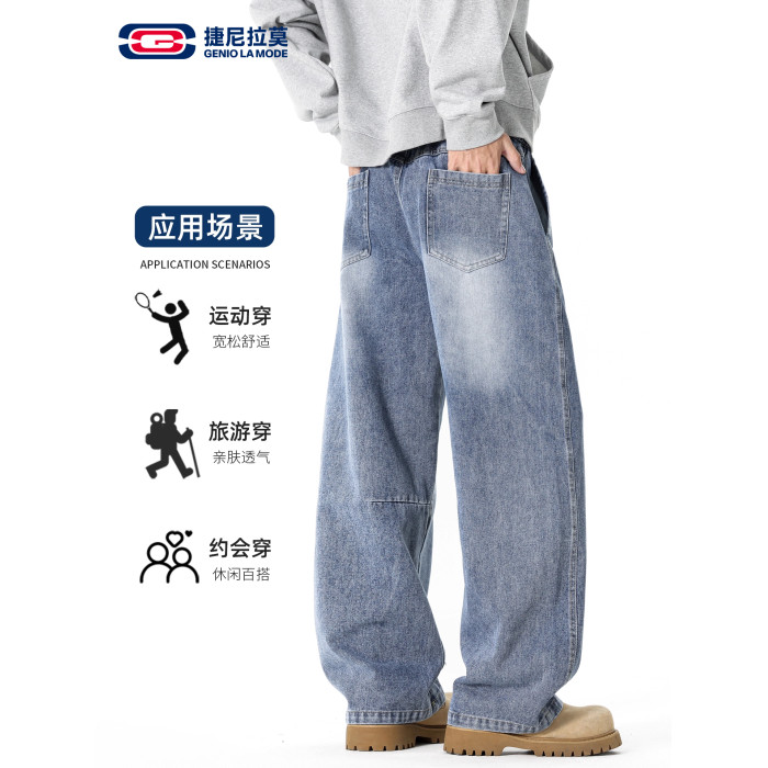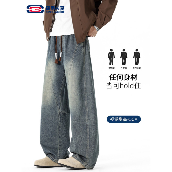 GENIOLAMODE復古水洗濶腿牛仔褲男士秋冬新款美式風寬鬆彎刀長褲