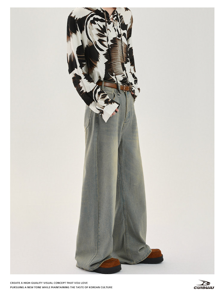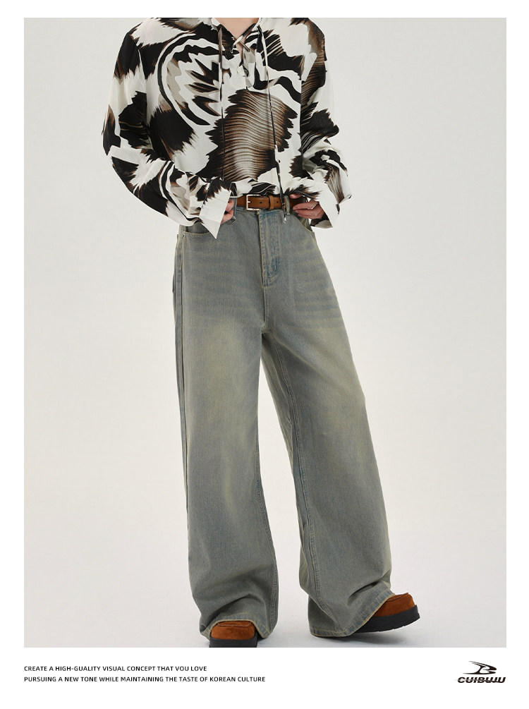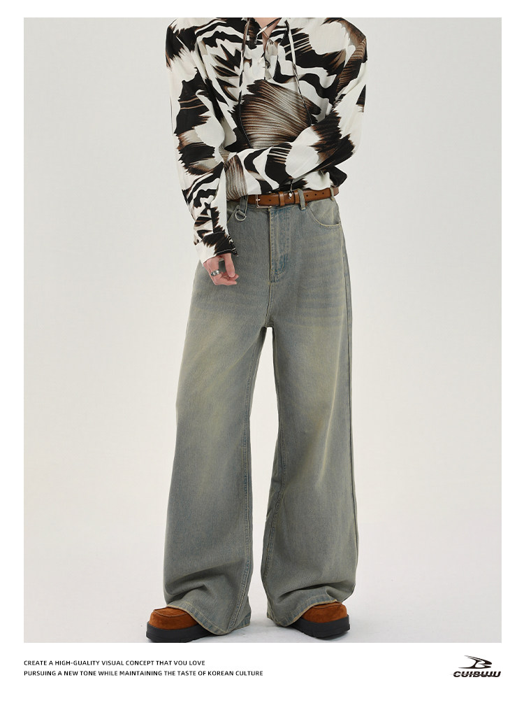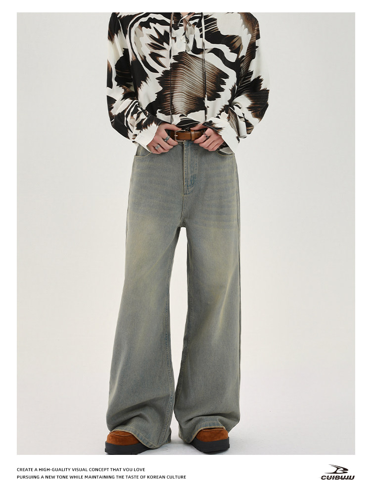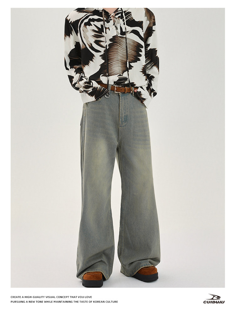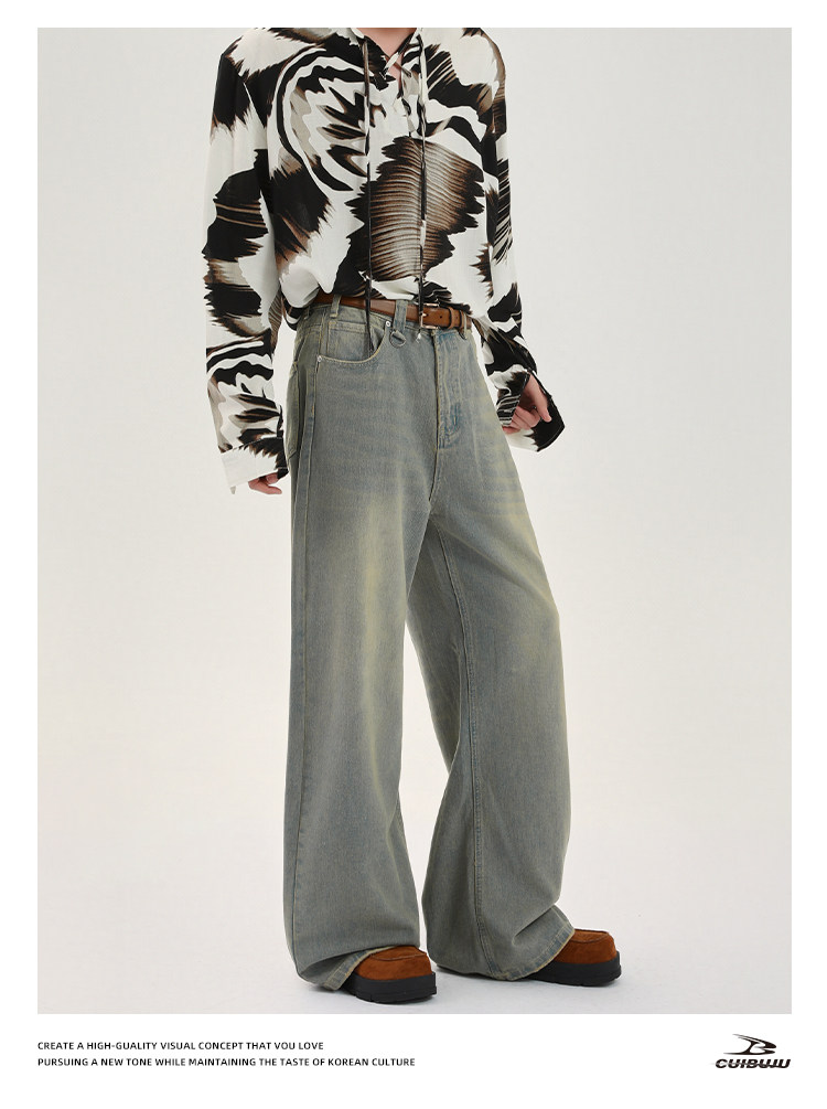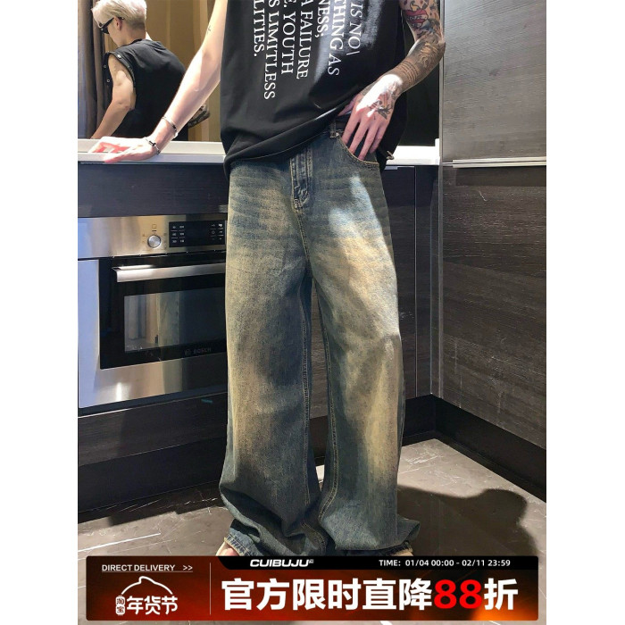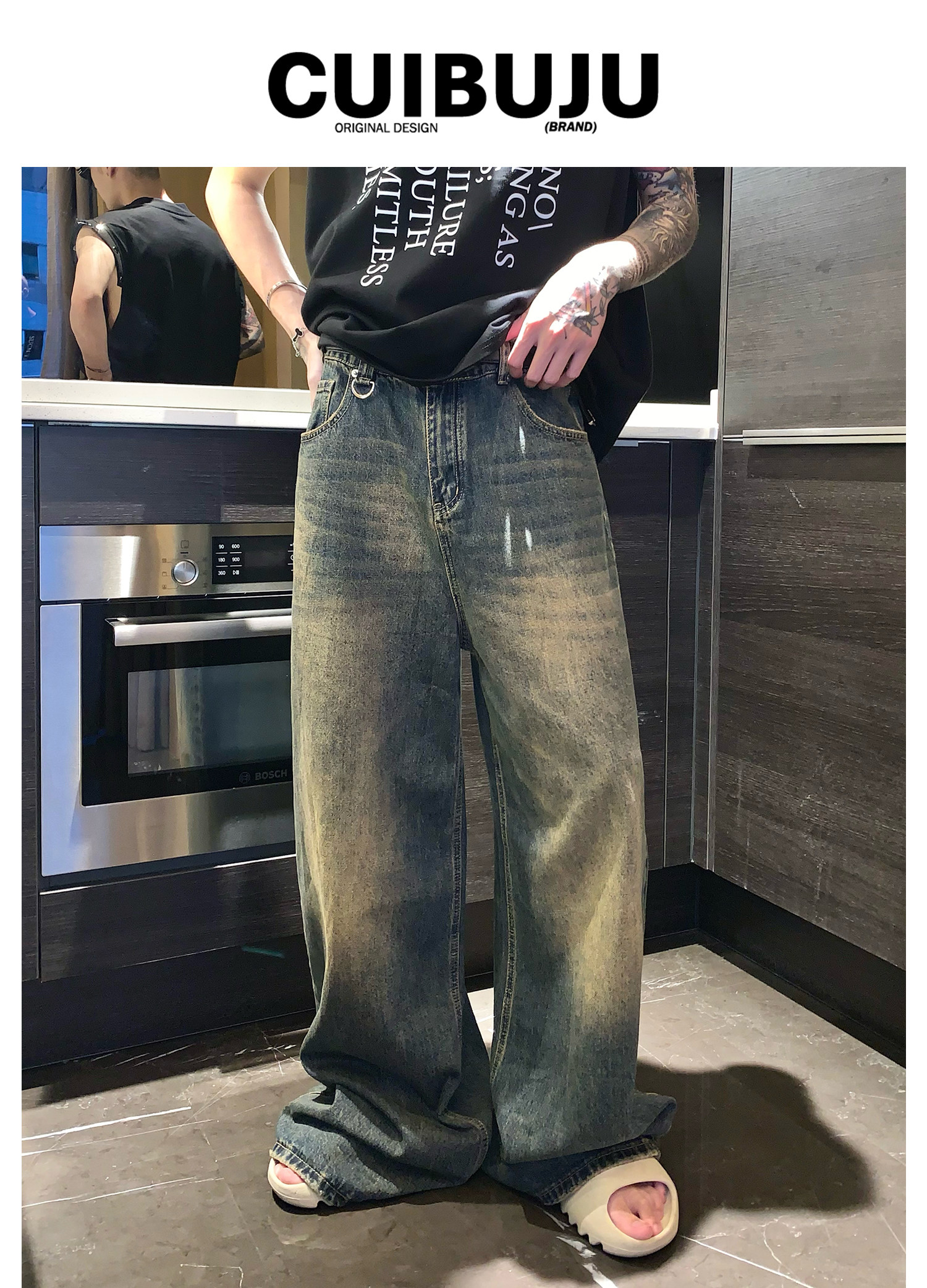 cuibuju 小衆磨破做舊復古水洗直筒牛仔褲男寬鬆百搭濶腿拖地長褲