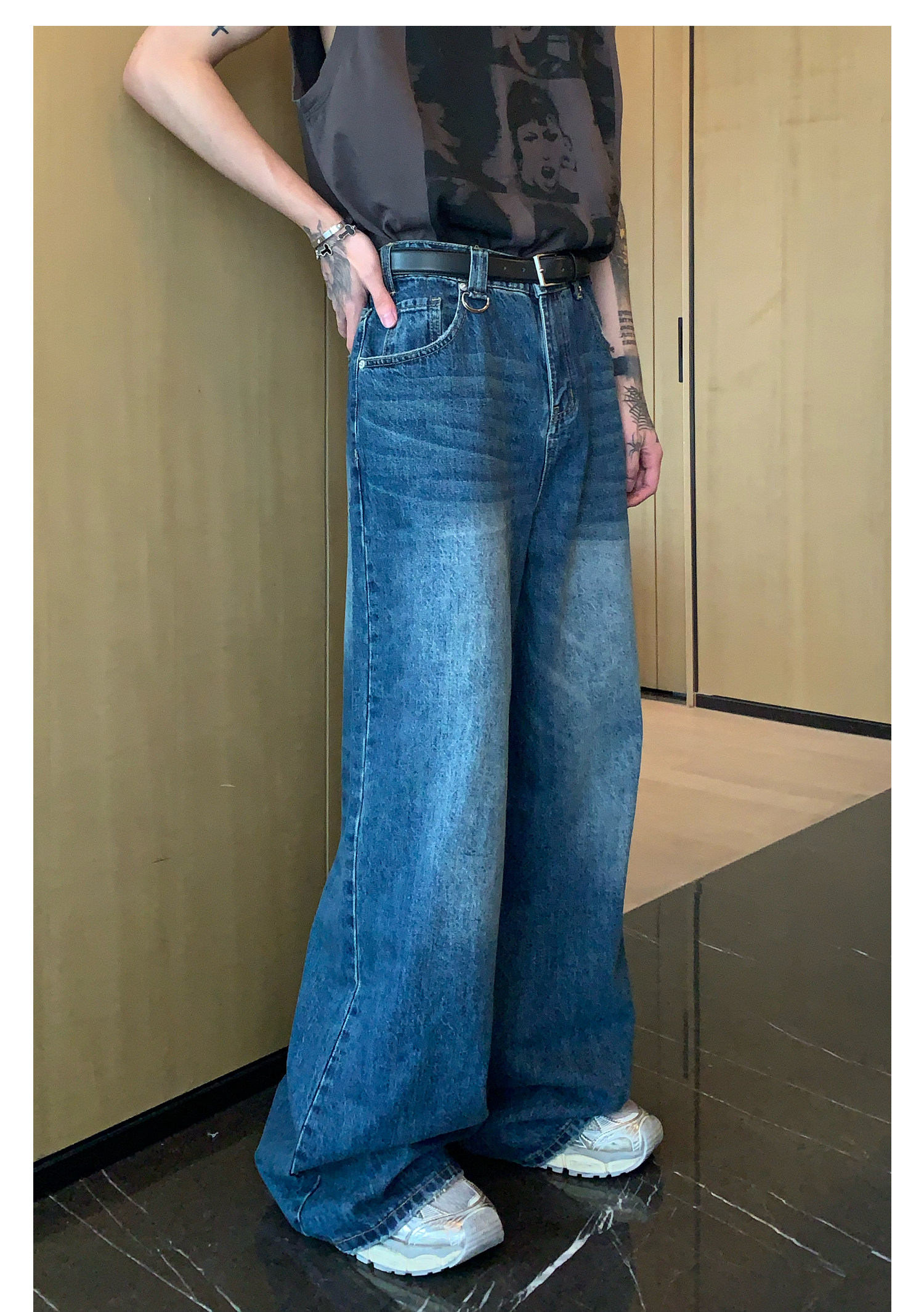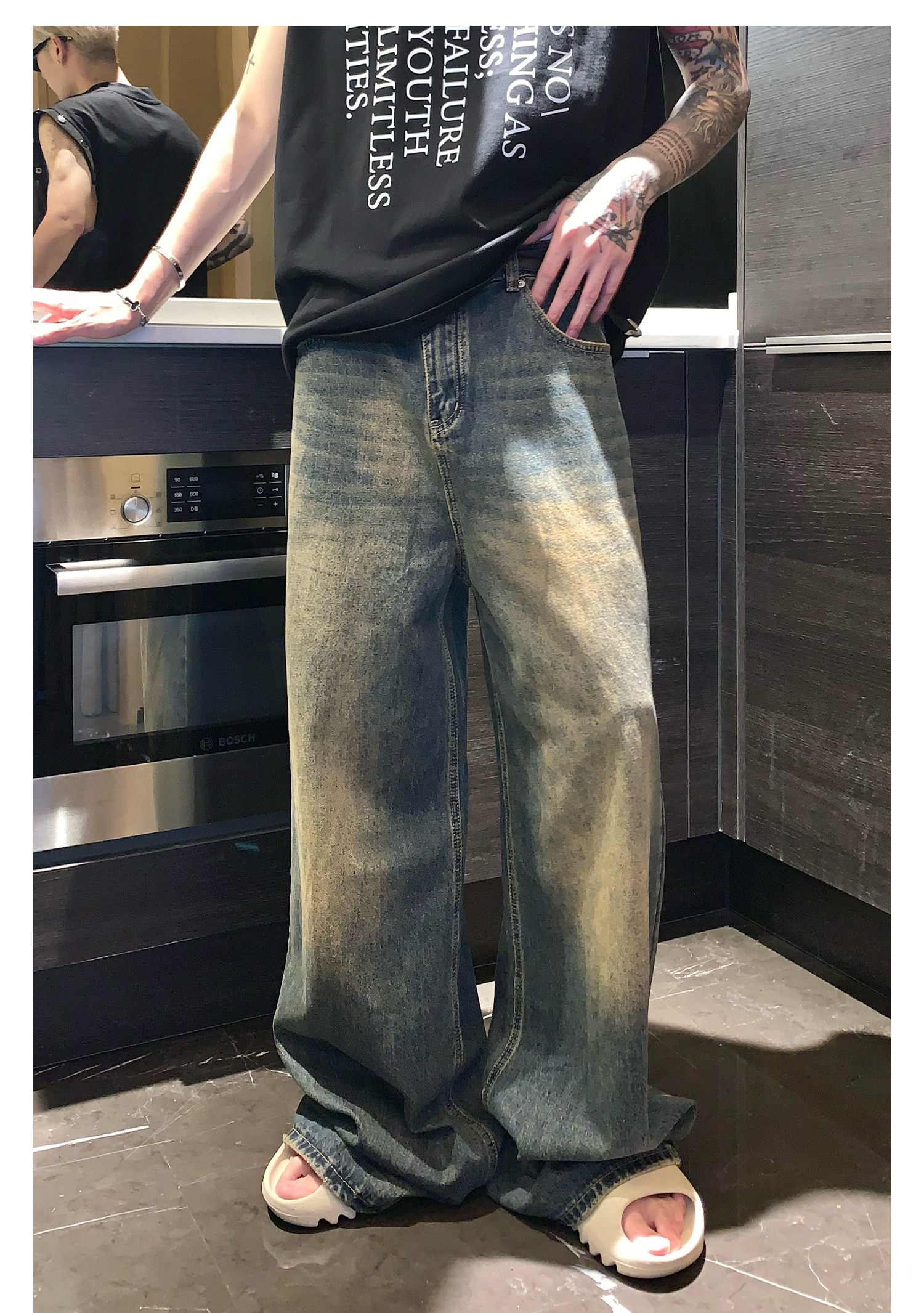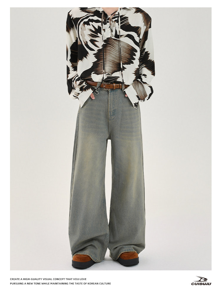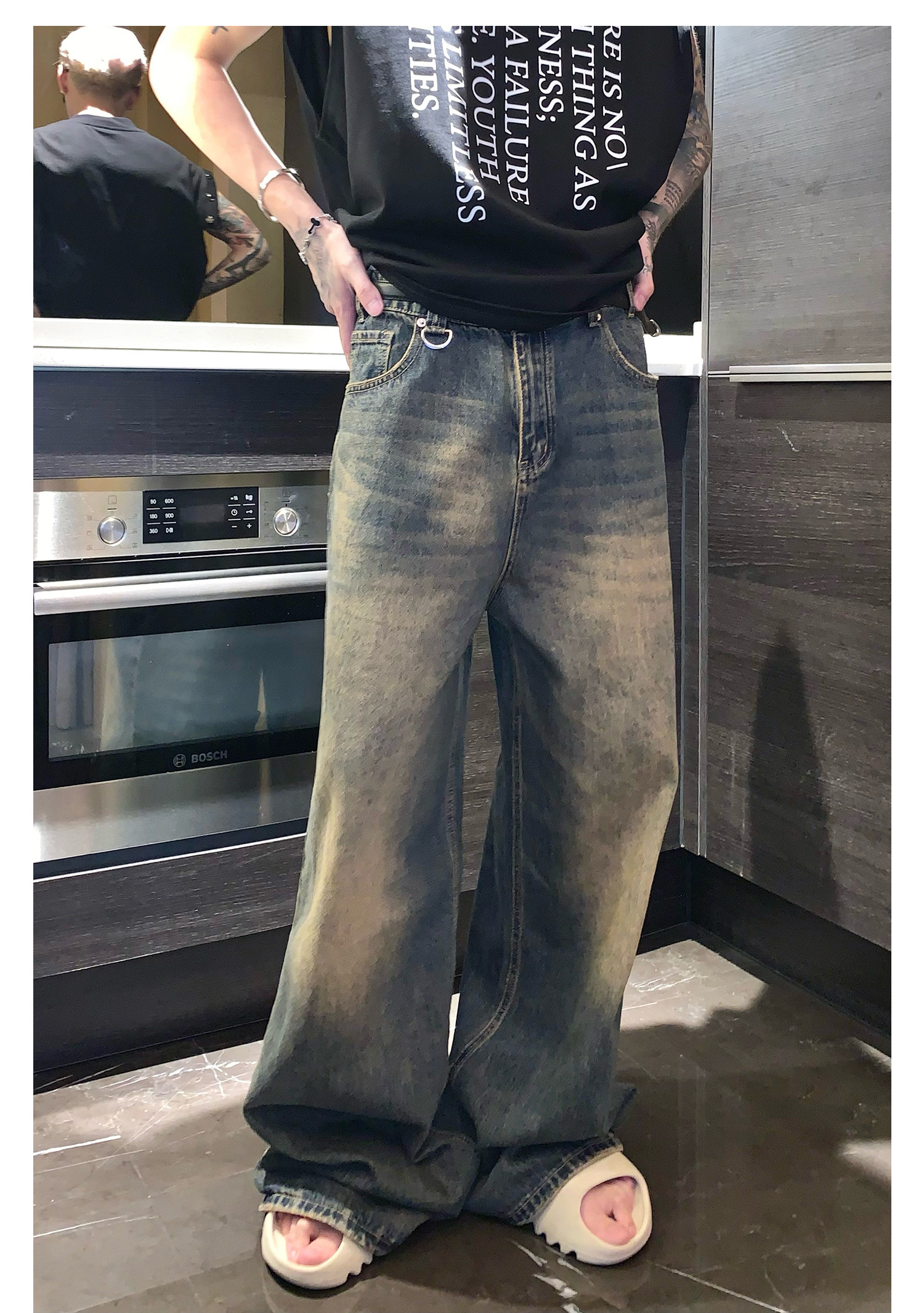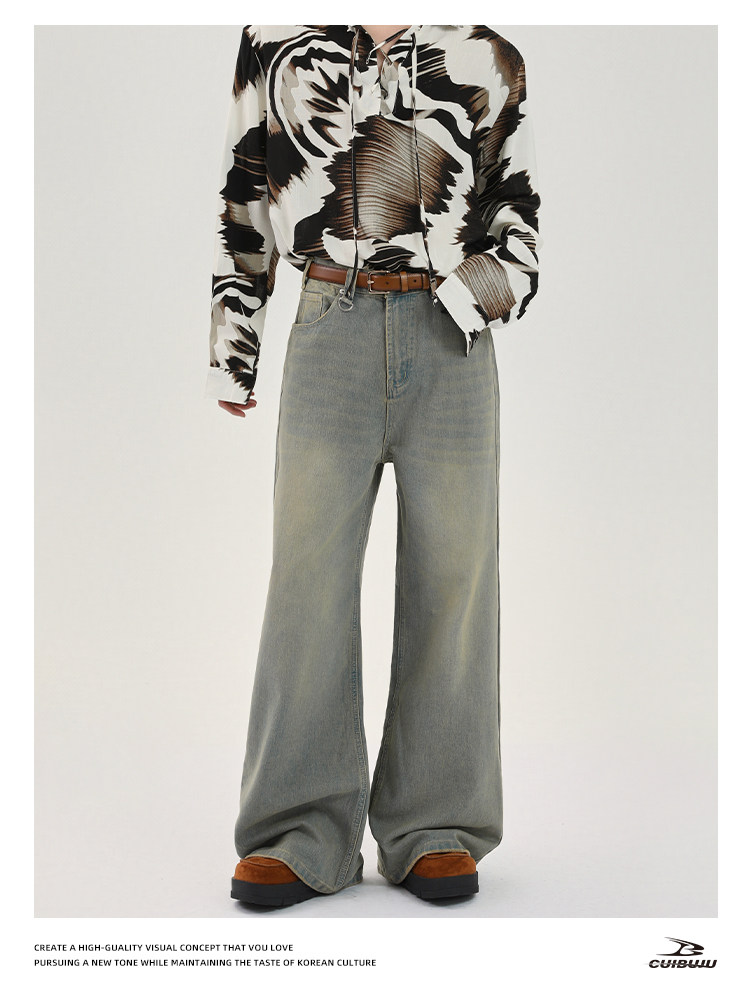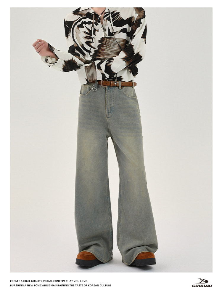 cuibuju 小衆磨破做舊復古水洗直筒牛仔褲男寬鬆百搭濶腿拖地長褲