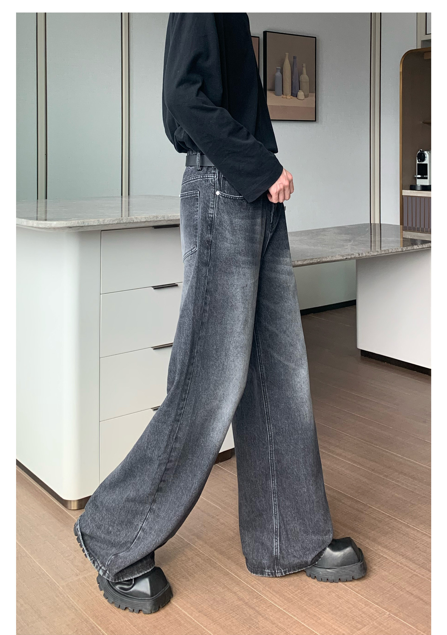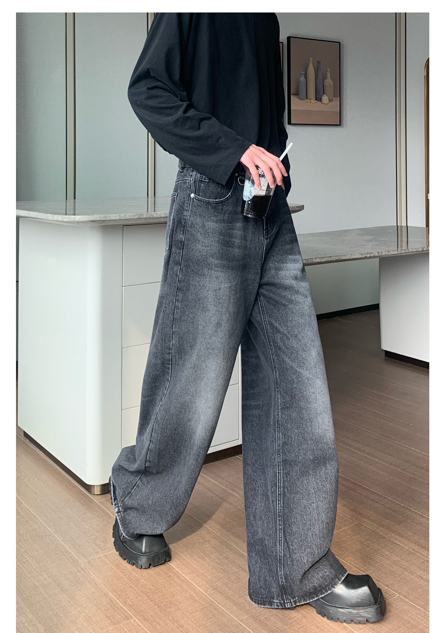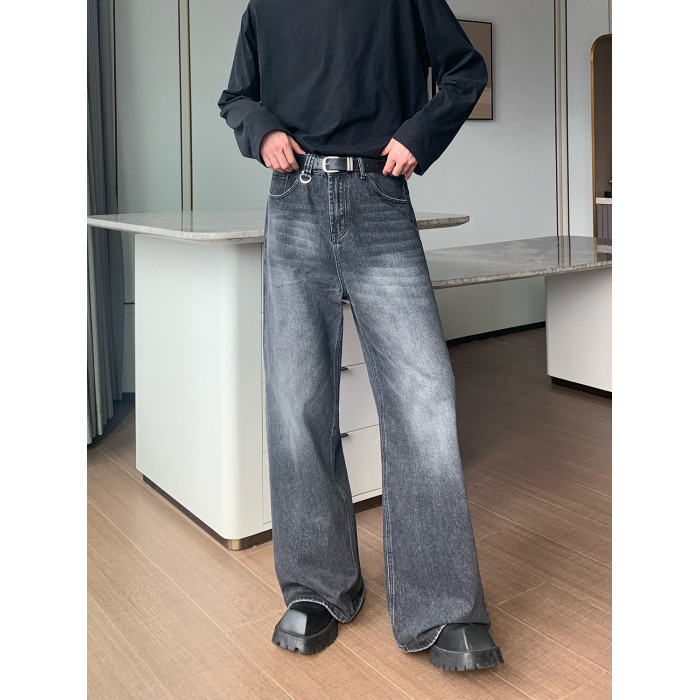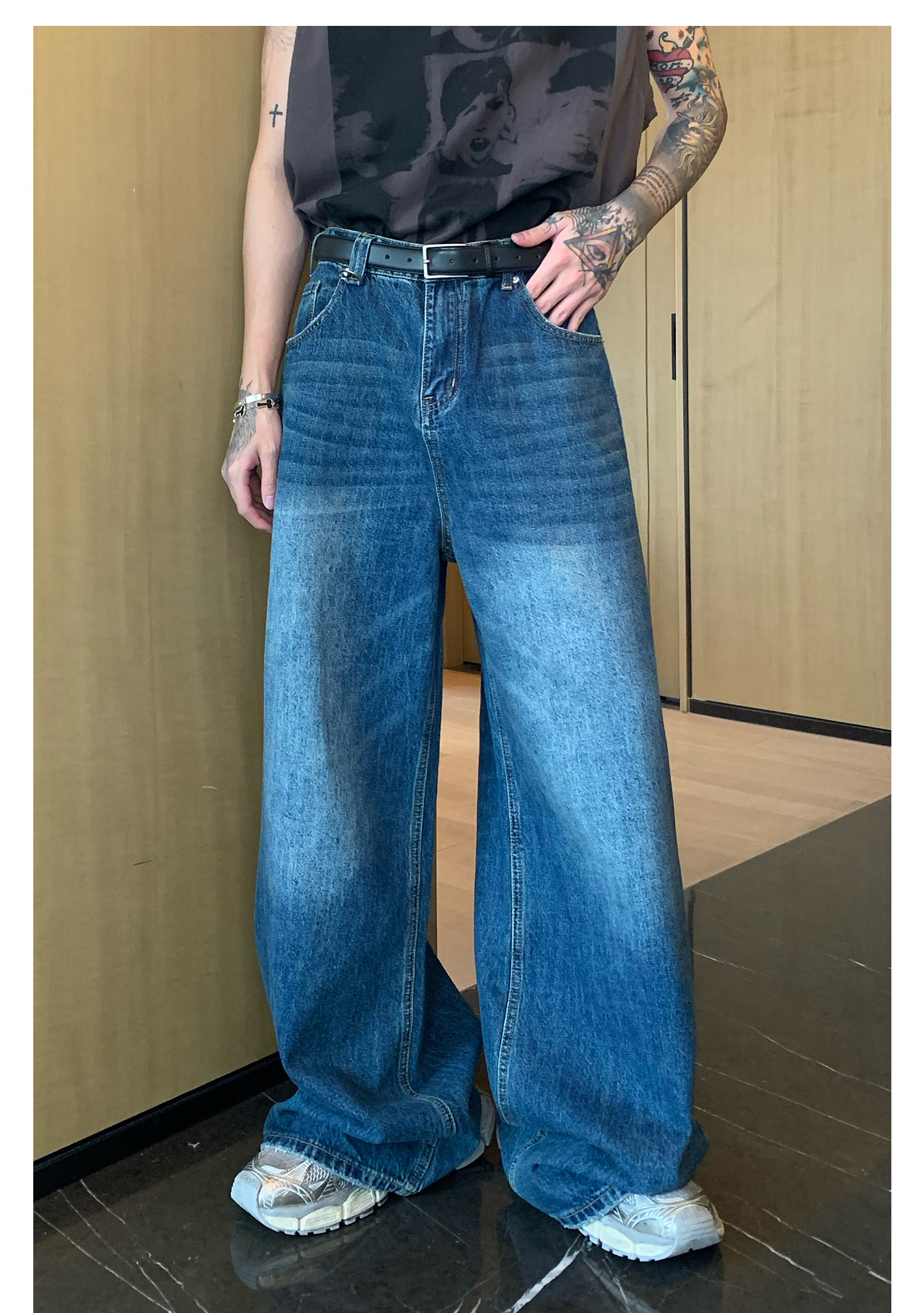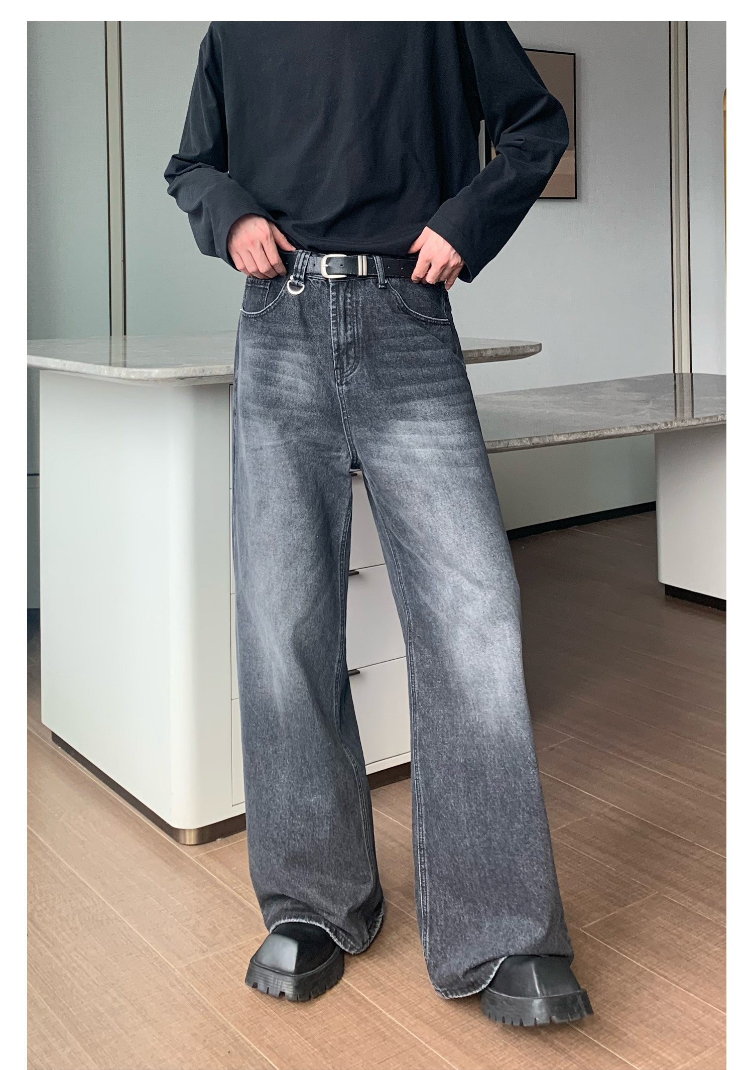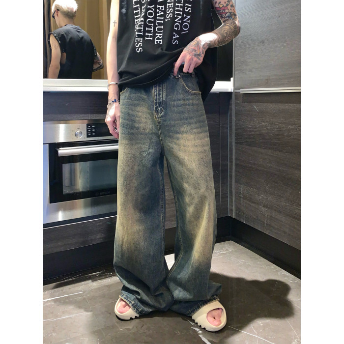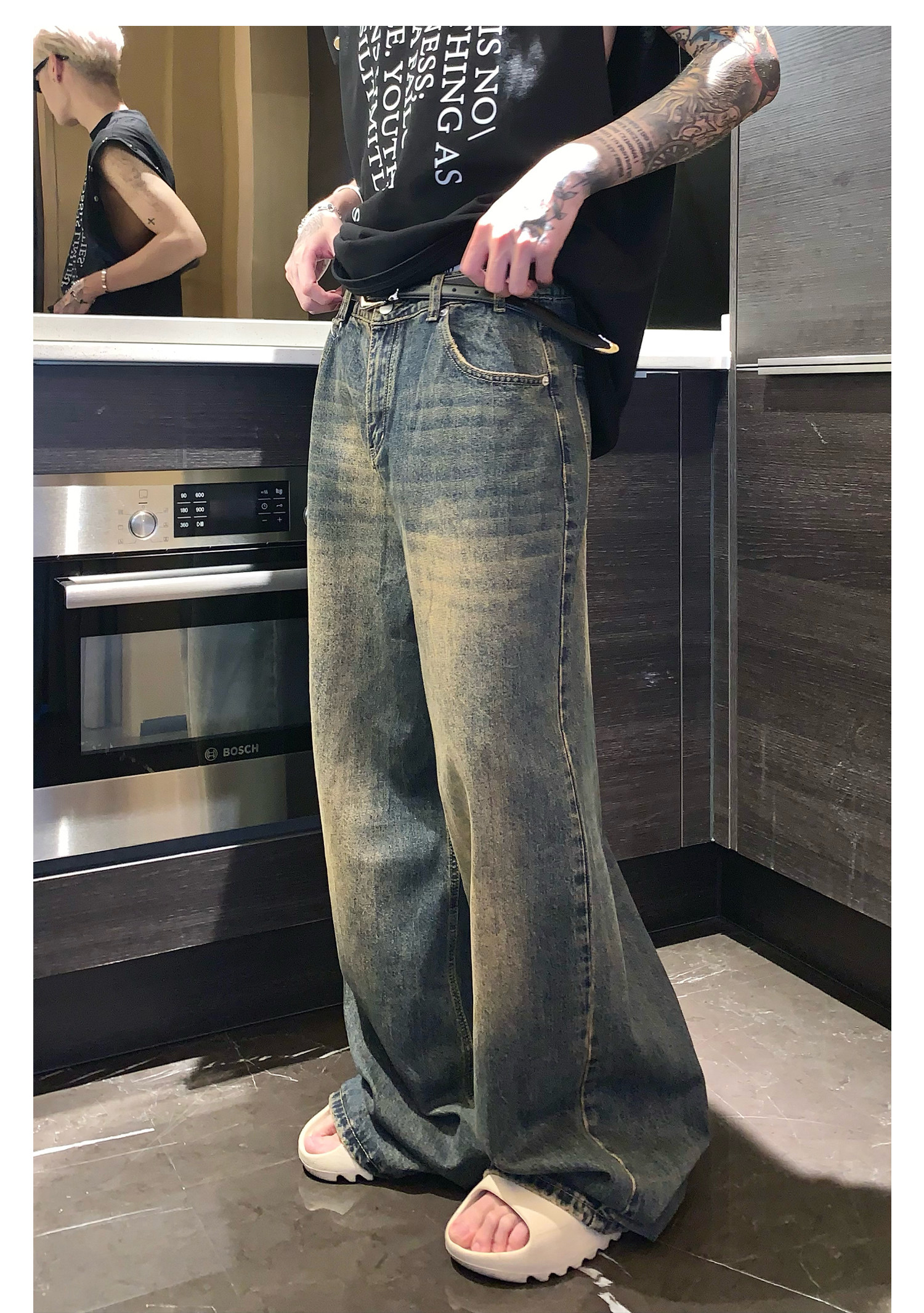 cuibuju 小衆磨破做舊復古水洗直筒牛仔褲男寬鬆百搭濶腿拖地長褲