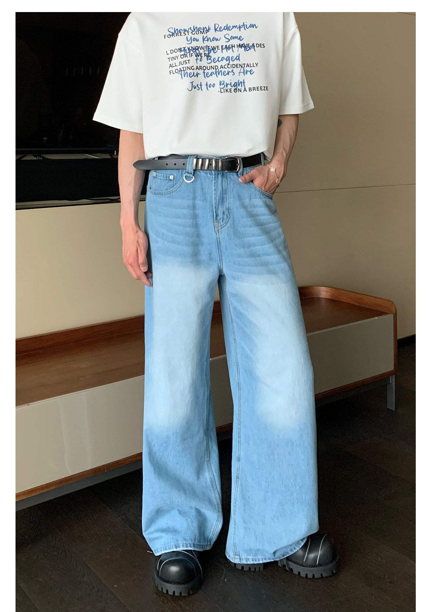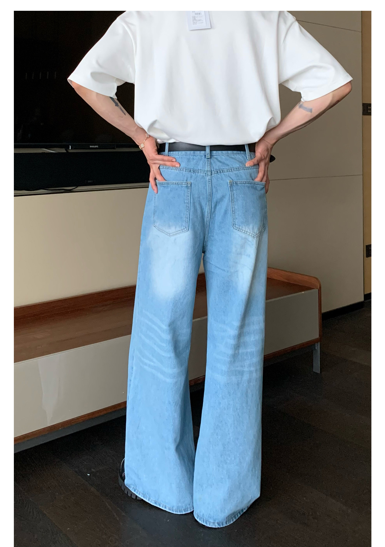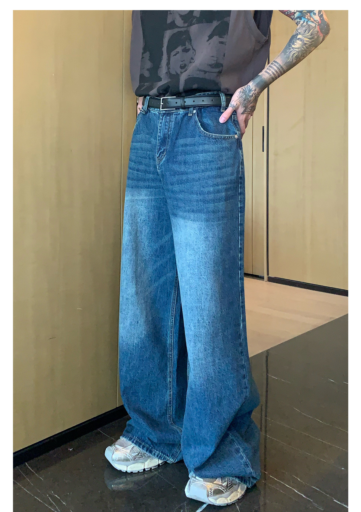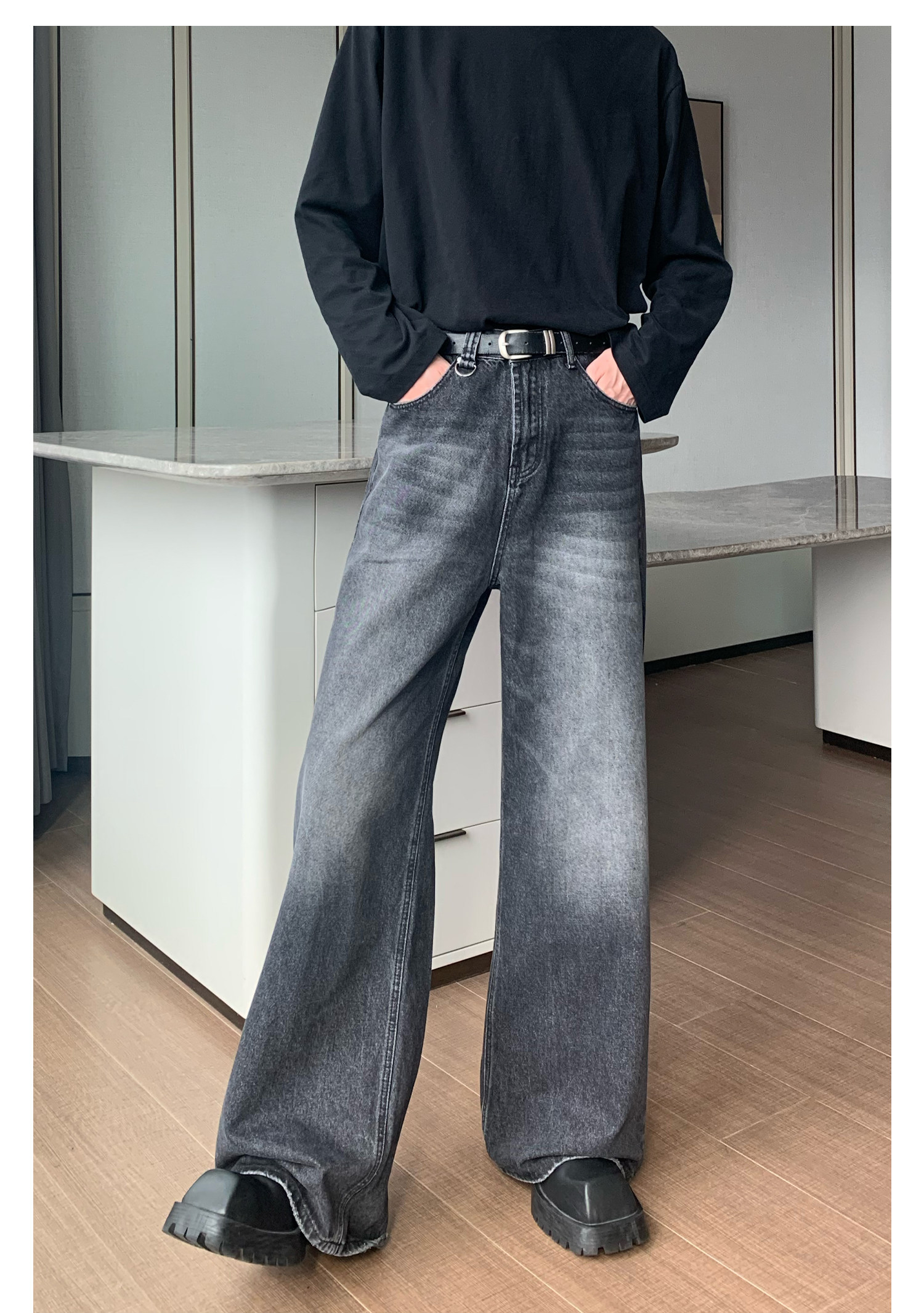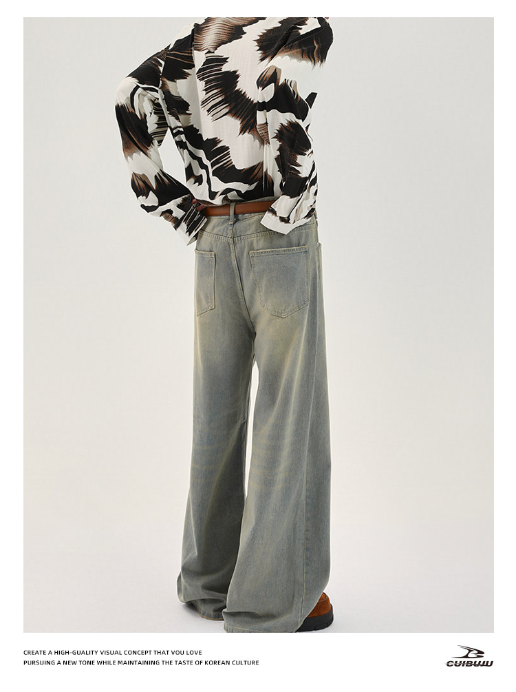 cuibuju 小衆磨破做舊復古水洗直筒牛仔褲男寬鬆百搭濶腿拖地長褲
