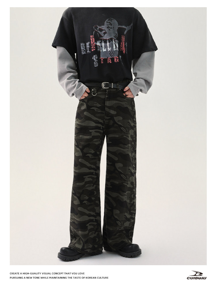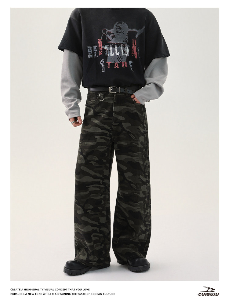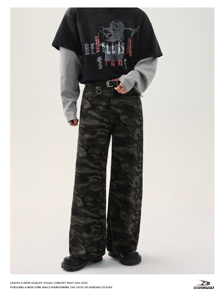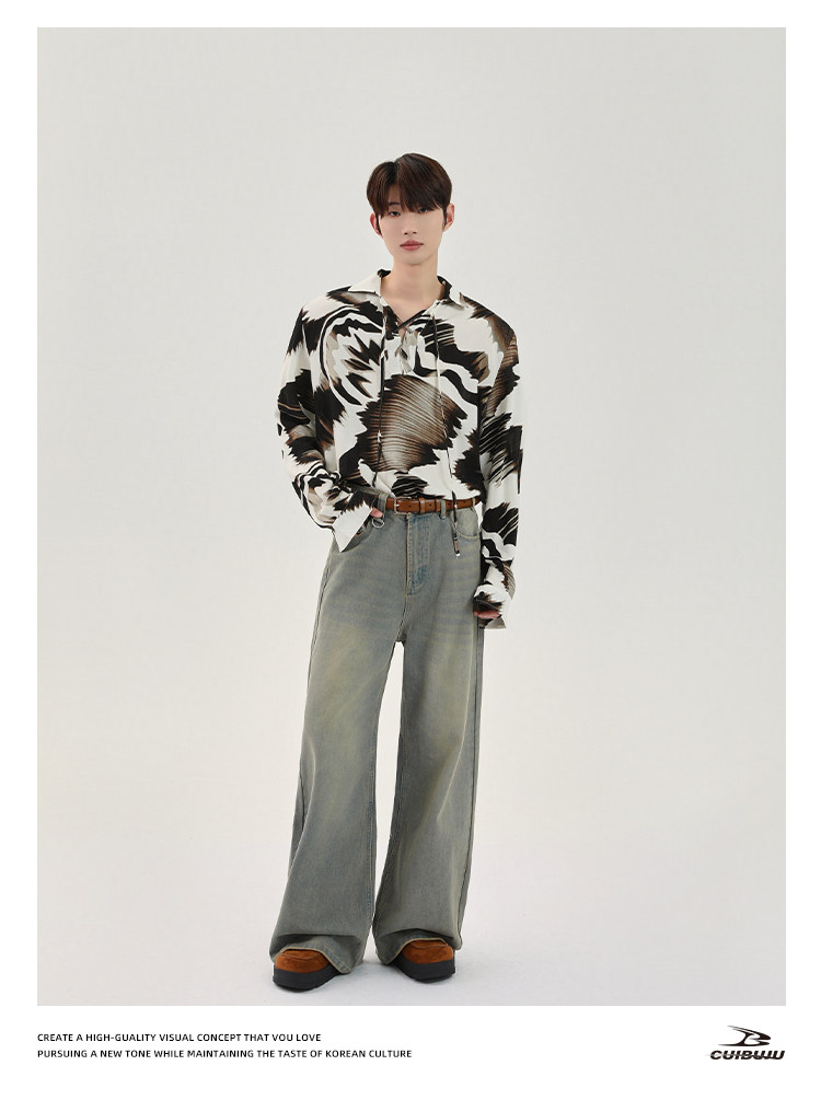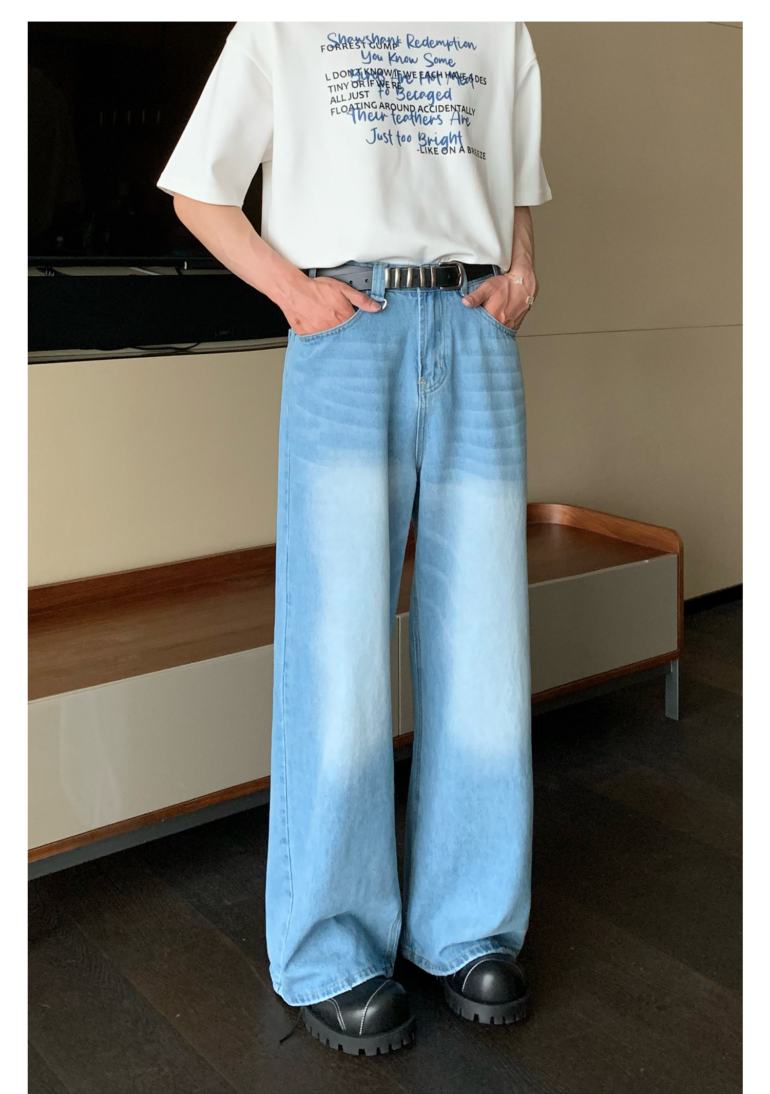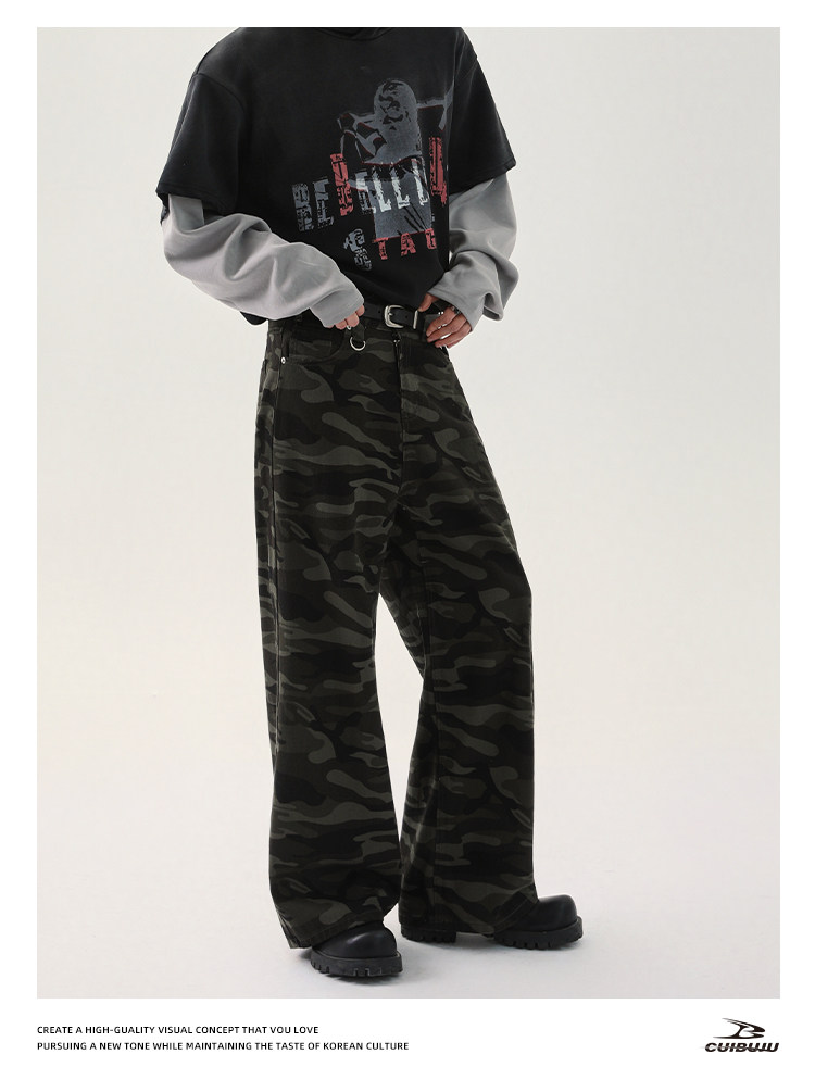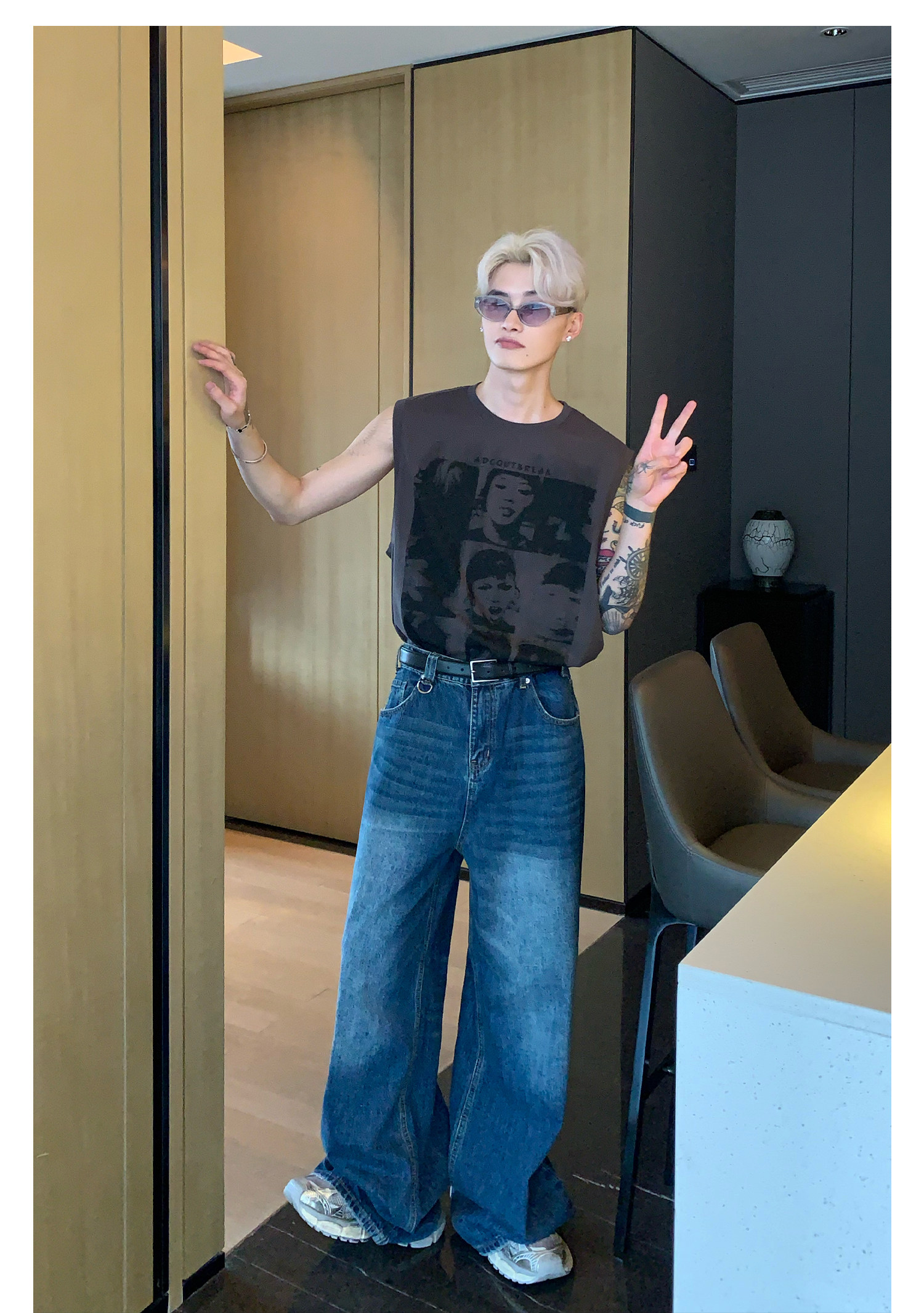 cuibuju 小衆磨破做舊復古水洗直筒牛仔褲男寬鬆百搭濶腿拖地長褲