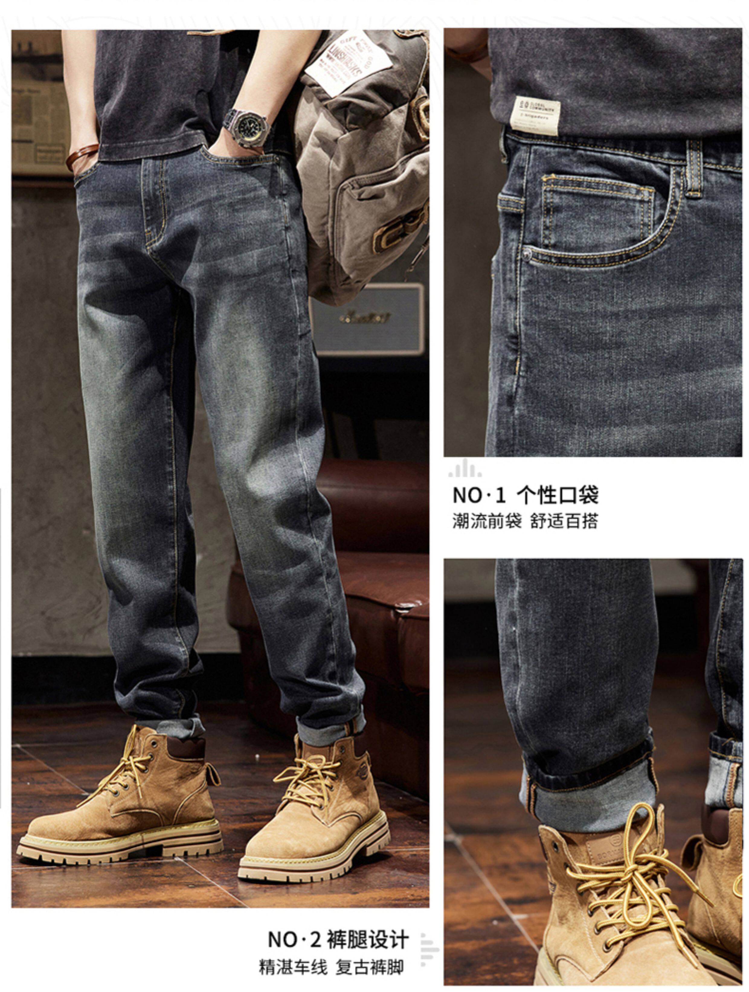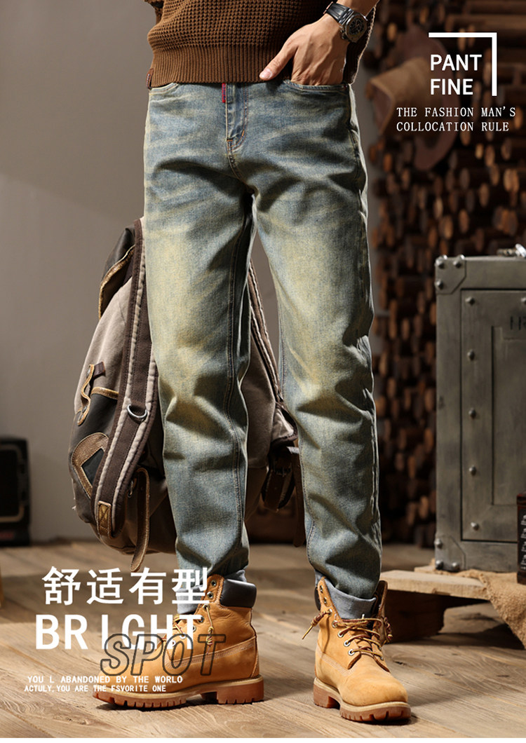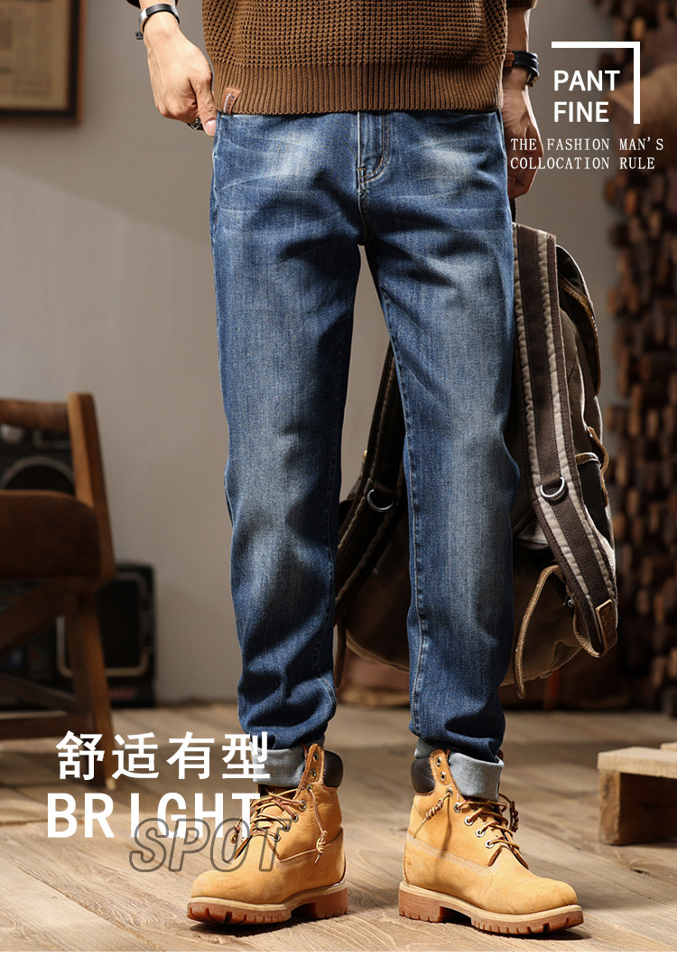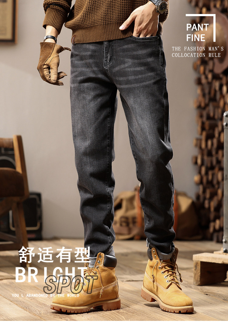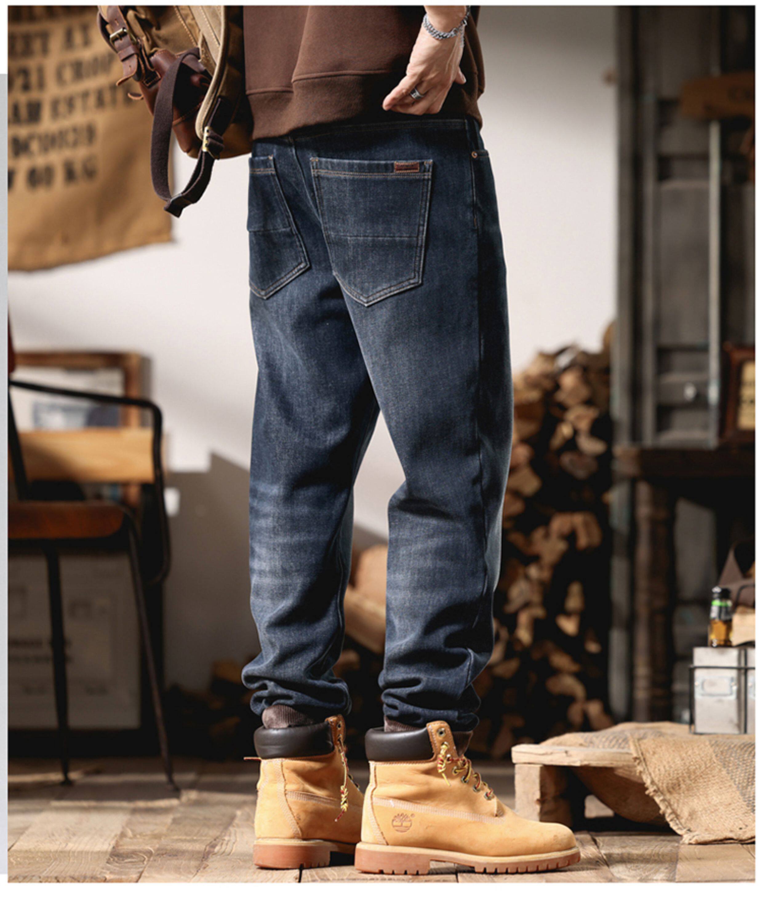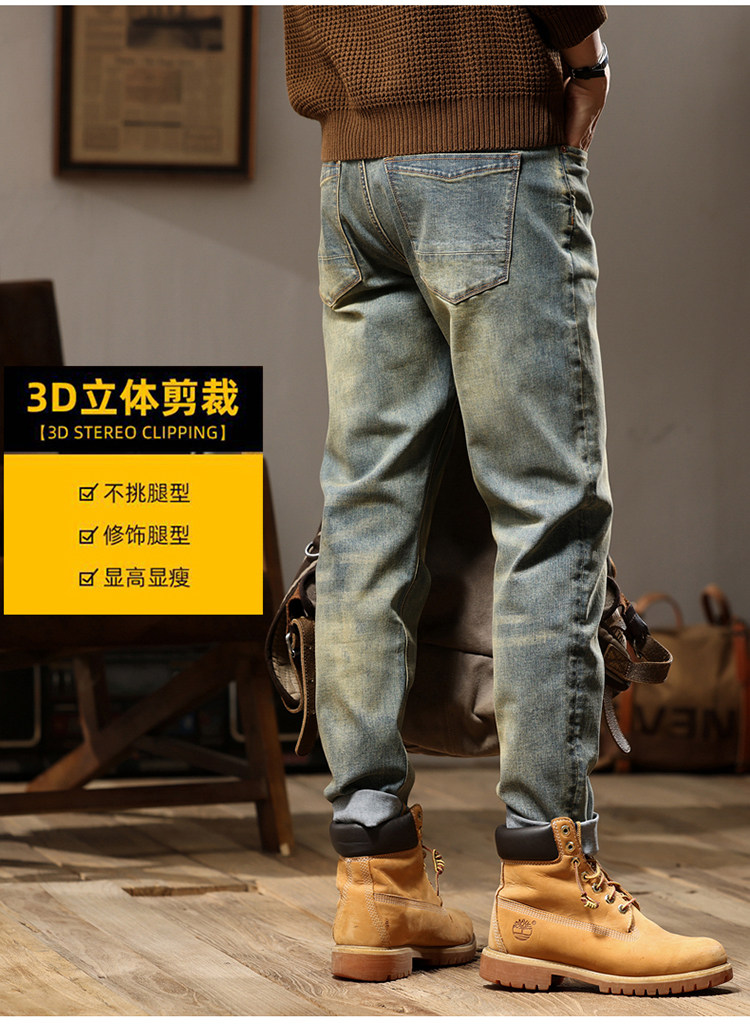 美式復古牛仔褲男彈力黃泥水洗胖子大碼修身直筒小腳加絨肥佬長褲