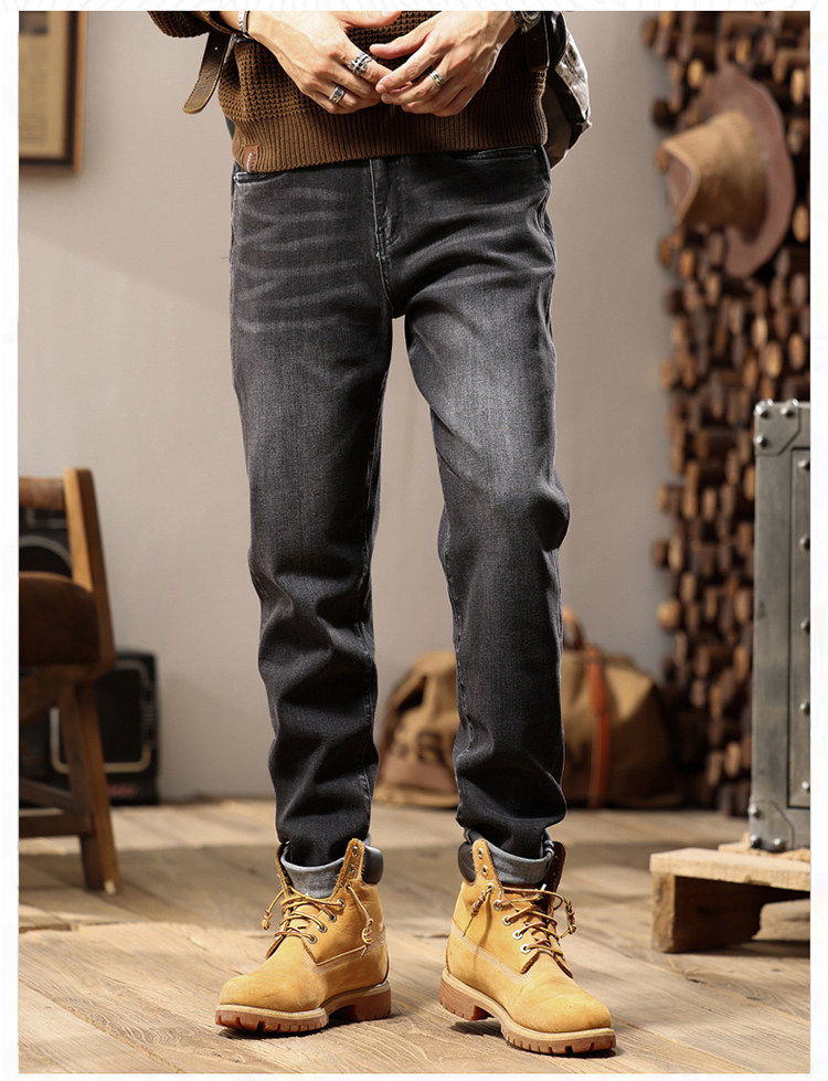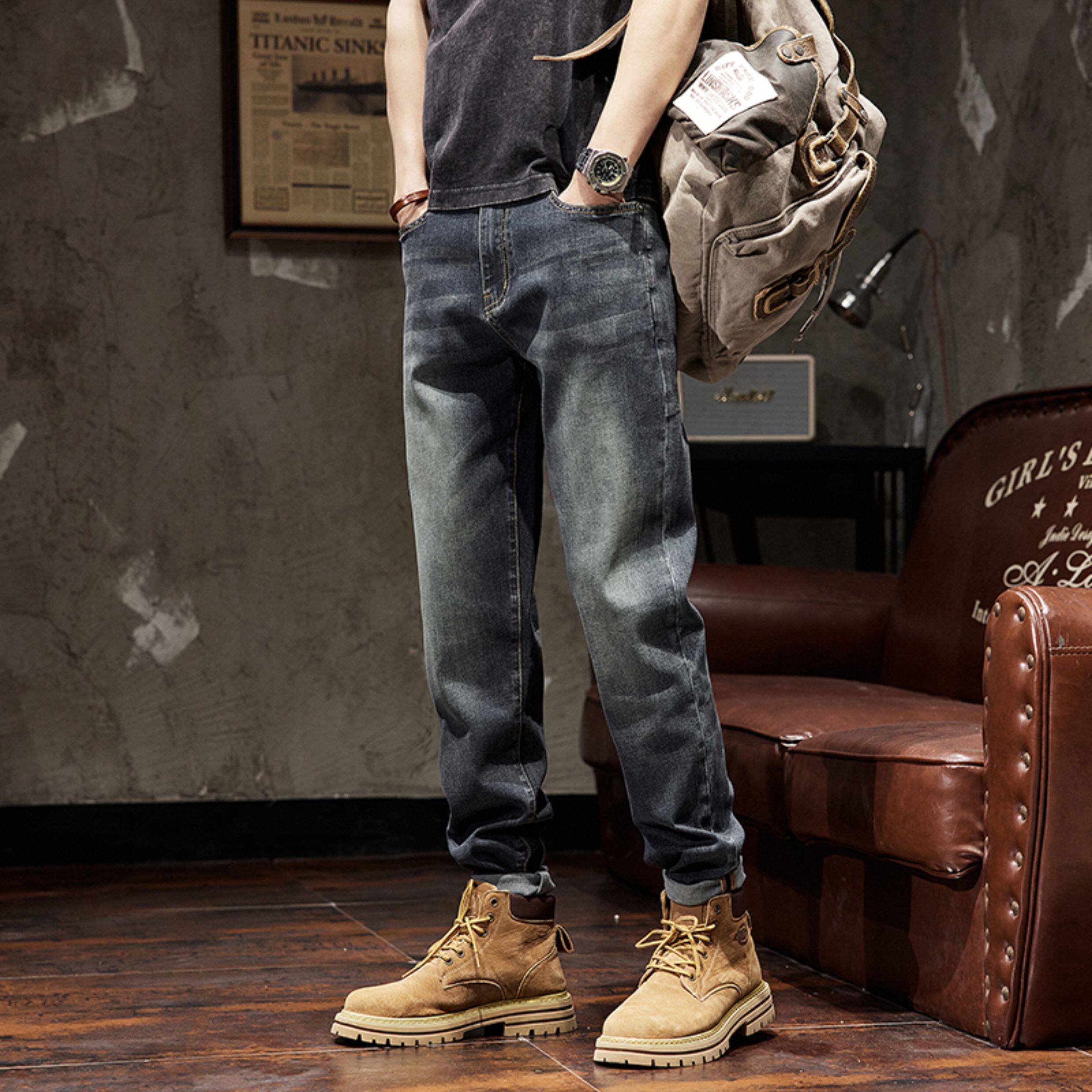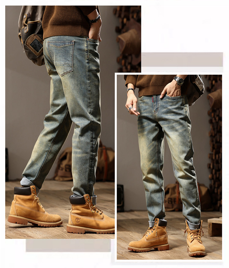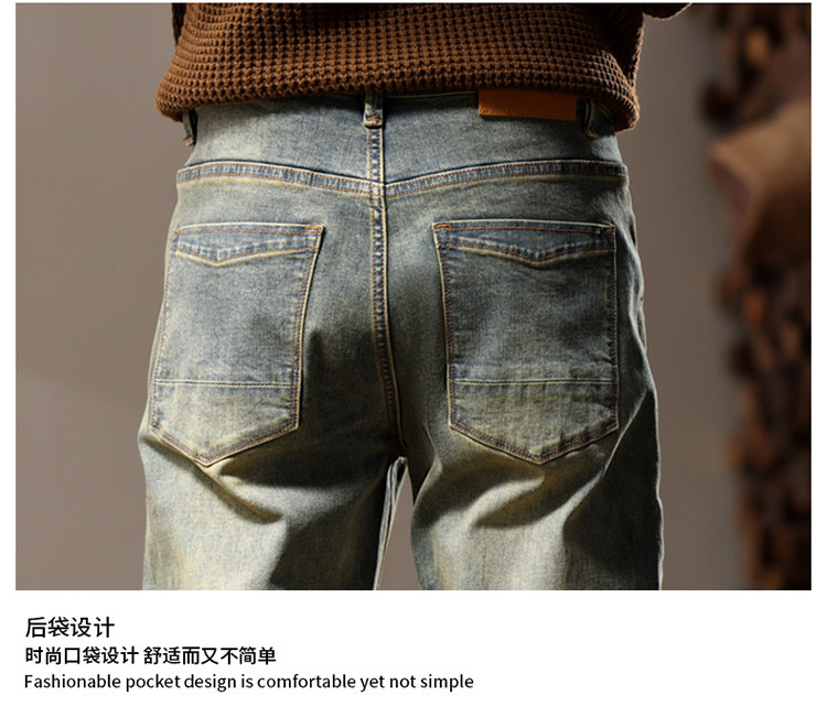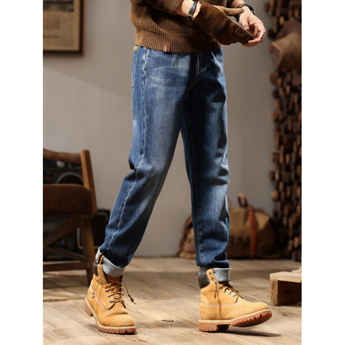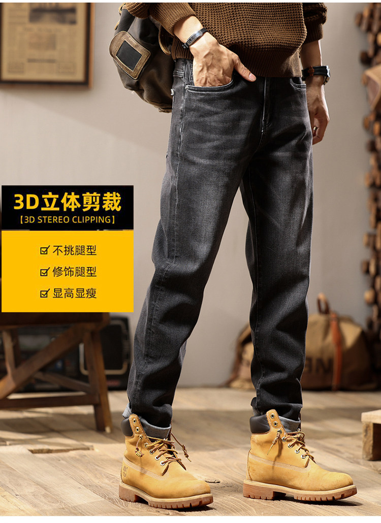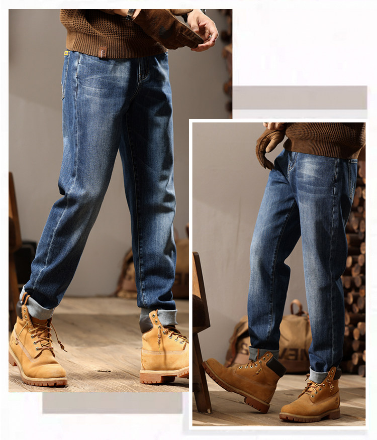 美式復古牛仔褲男彈力黃泥水洗胖子大碼修身直筒小腳加絨肥佬長褲