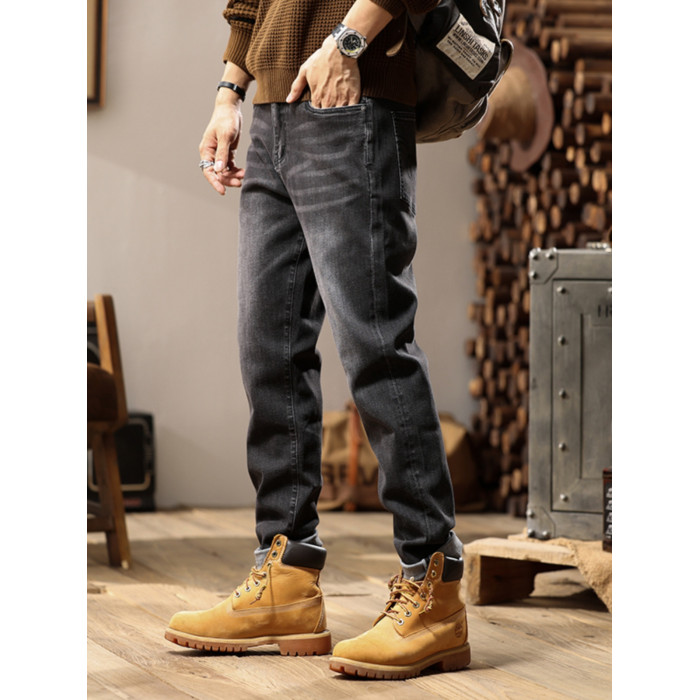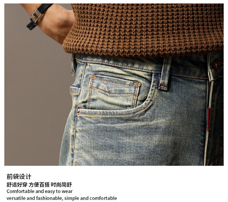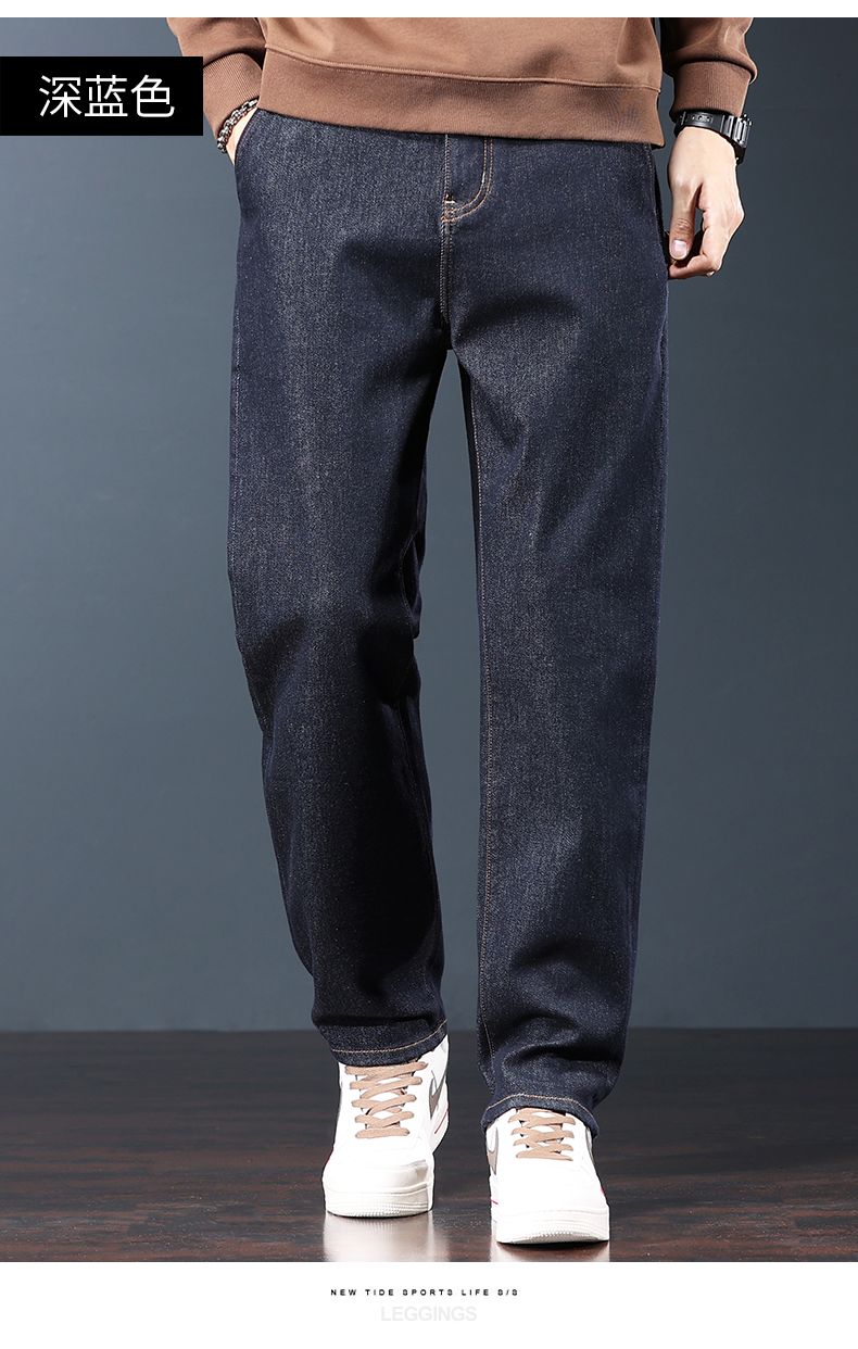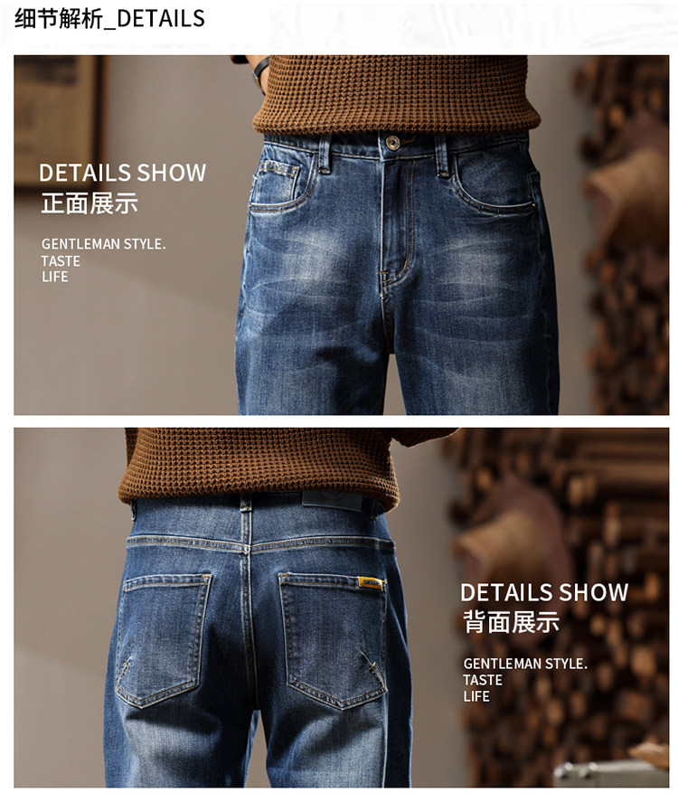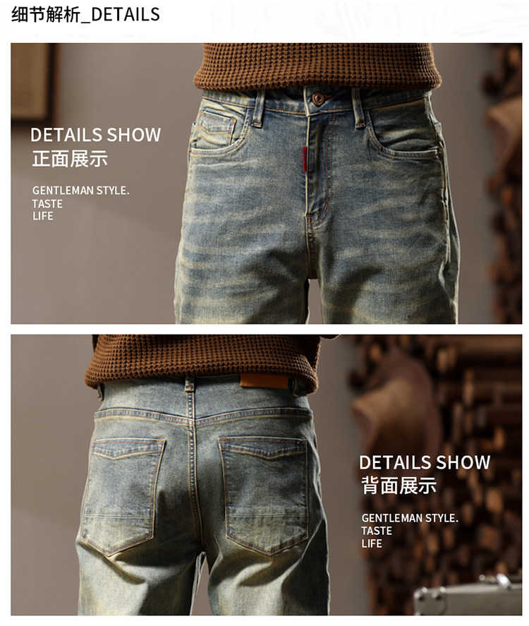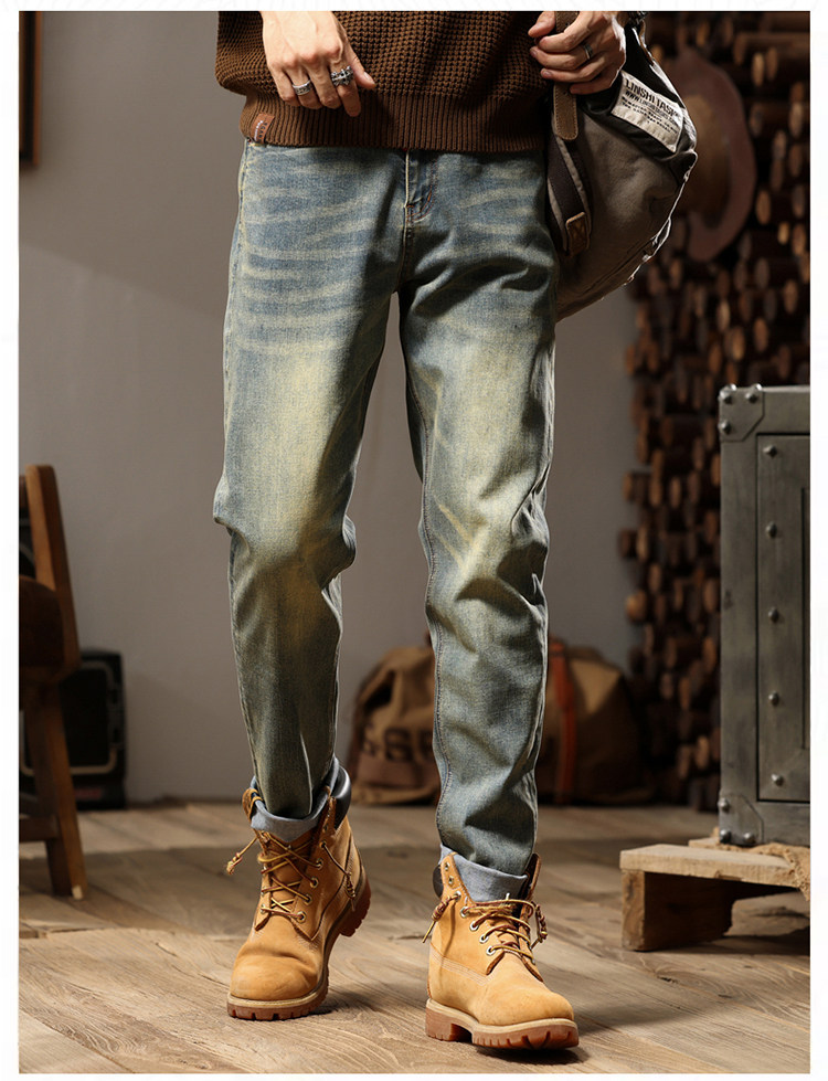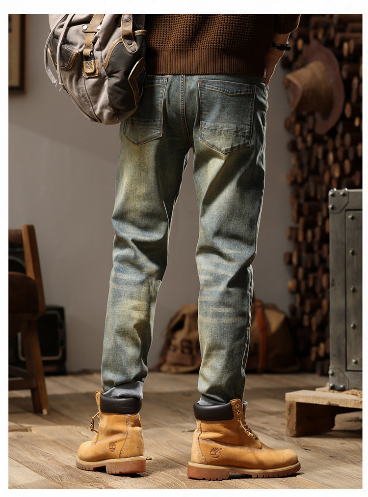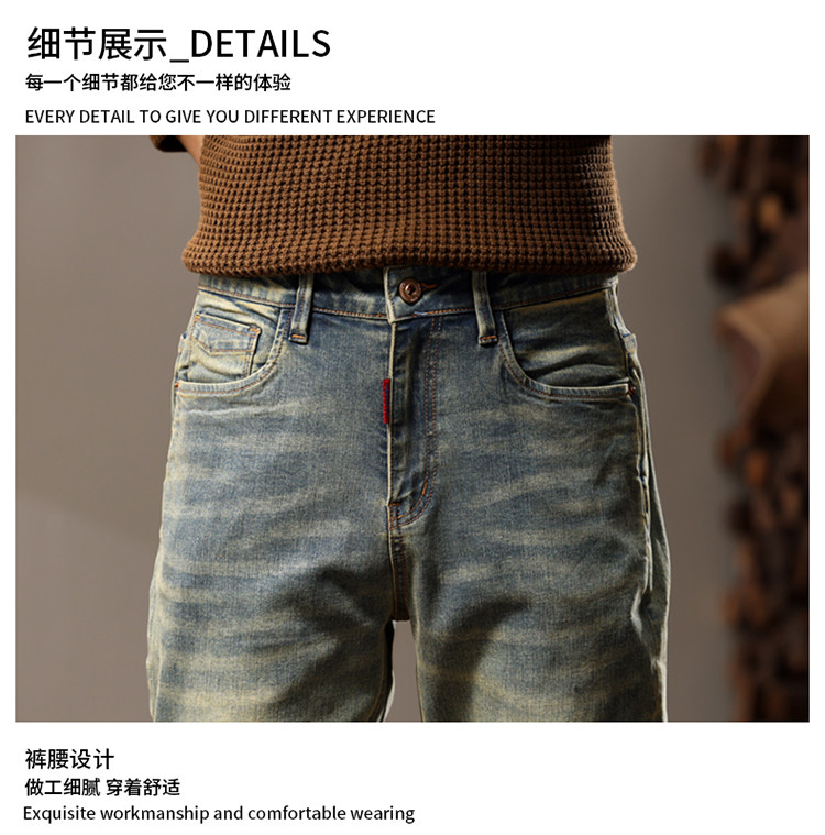 美式復古牛仔褲男彈力黃泥水洗胖子大碼修身直筒小腳加絨肥佬長褲