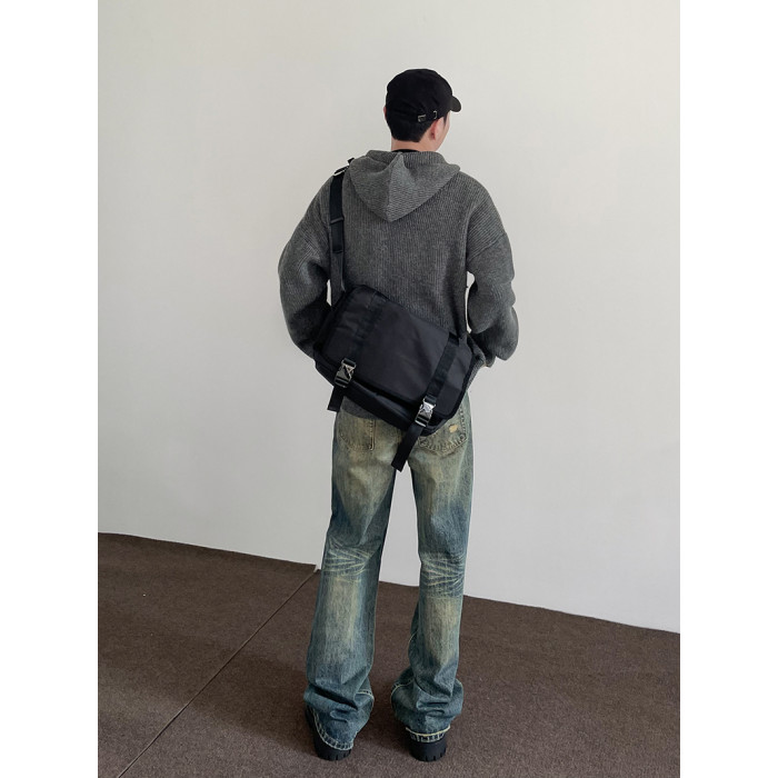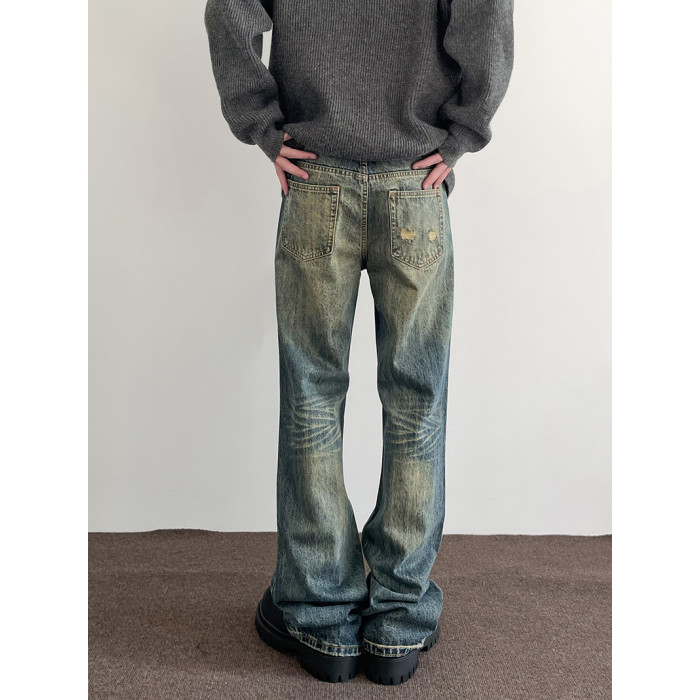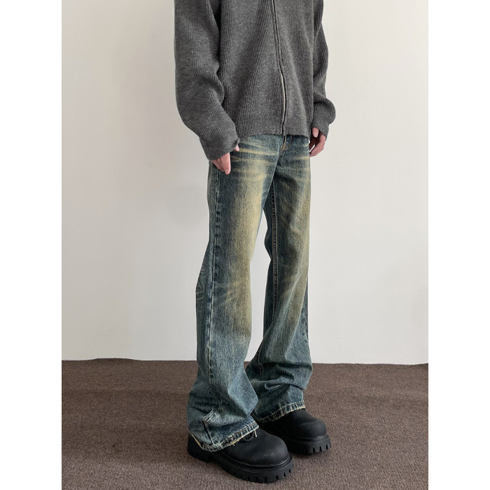 美式高街vibe復古水洗做舊牛仔褲男潮直筒微喇顯瘦cleanfit長褲子
