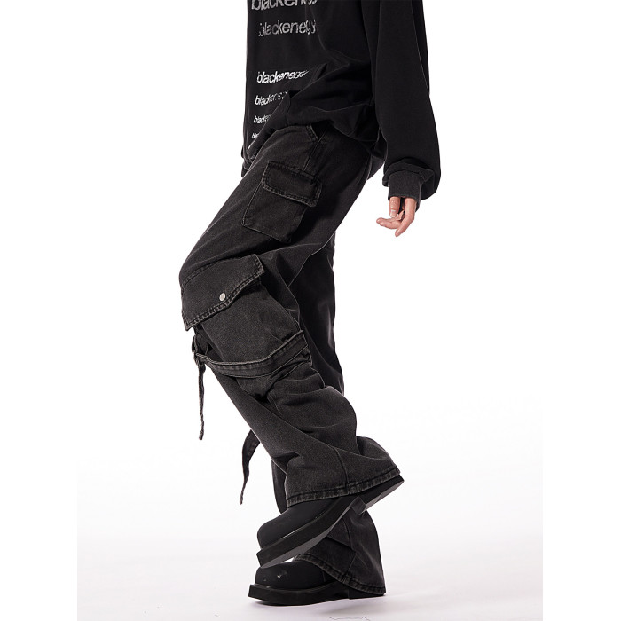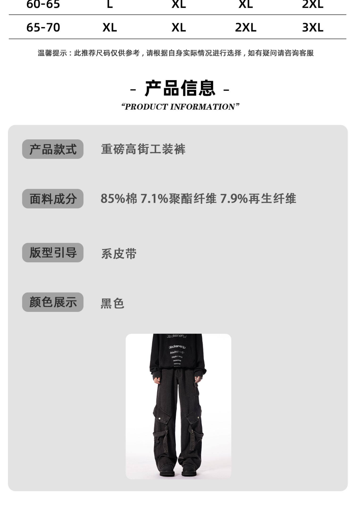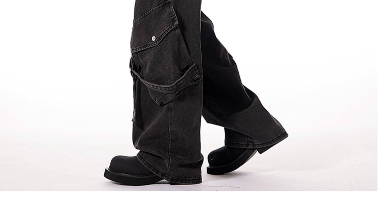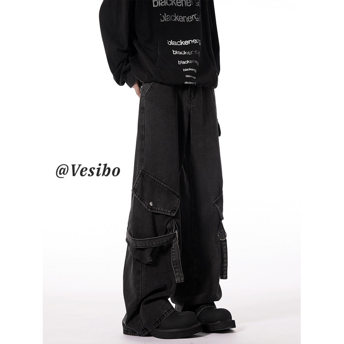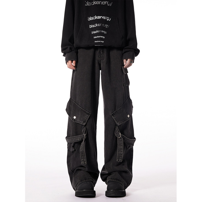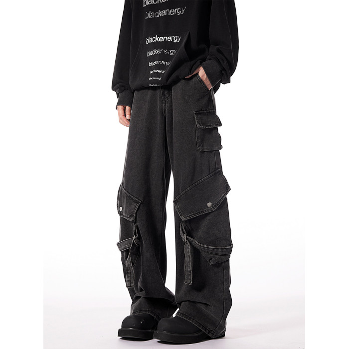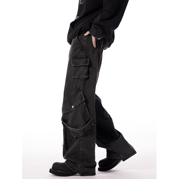 重磅黑色工裝牛仔褲男冬季美式高街痞帥濶腿褲復古做舊多口袋褲子